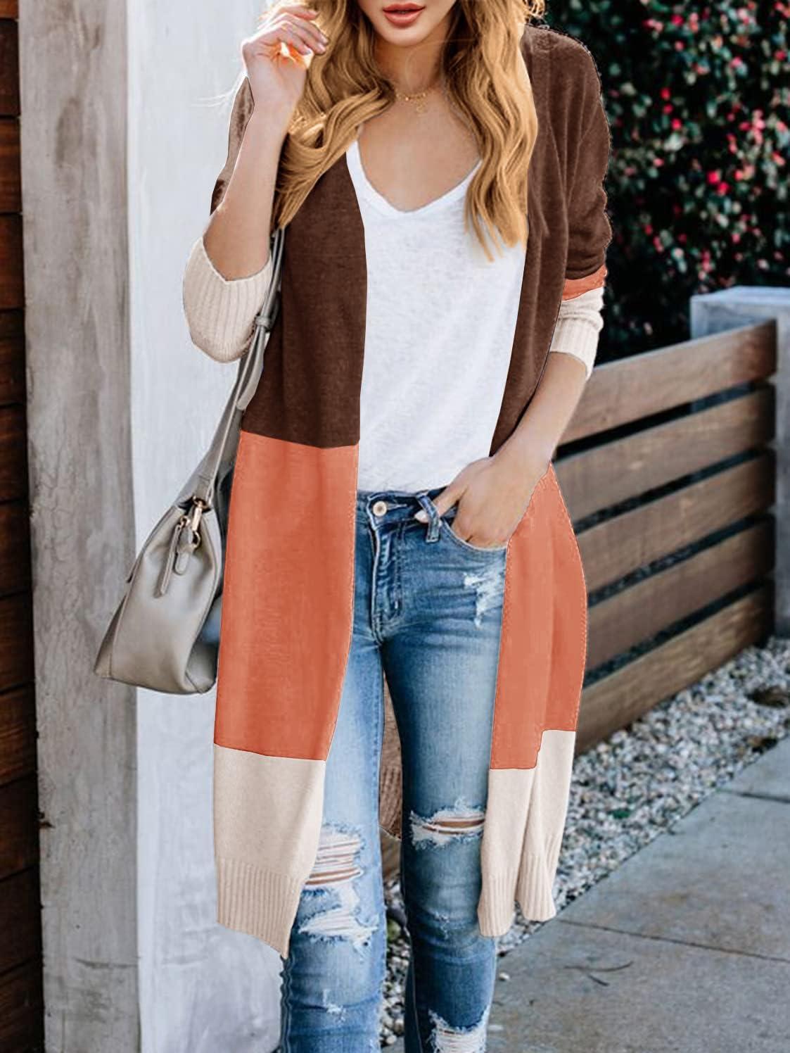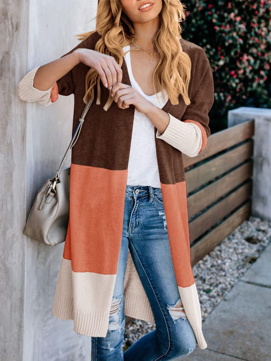 Lovaru Womens Boho Open Front Cardigan Colorblock Long Sleeve Loose Knit Lightweight Sweaters(Z-brown)