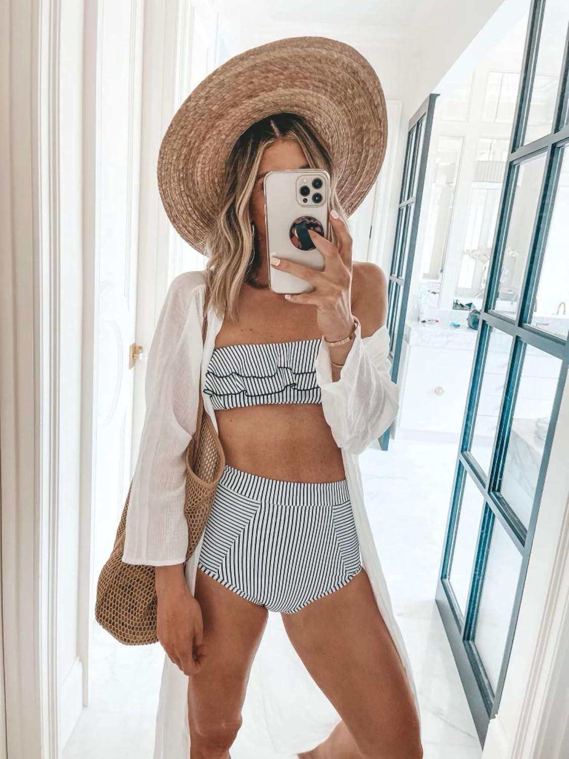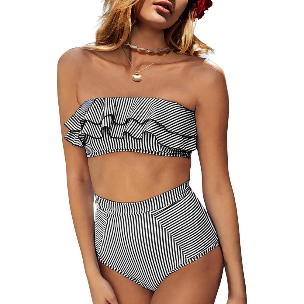 Saodimallsu Women High Waisted 2 Piece Bikini Set Bandeau Ruffle Swimsuit Top Striped Bathing Suits(Black)
