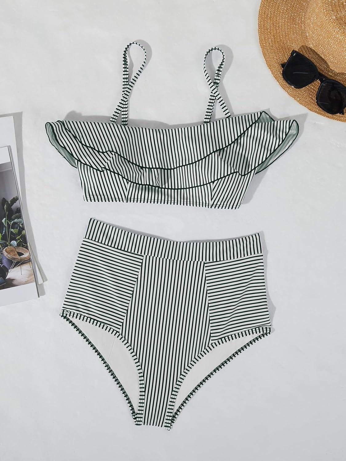 Saodimallsu Women High Waisted 2 Piece Bikini Set Bandeau Ruffle Swimsuit Top Striped Bathing Suits(Green)