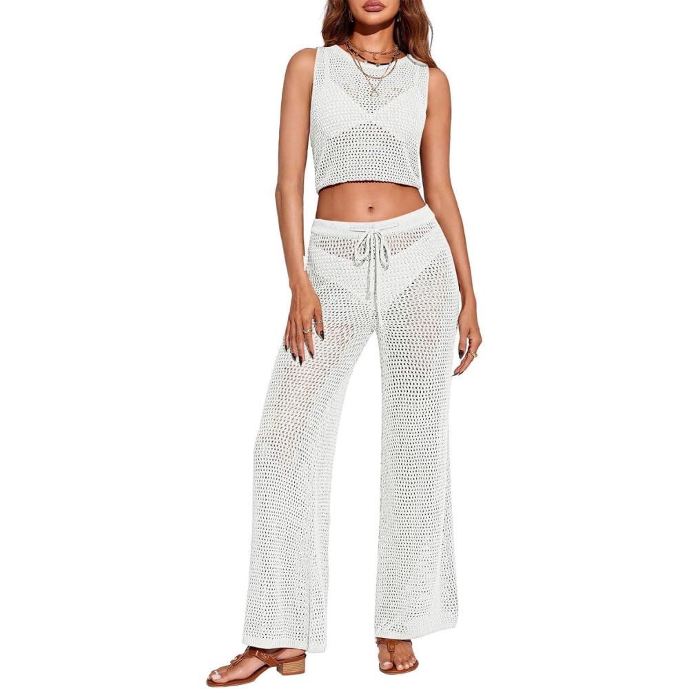 Saodimallsu Womens 2 Piece Crochet Swimsuit Cover Up Sleeveless Crop Top Drawstring Long Pants Set Beach Outfits(White)