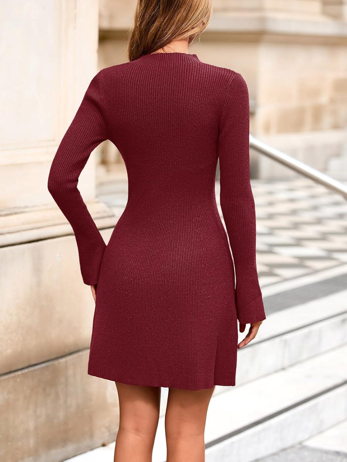 Saodimallsu Womens A Line Mini Sweater Dress Long Sleeve Bodycon Ribbed Knit Mock Neck Fall Short Dresses(Burgundy)