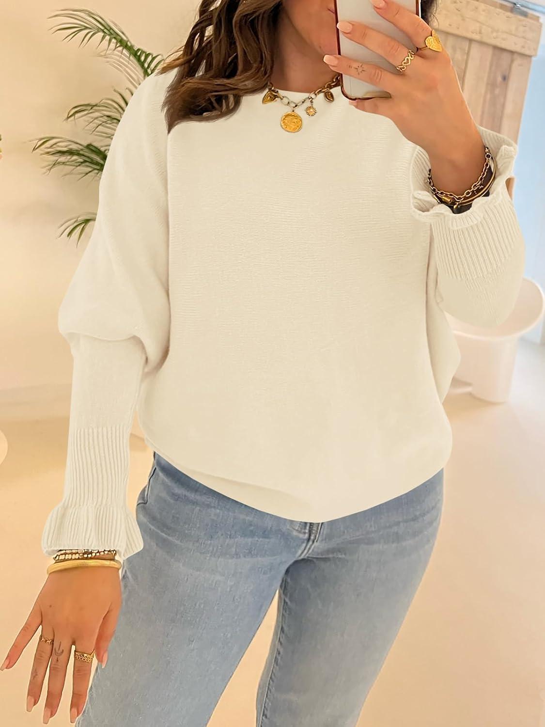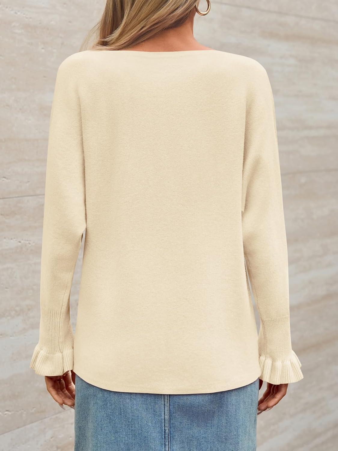 Saodimallsu Womens Boat Neck Batwing Sweaters Dolman Ruffle Long Sleeve Off Shoulder Fall Loose Knit Pullover Tops(Beige)