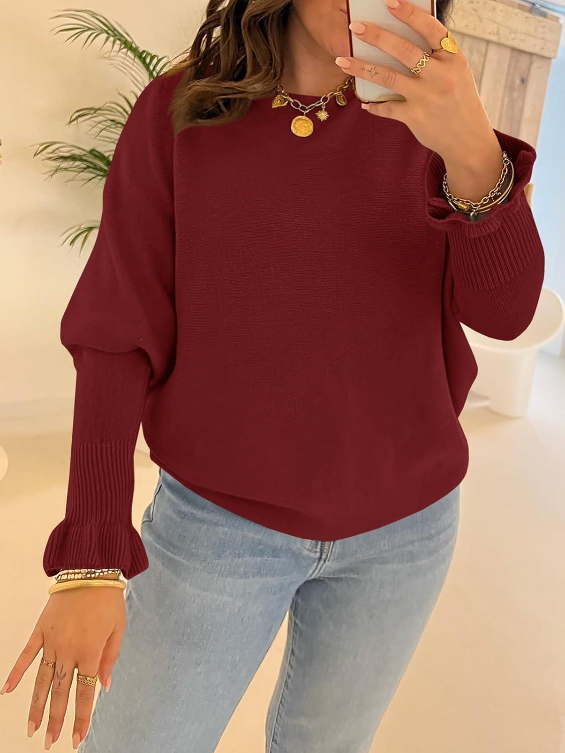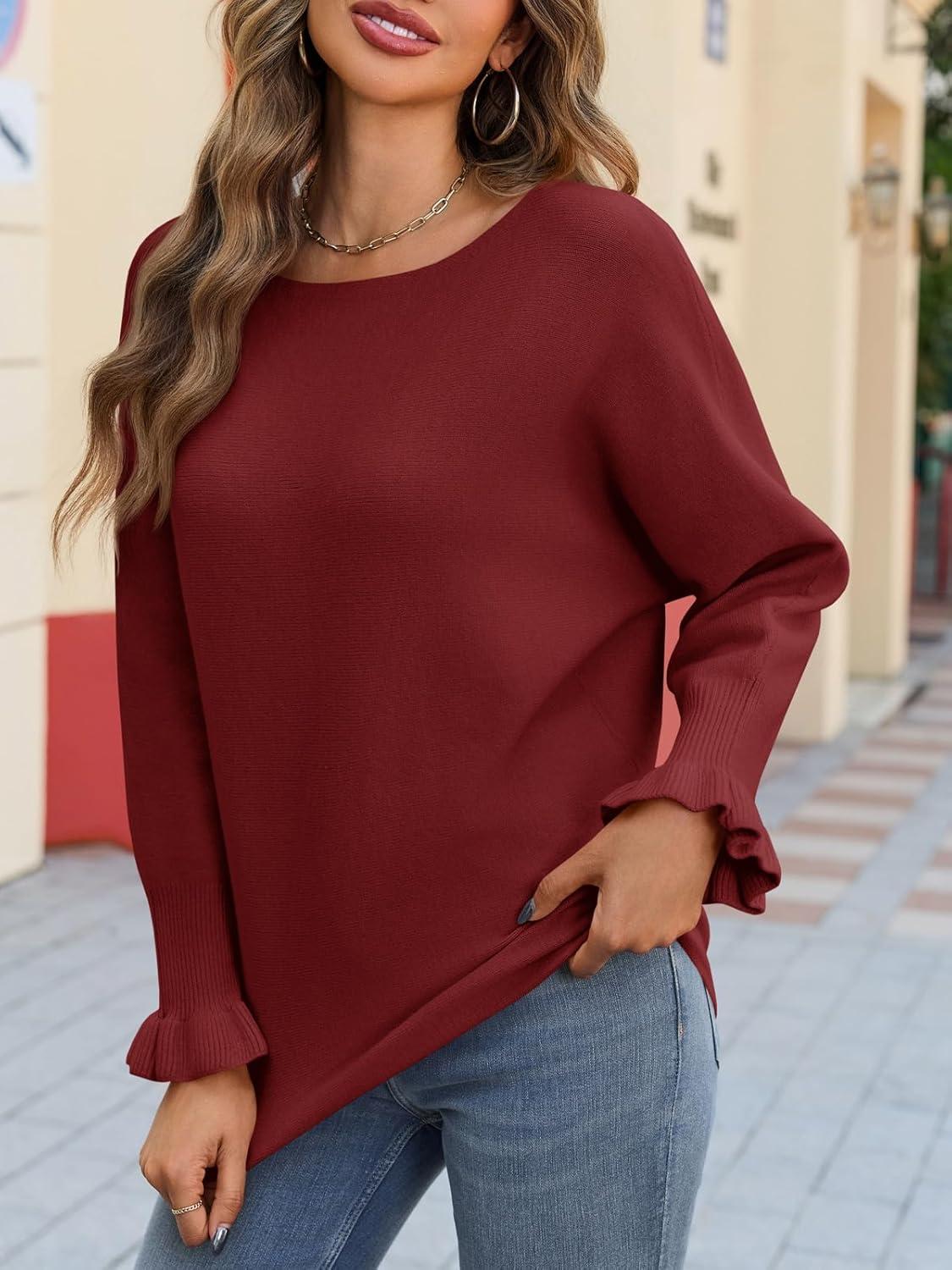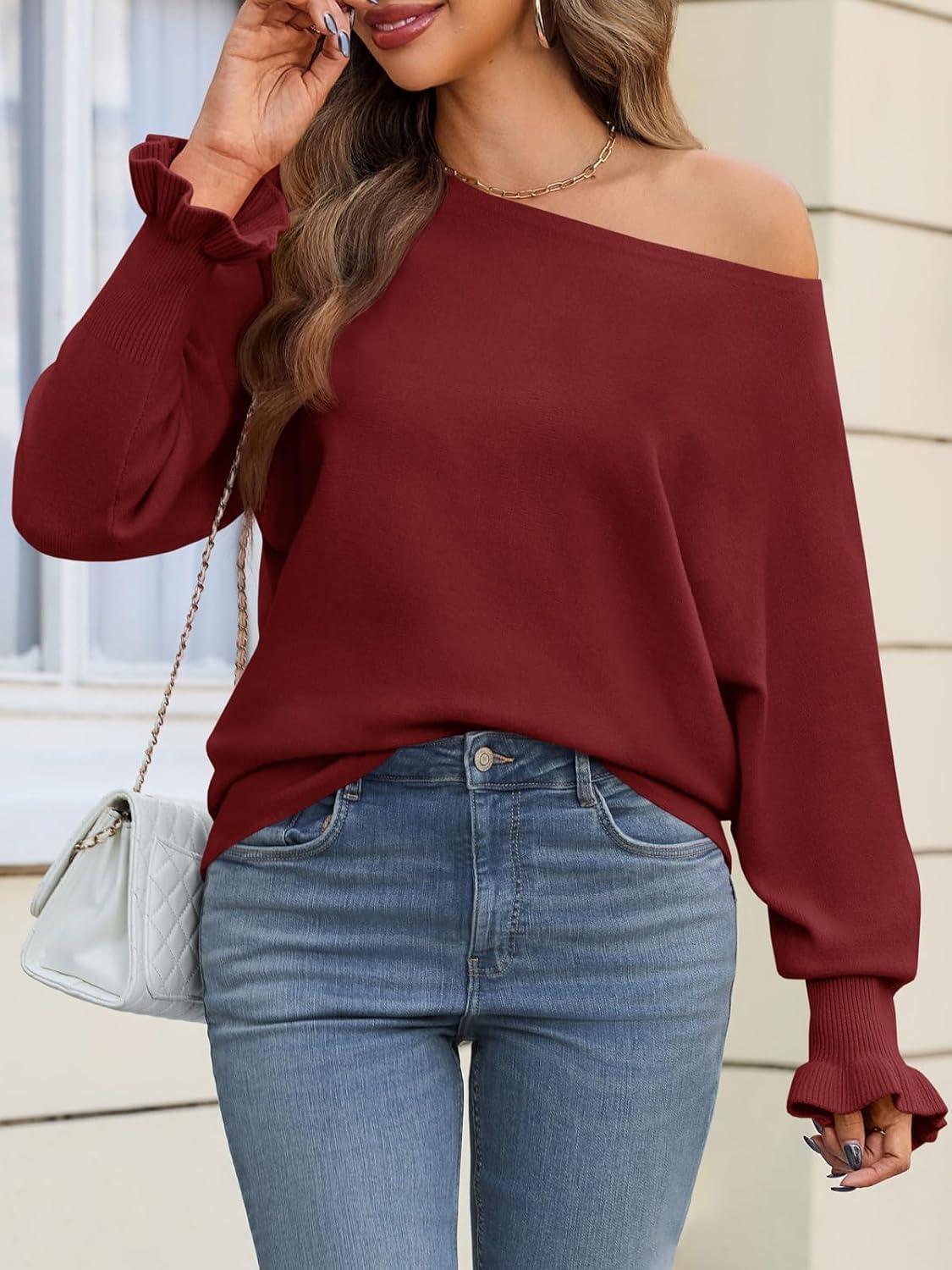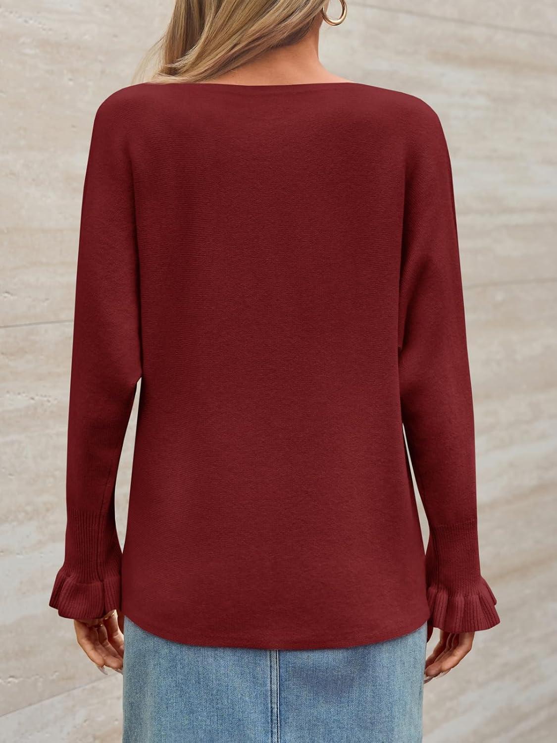 Saodimallsu Womens Boat Neck Batwing Sweaters Dolman Ruffle Long Sleeve Off Shoulder Fall Loose Knit Pullover Tops(Burgundy)