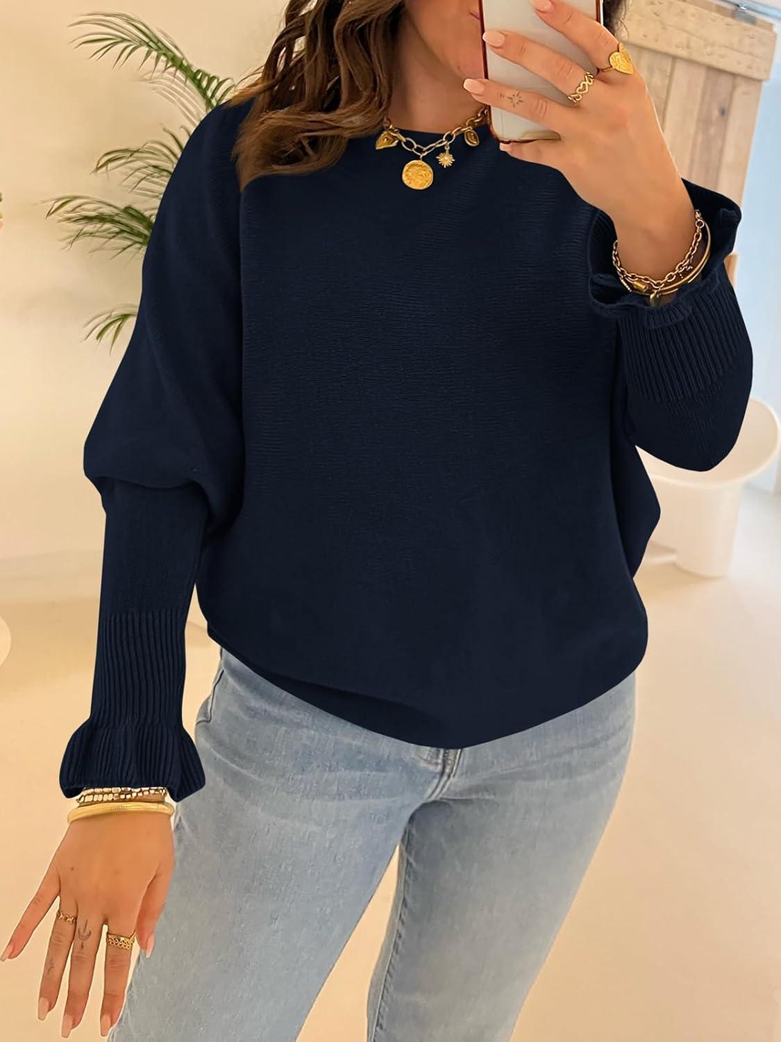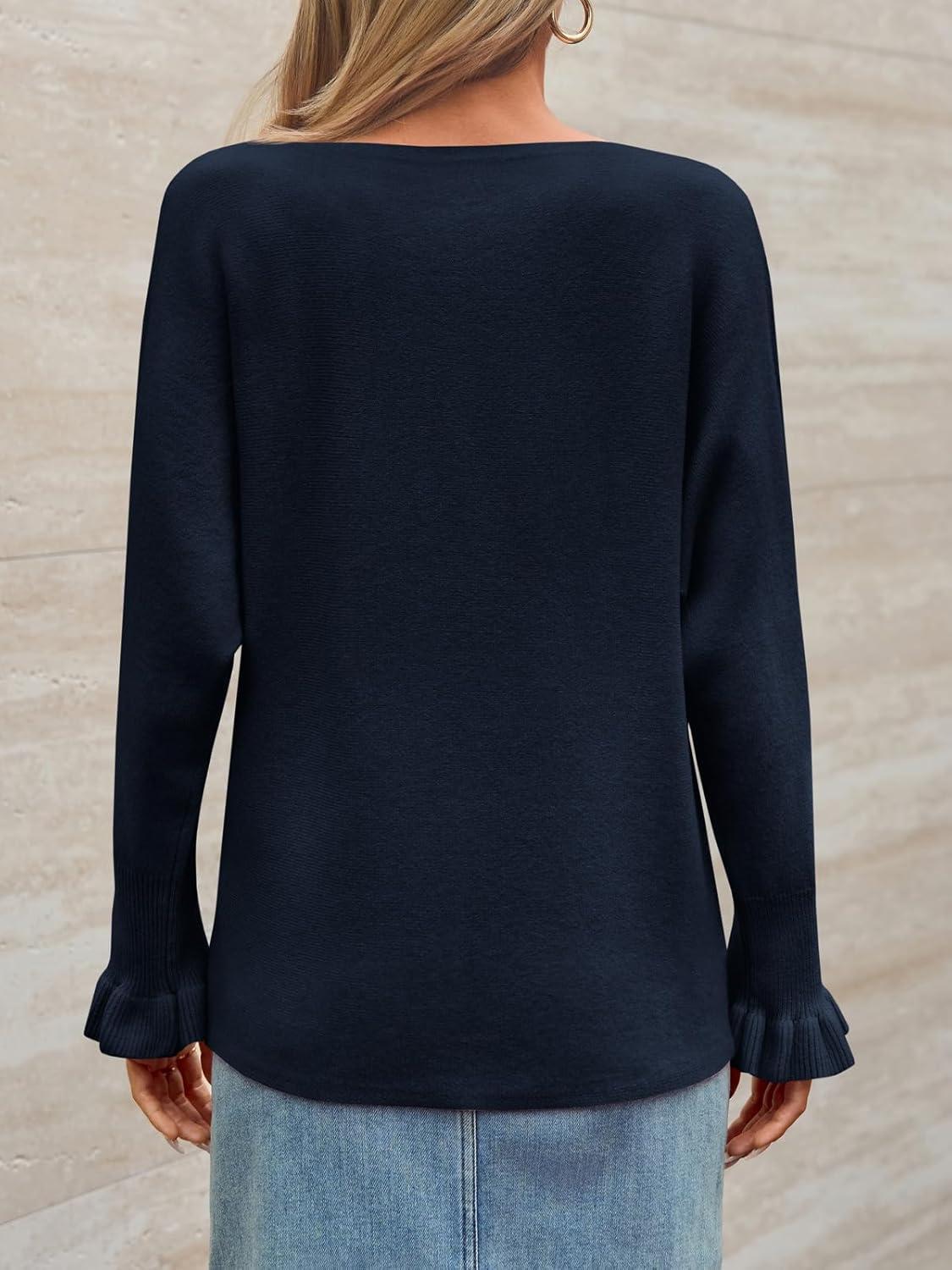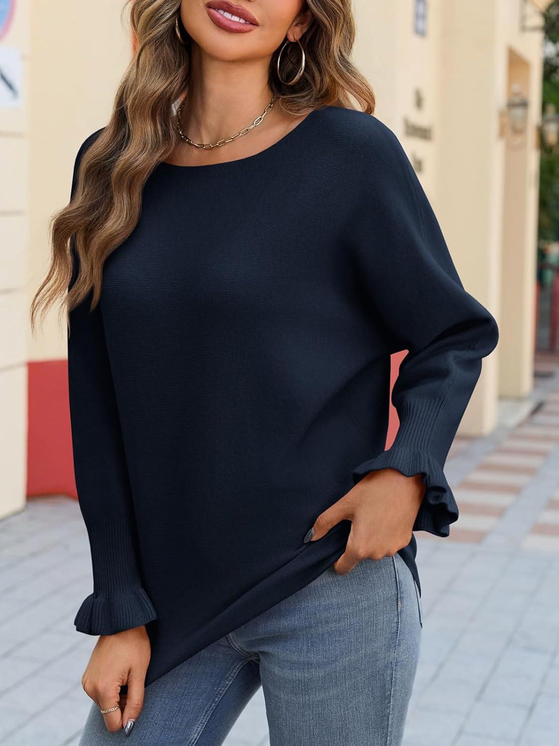 Saodimallsu Womens Boat Neck Batwing Sweaters Dolman Ruffle Long Sleeve Off Shoulder Fall Loose Knit Pullover Tops(Navy Blue)