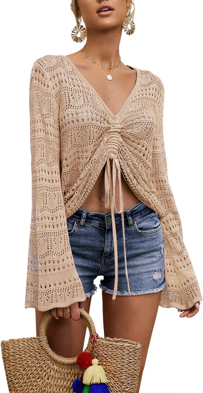 Saodimallsu Womens Boho Off Shoulder Sheer Crop Tops Bell Sleeve Flowy Oversized Crochet Ruched Pullover Sweaters(Apricot)