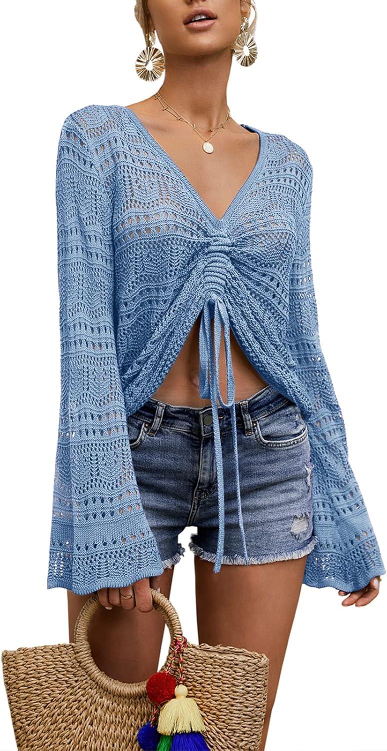 Saodimallsu Womens Boho Off Shoulder Sheer Crop Tops Bell Sleeve Flowy Oversized Crochet Ruched Pullover Sweaters(Blue)