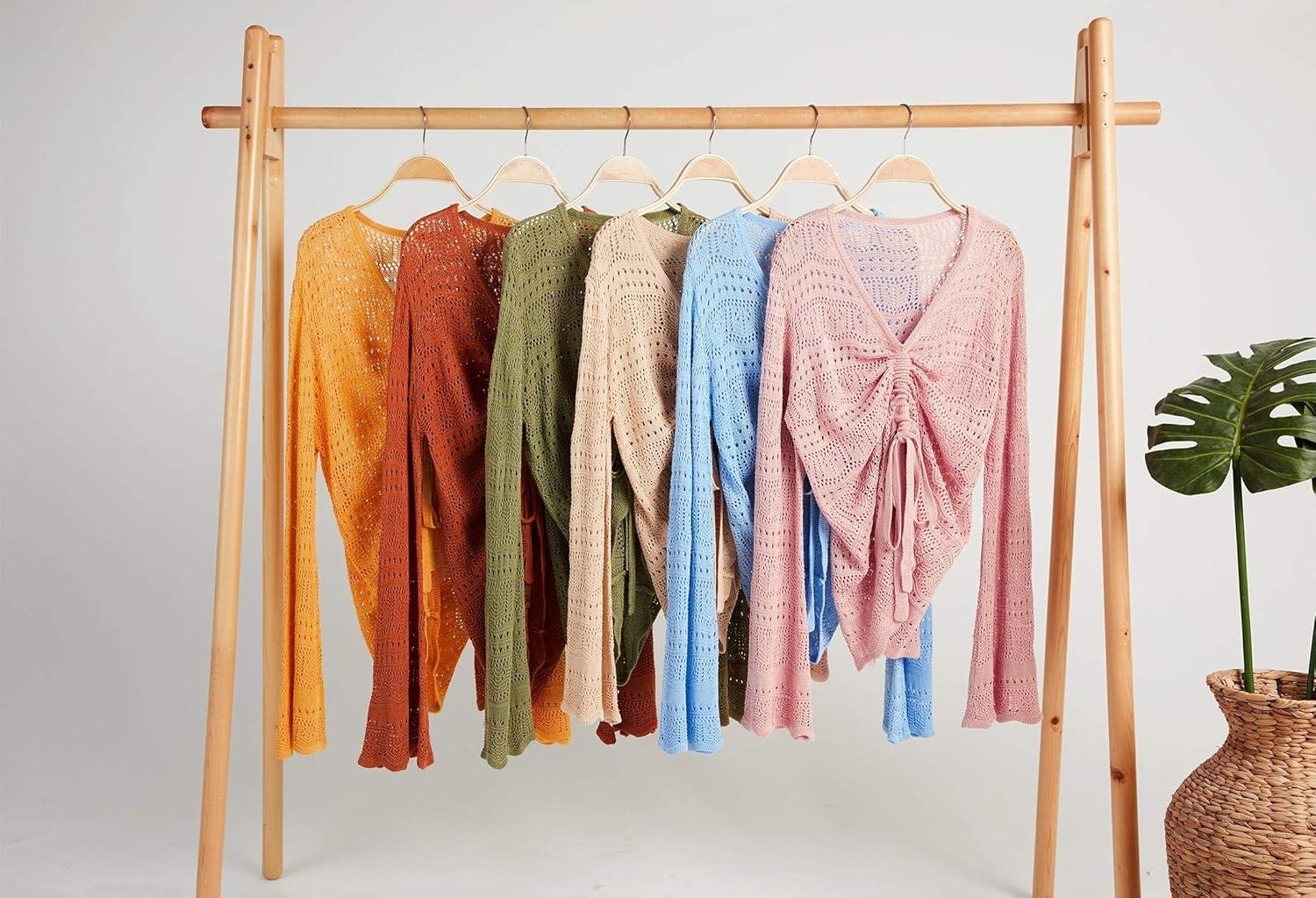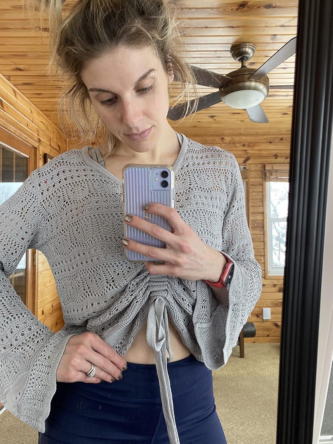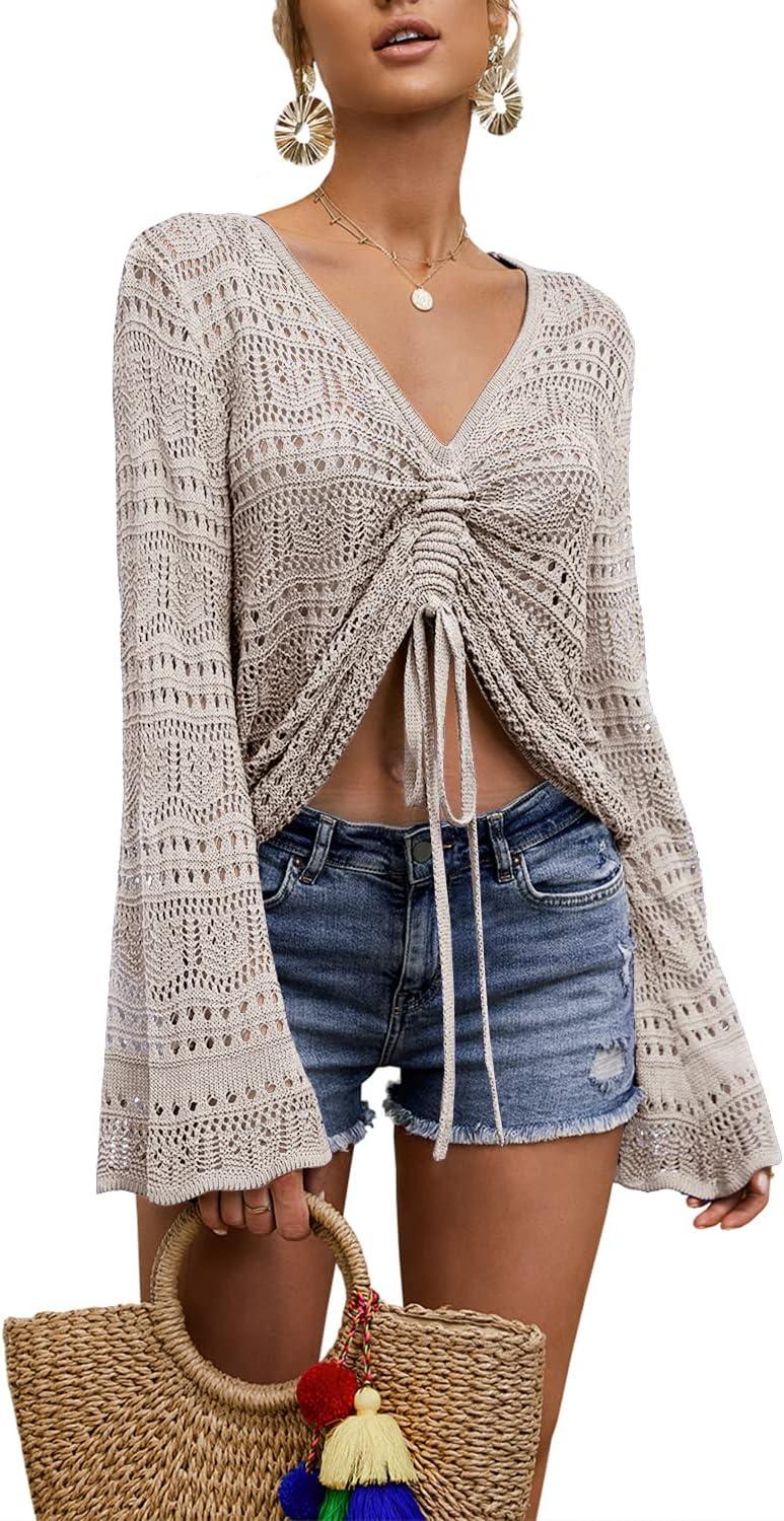 Saodimallsu Womens Boho Off Shoulder Sheer Crop Tops Bell Sleeve Flowy Oversized Crochet Ruched Pullover Sweaters(Grey)