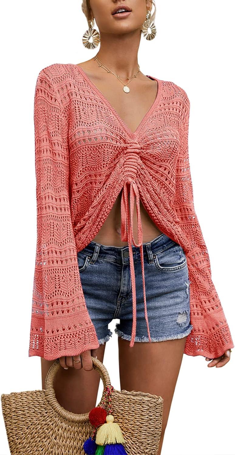 Saodimallsu Womens Boho Off Shoulder Sheer Crop Tops Bell Sleeve Flowy Oversized Crochet Ruched Pullover Sweaters(Red)