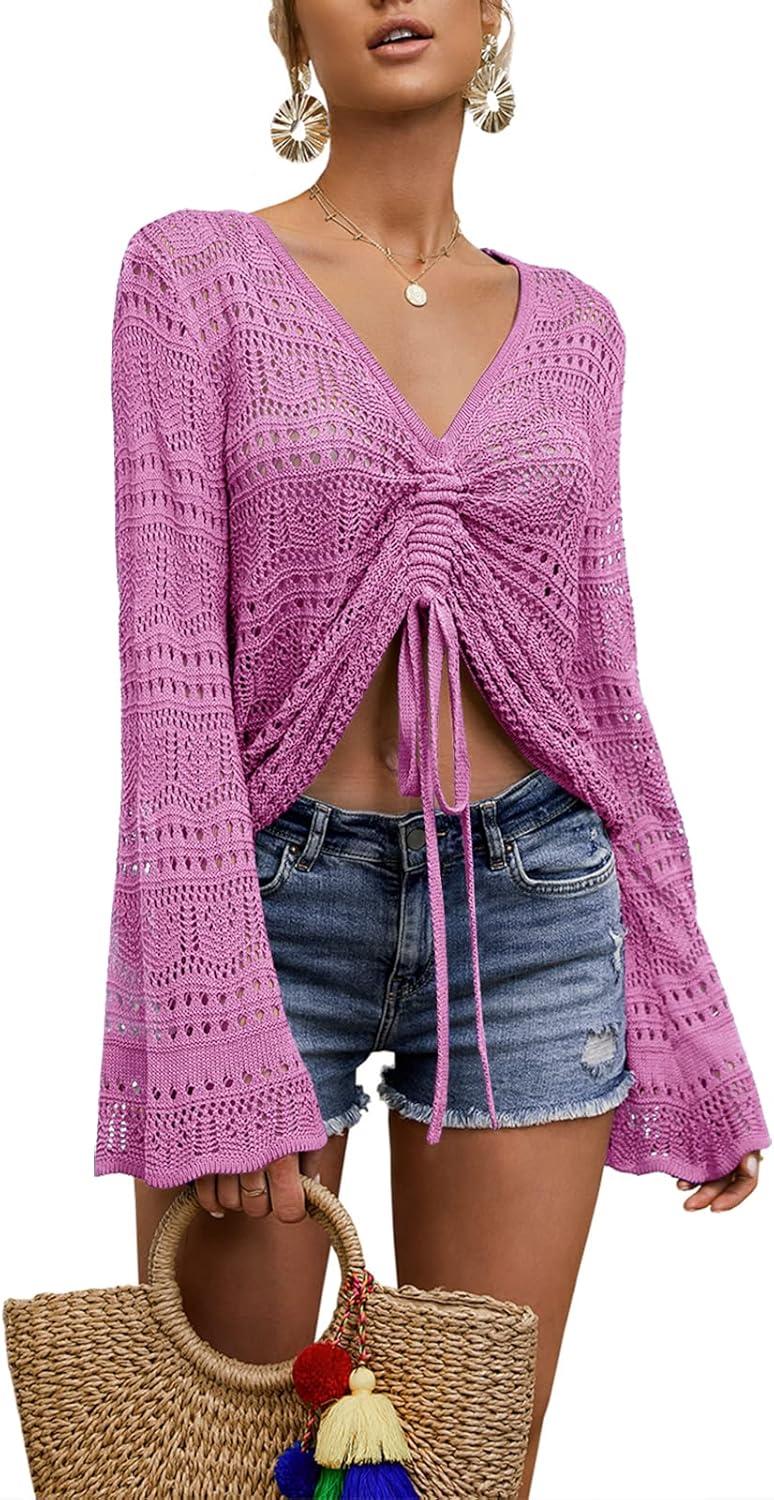 Saodimallsu Womens Boho Off Shoulder Sheer Crop Tops Bell Sleeve Flowy Oversized Crochet Ruched Pullover Sweaters(Rose)