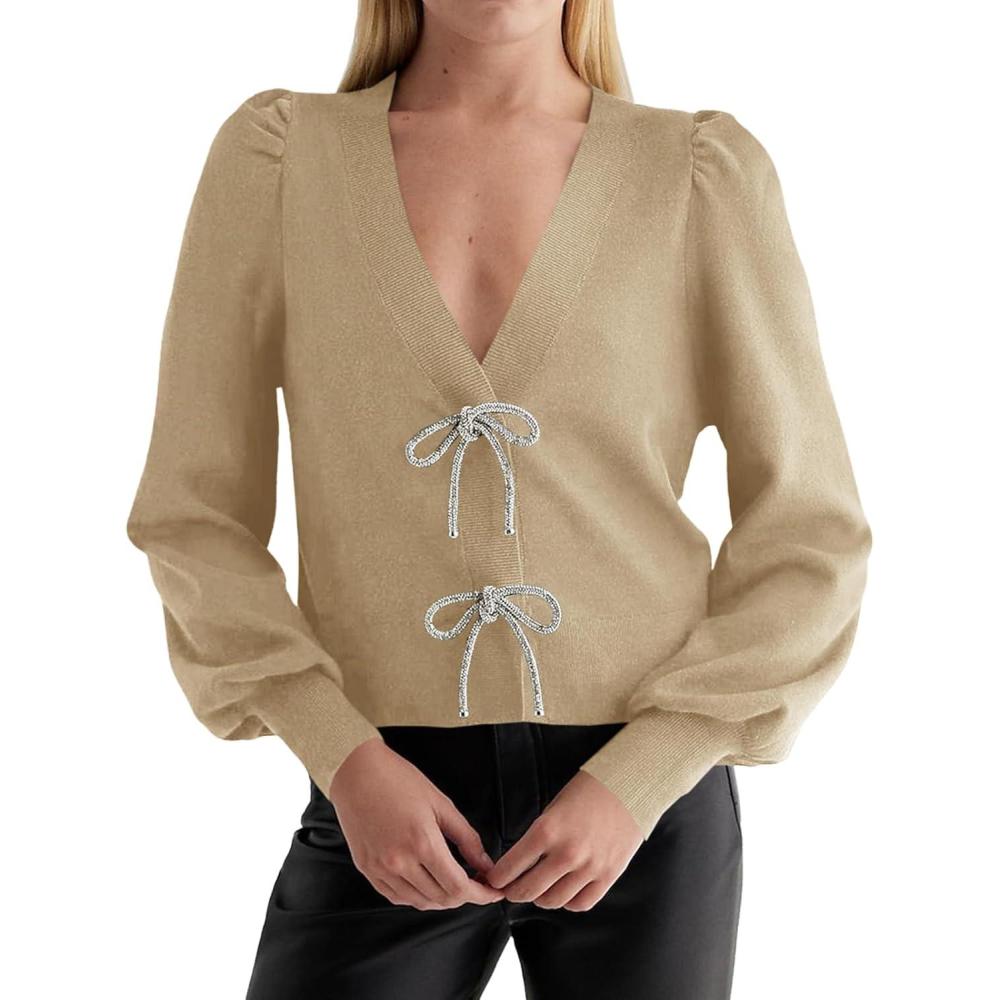 Saodimallsu Womens Bow Button Front Cardigan Sweaters V Neck Cropped Knit Sweater(Khaki)