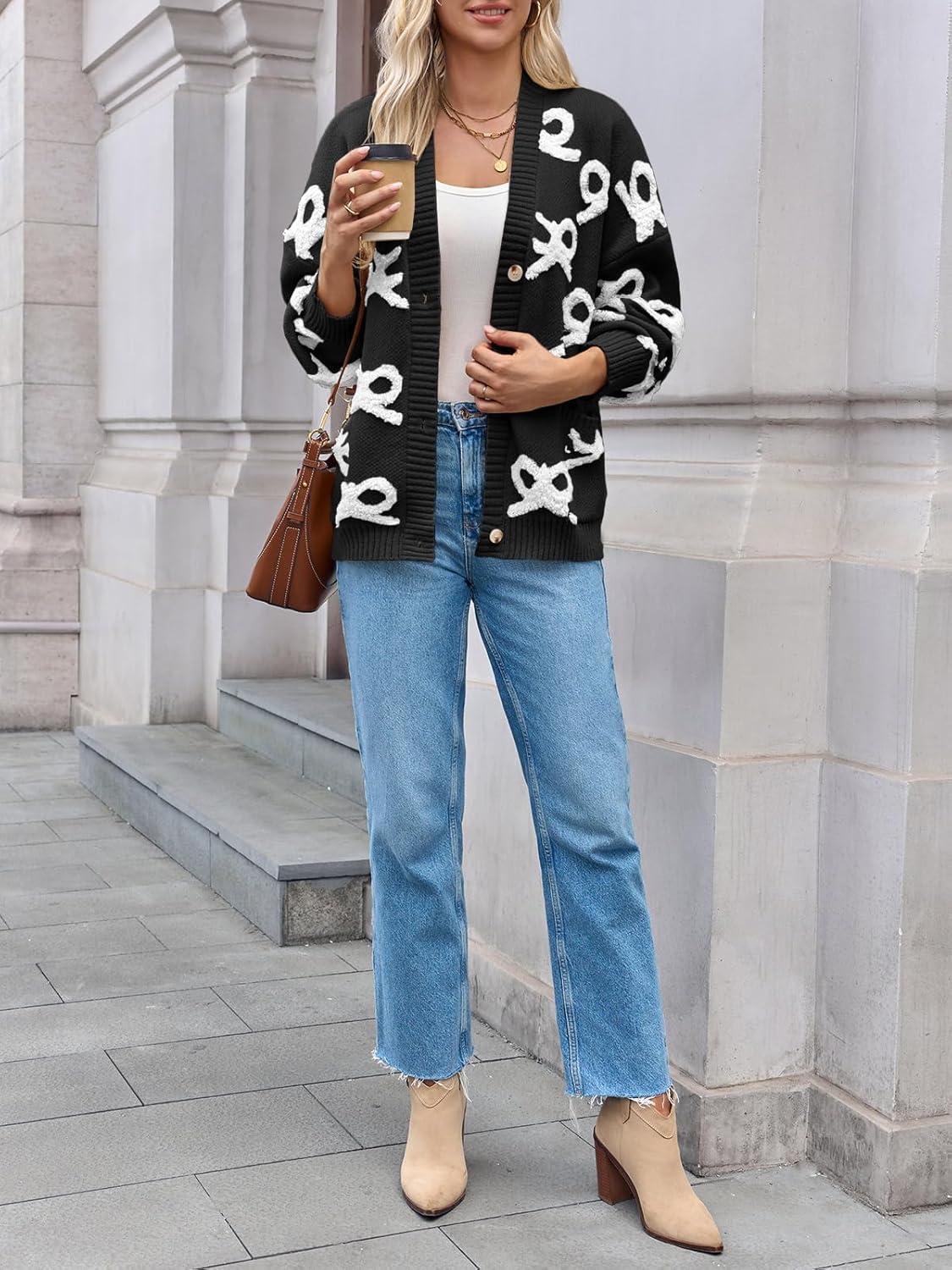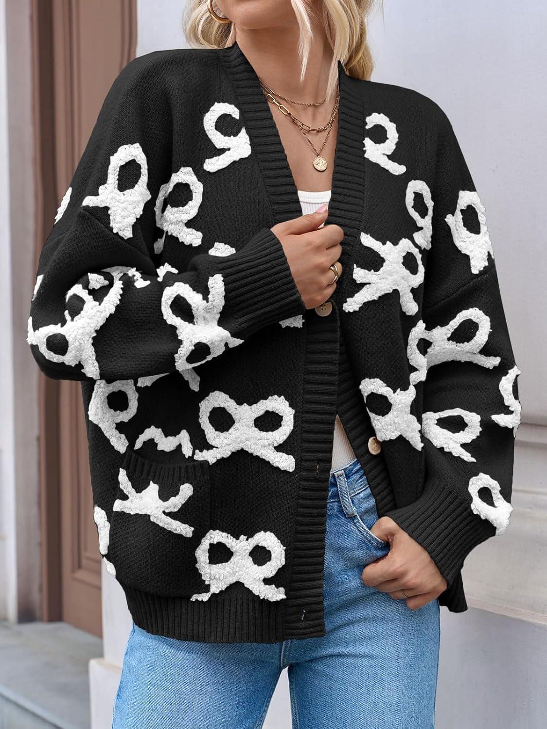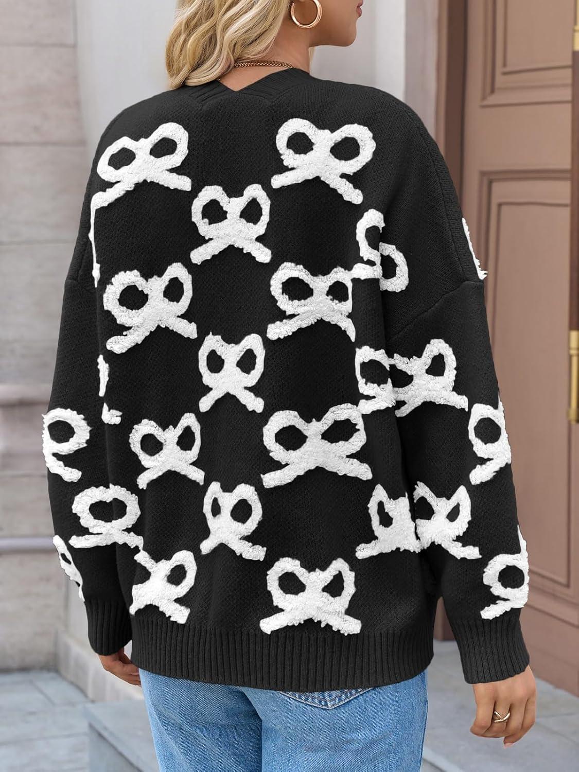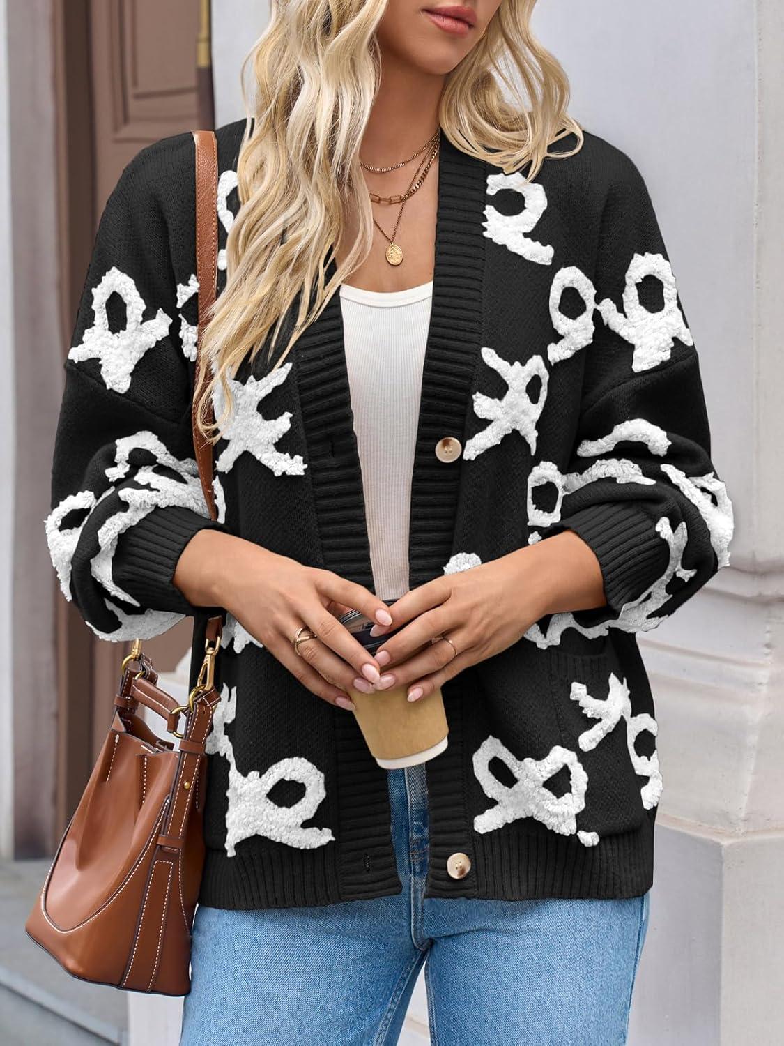Saodimallsu Womens Bow Cardigan Sweaters Button Up Chunky Knit Loose Fit Fall Winter Sweater Coats with Pockets(Black)