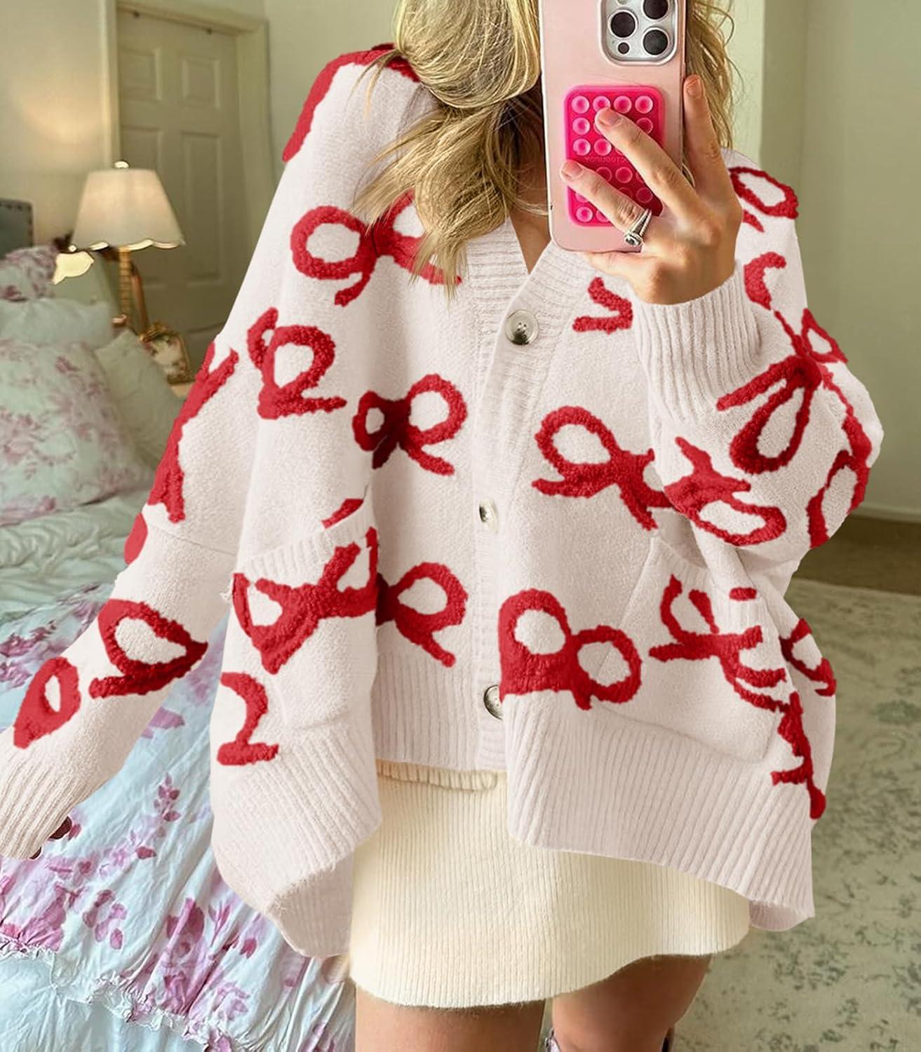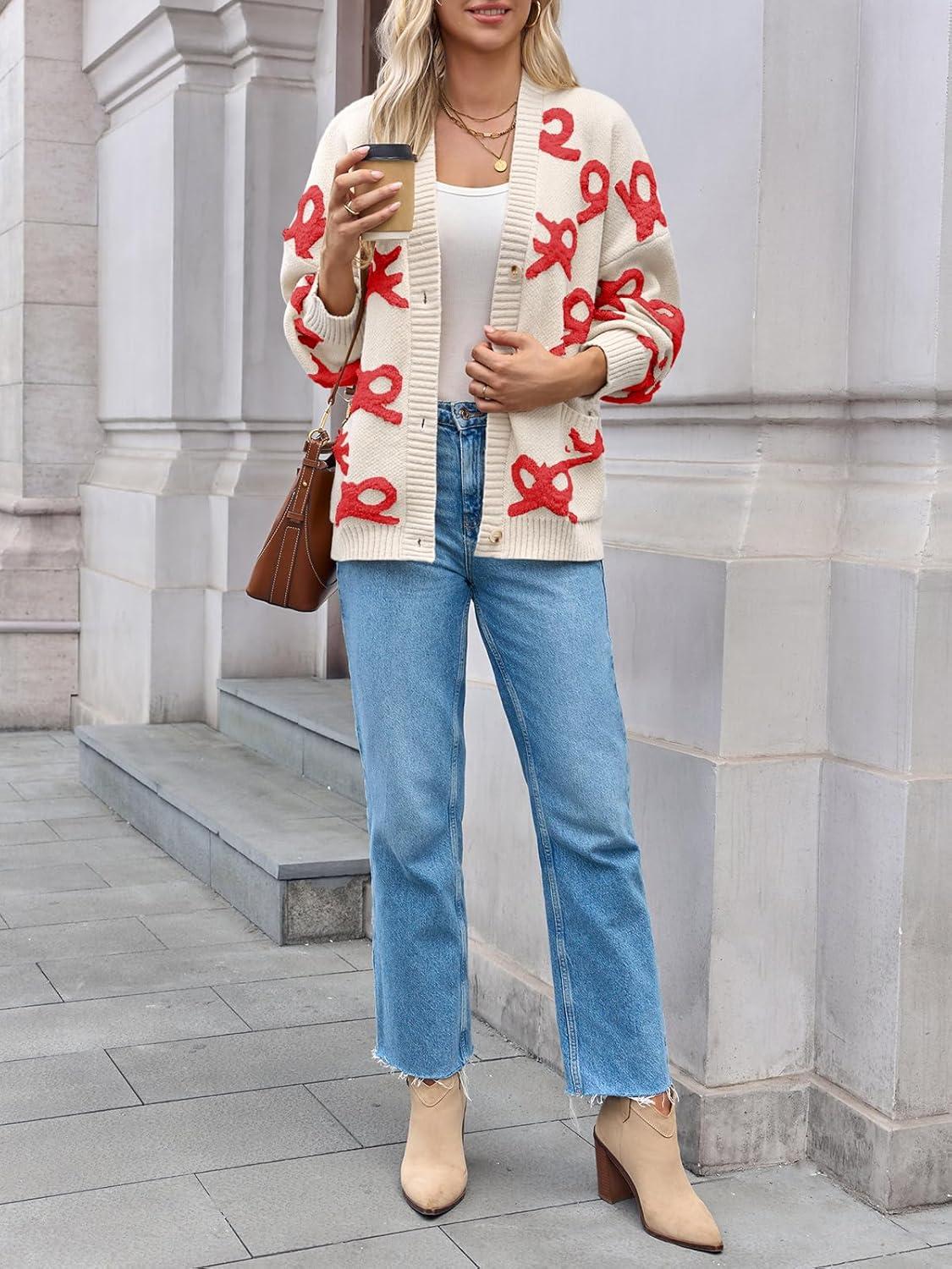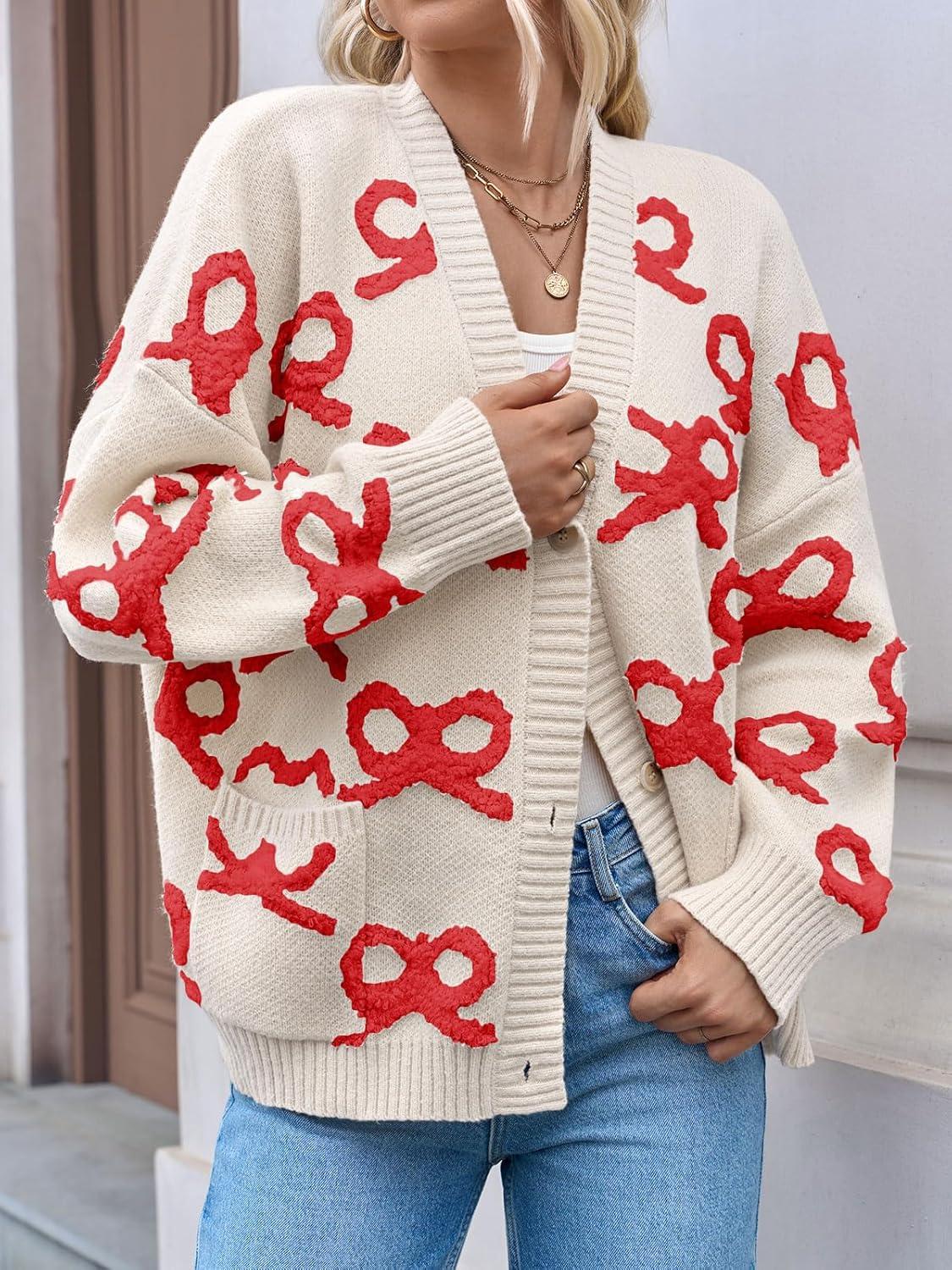 Saodimallsu Womens Bow Cardigan Sweaters Button Up Chunky Knit Loose Fit Fall Winter Sweater Coats with Pockets(Red)