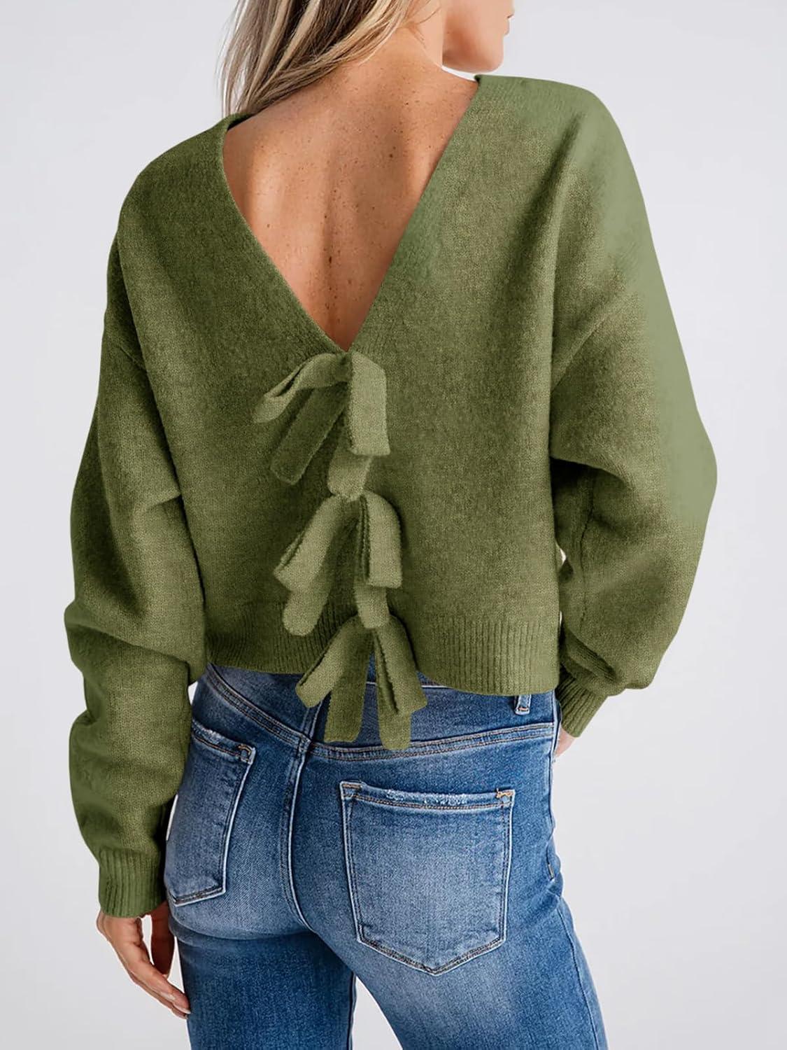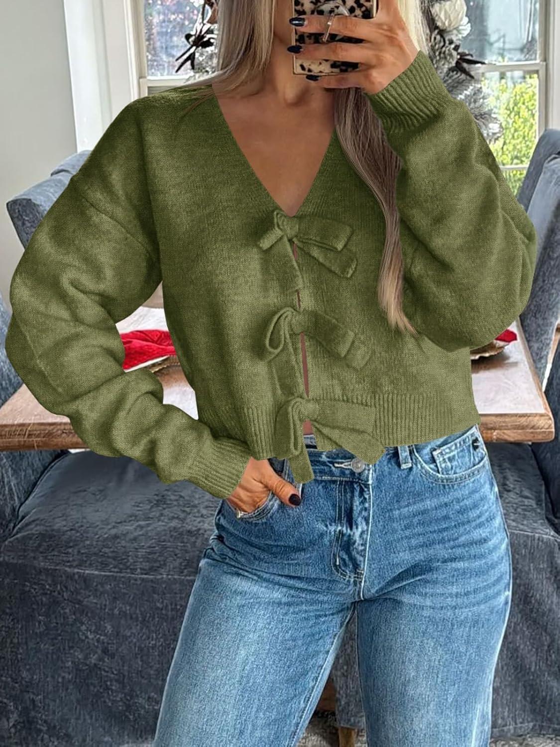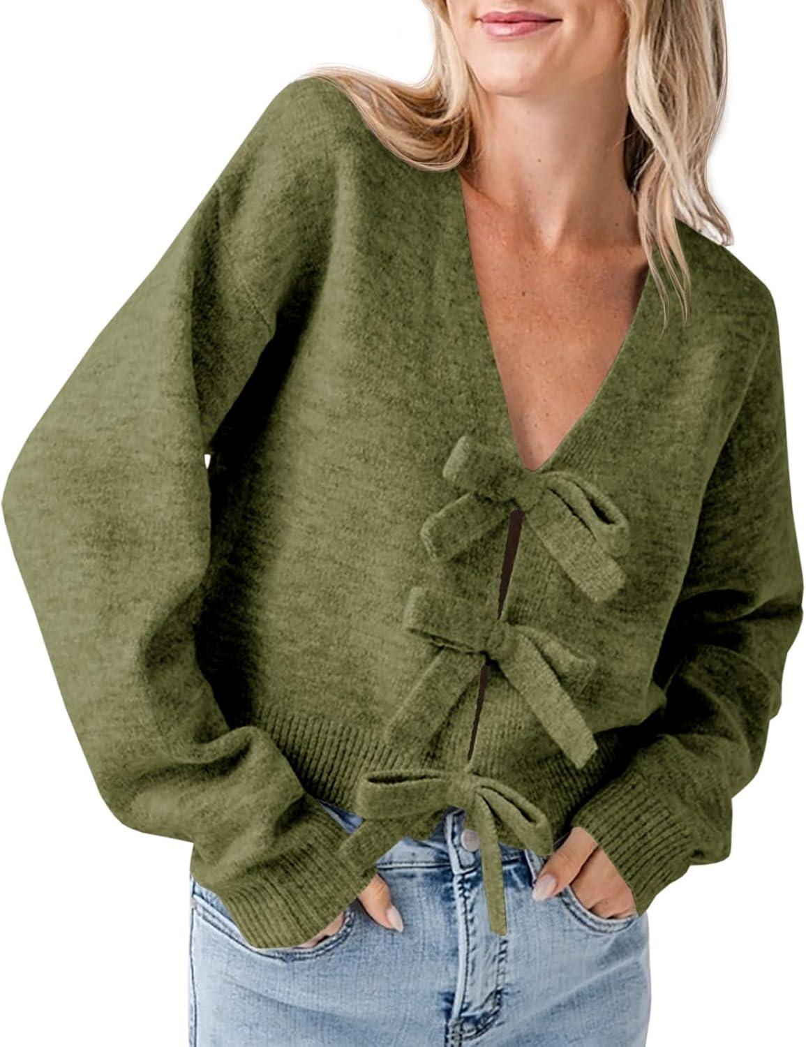 Saodimallsu Womens Bow Sweater Cropped V Neck Long Sleeve Fall Cozy Knit Loose Trendy Pullover Sweaters(Army Green)