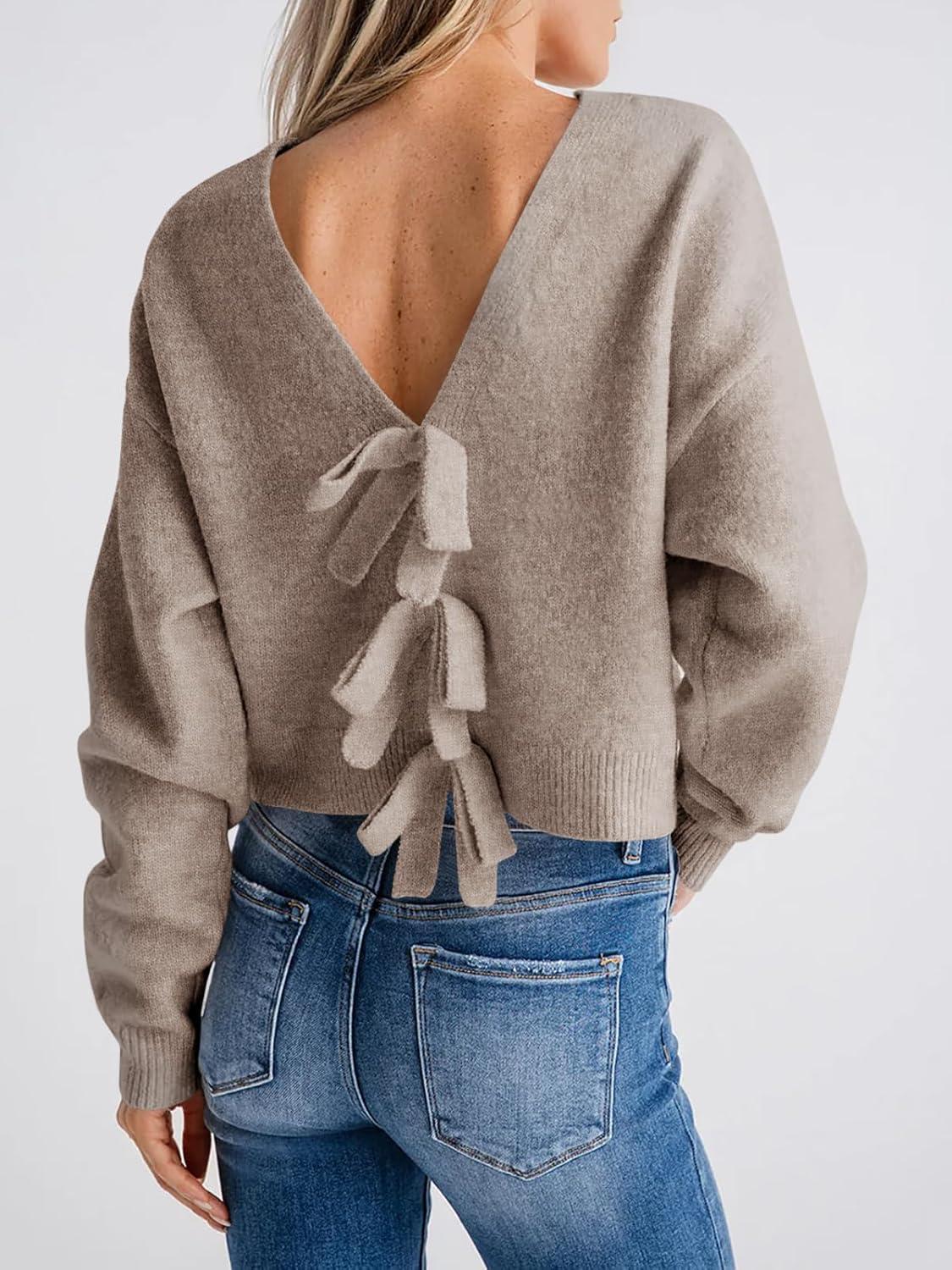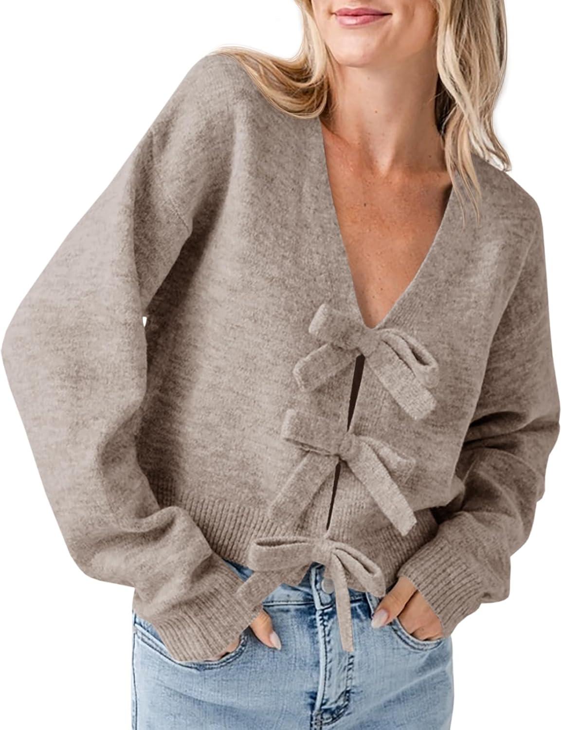 Saodimallsu Womens Bow Sweater Cropped V Neck Long Sleeve Fall Cozy Knit Loose Trendy Pullover Sweaters(Brown)