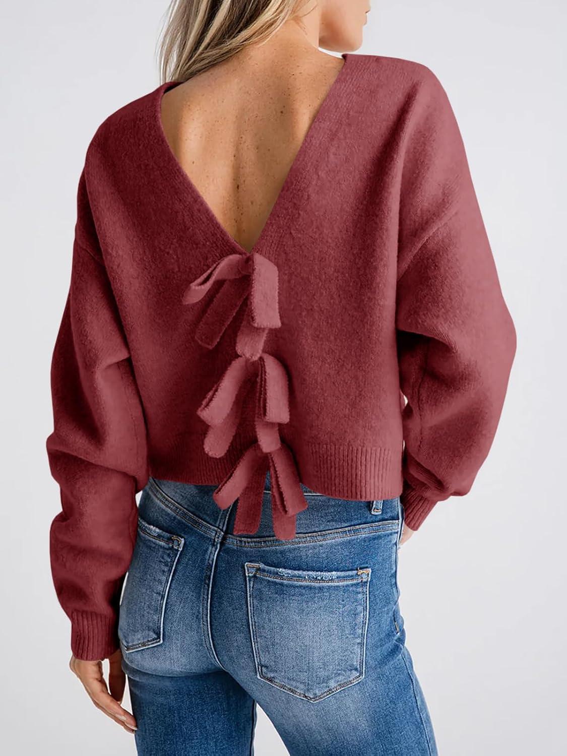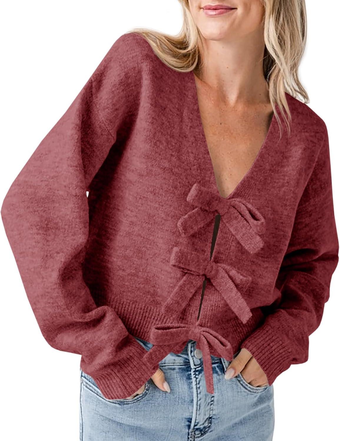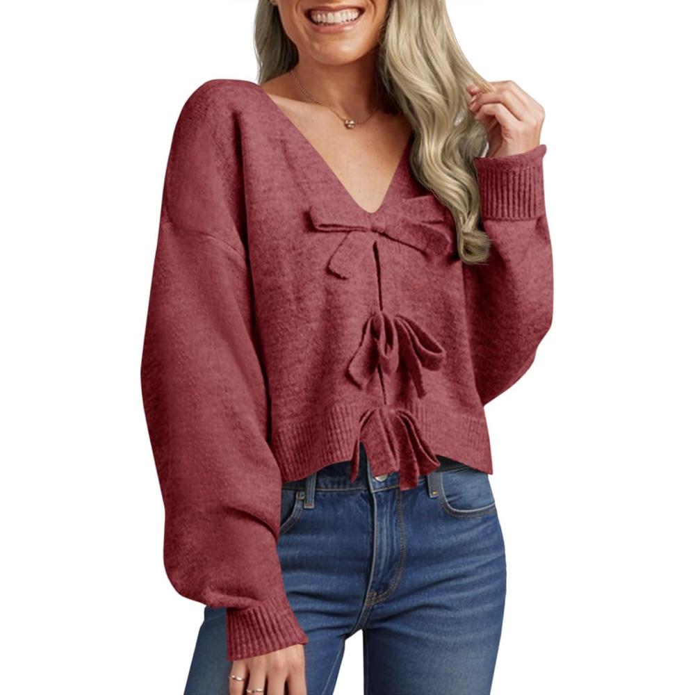 Saodimallsu Womens Bow Sweater Cropped V Neck Long Sleeve Fall Cozy Knit Loose Trendy Pullover Sweaters(Burgundy)