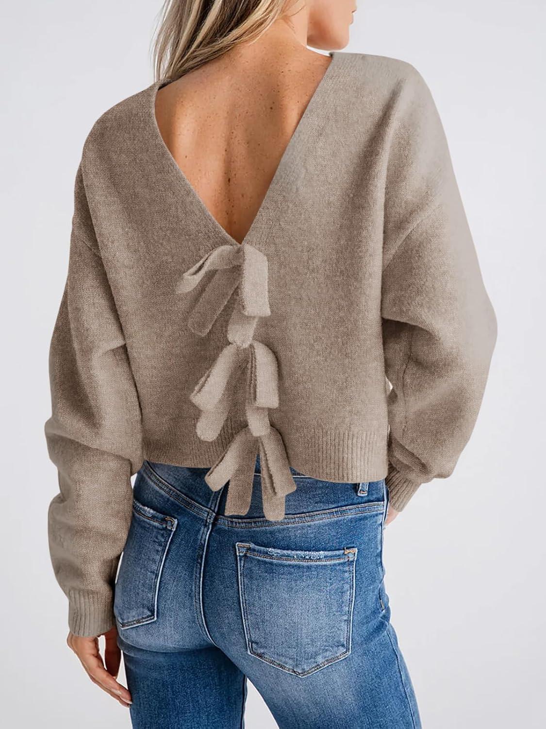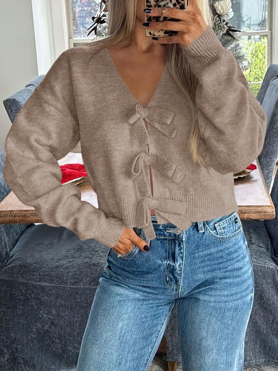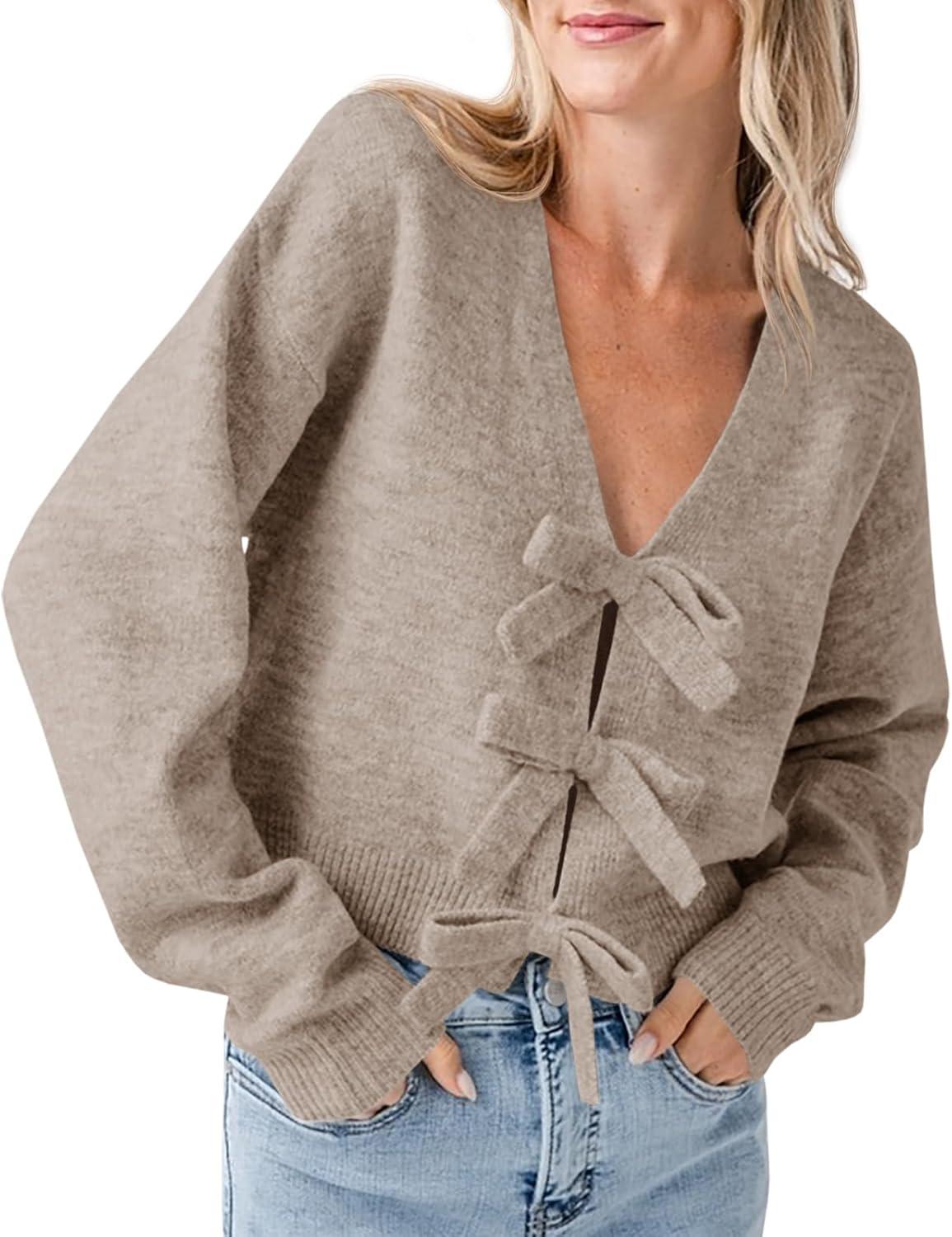 Saodimallsu Womens Bow Sweater Cropped V Neck Long Sleeve Fall Cozy Knit Loose Trendy Pullover Sweaters(Dark Apricot)
