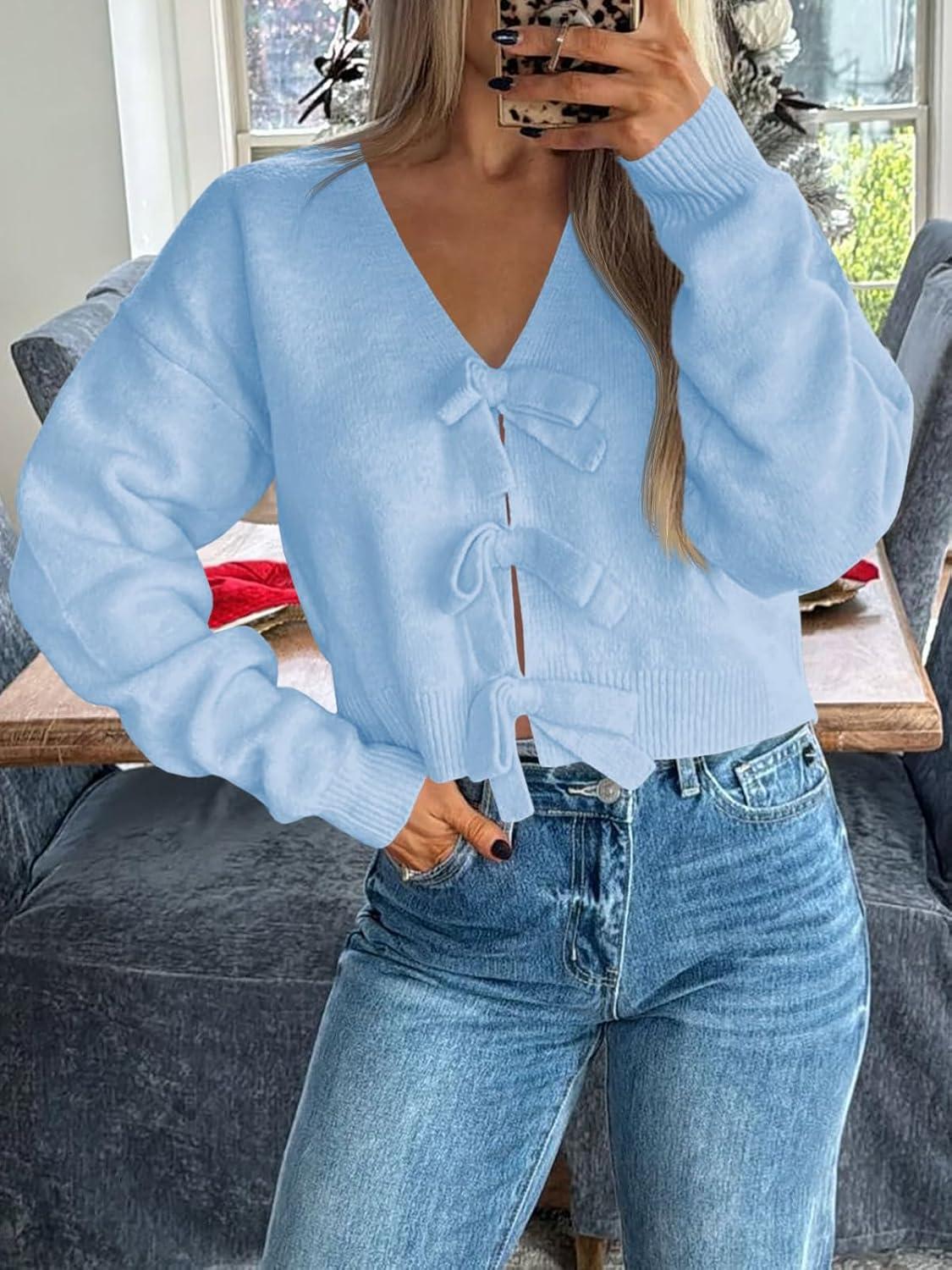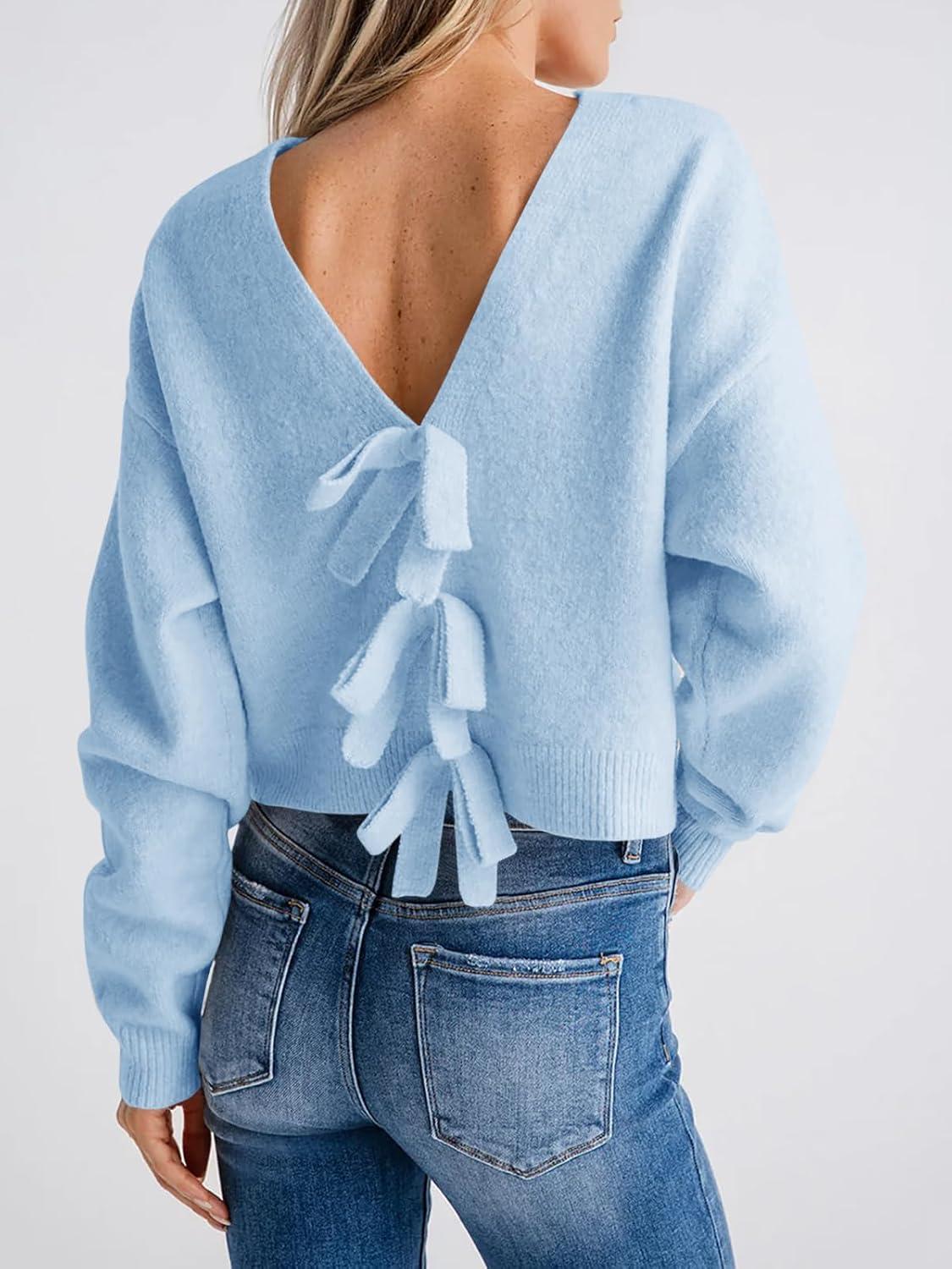 Saodimallsu Womens Bow Sweater Cropped V Neck Long Sleeve Fall Cozy Knit Loose Trendy Pullover Sweaters(Sky Blue)
