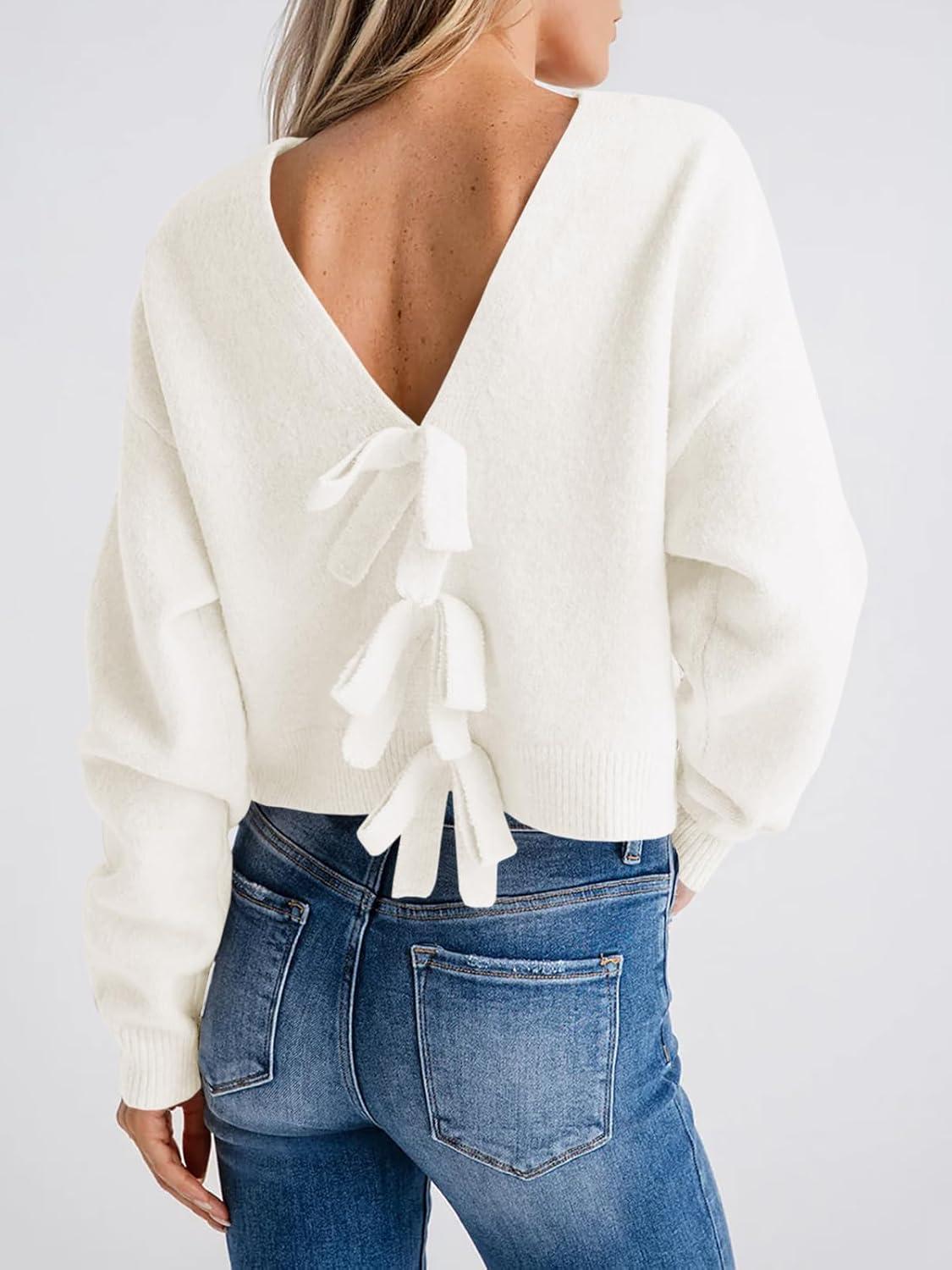 Saodimallsu Womens Bow Sweater Cropped V Neck Long Sleeve Fall Cozy Knit Loose Trendy Pullover Sweaters(White)