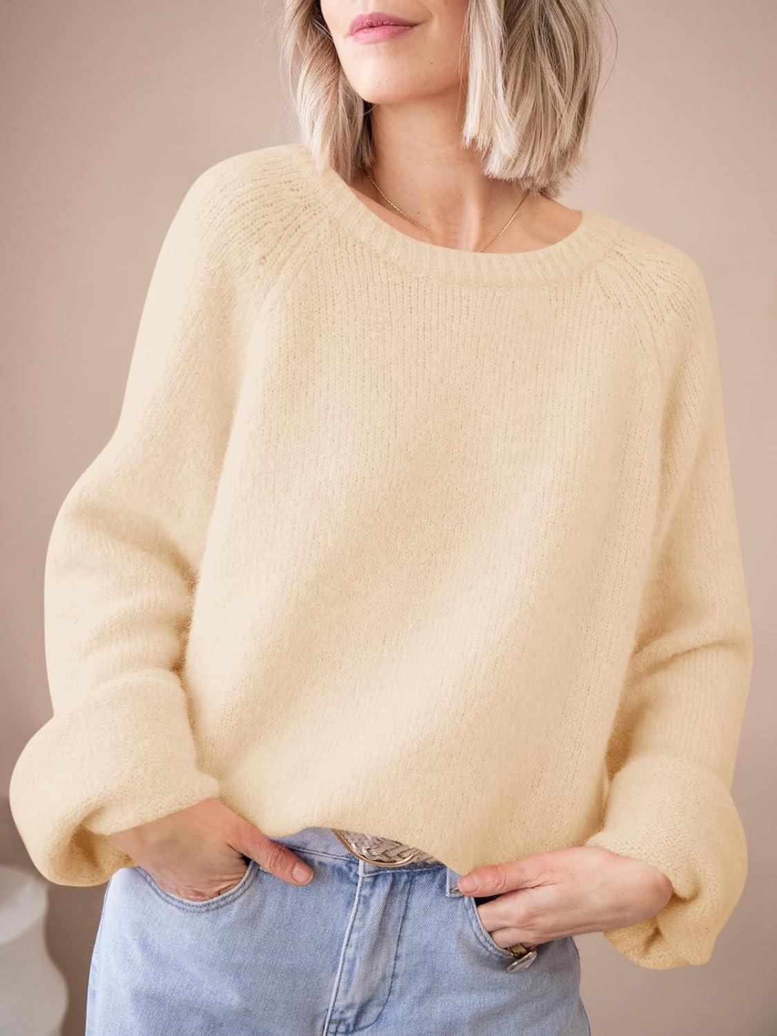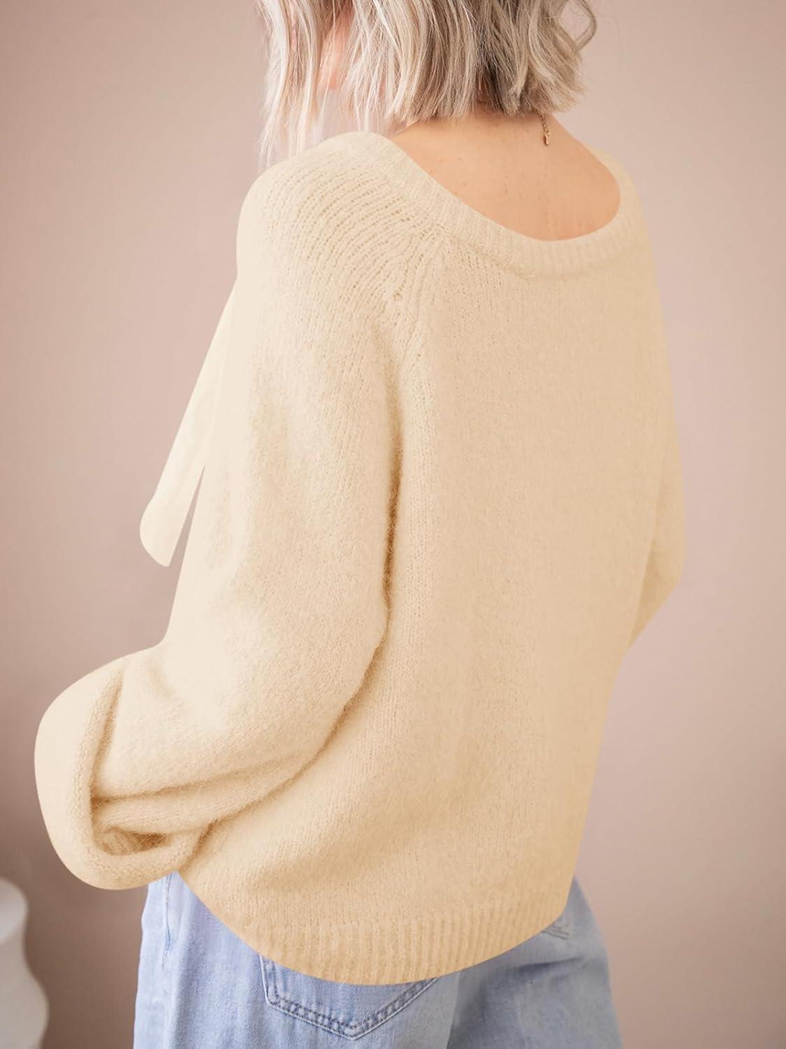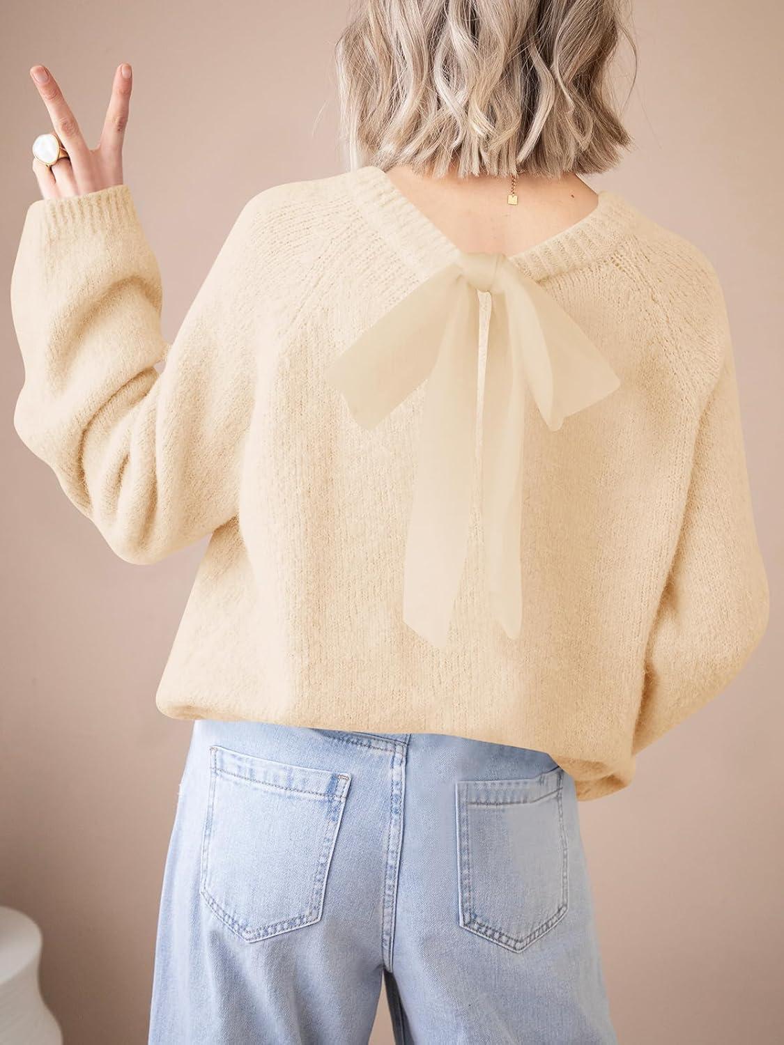 Saodimallsu Womens Bow Tie Sweater Crew Neck Long Sleeve Cute Fall Loose Cozy Knit Pullover Sweaters(Beige)