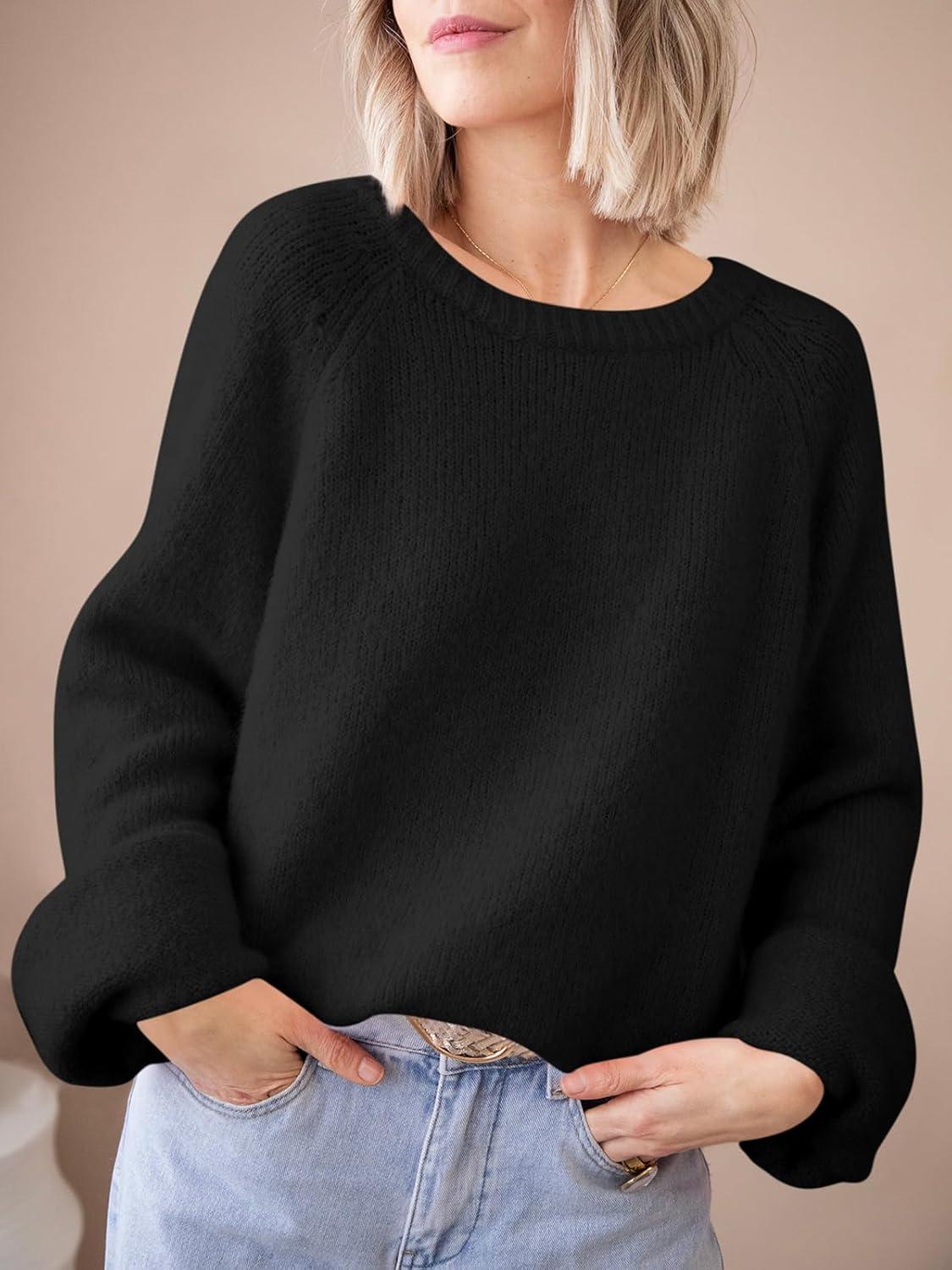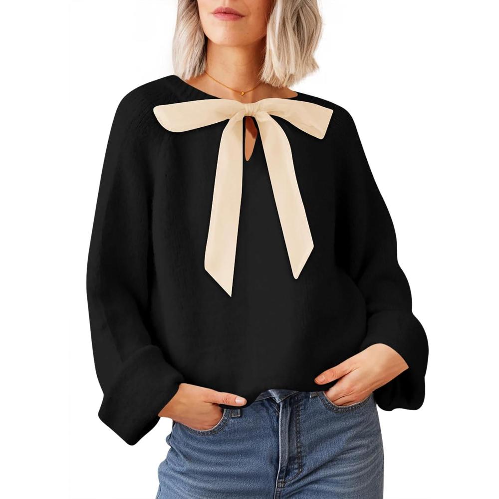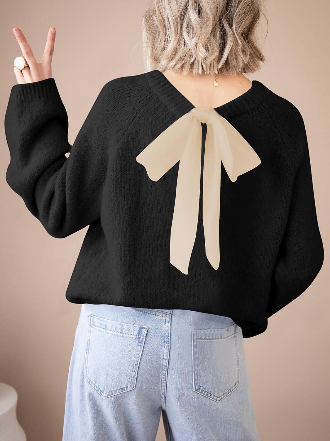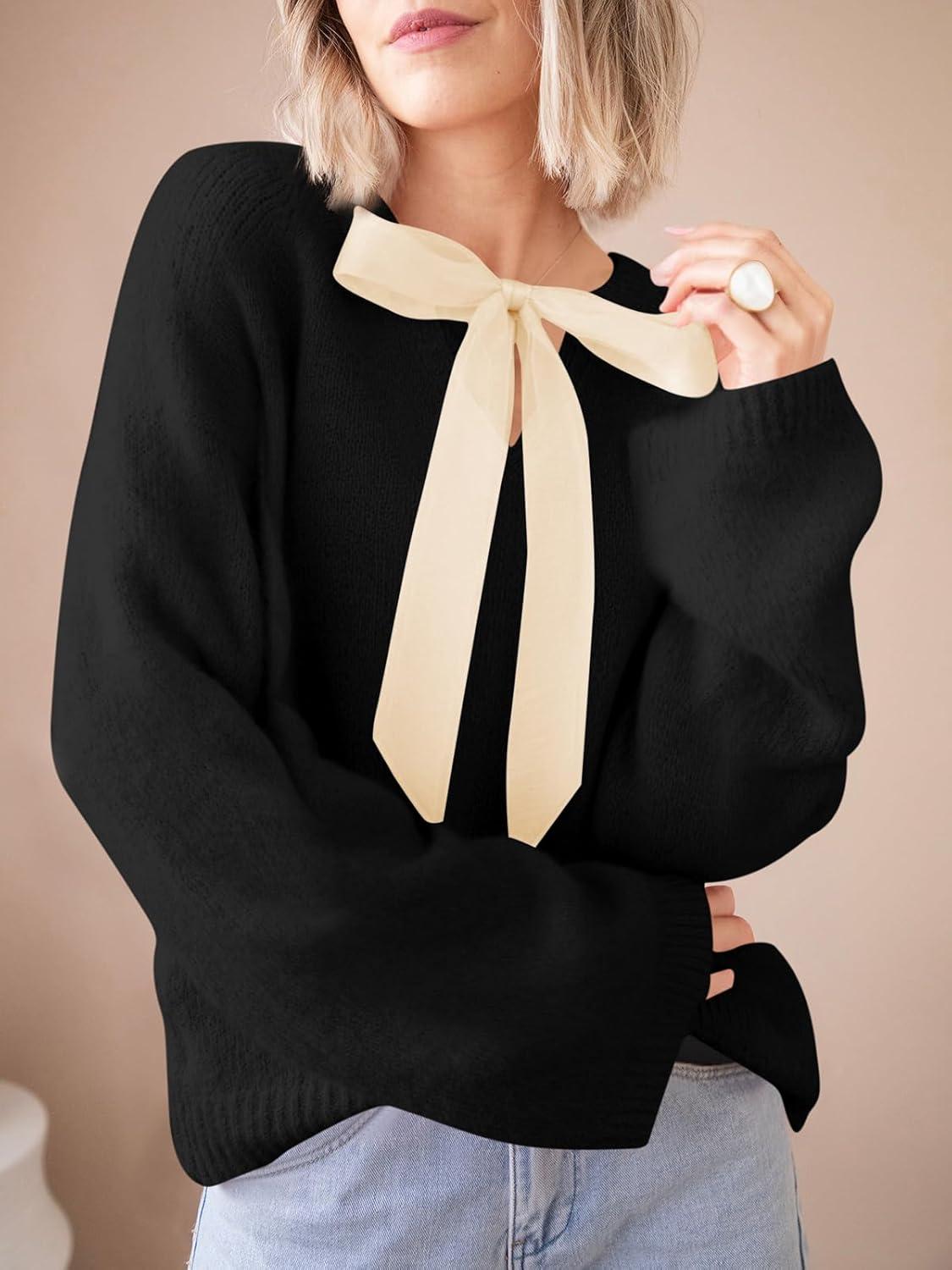 Saodimallsu Womens Bow Tie Sweater Crew Neck Long Sleeve Cute Fall Loose Cozy Knit Pullover Sweaters(Black)