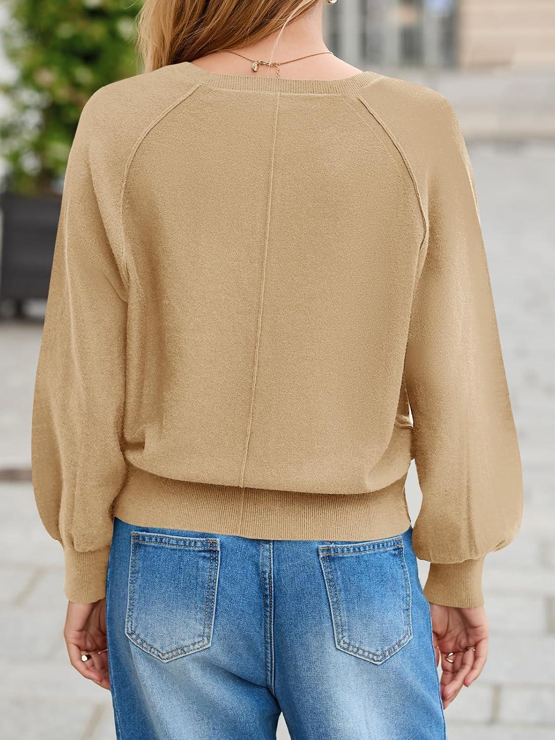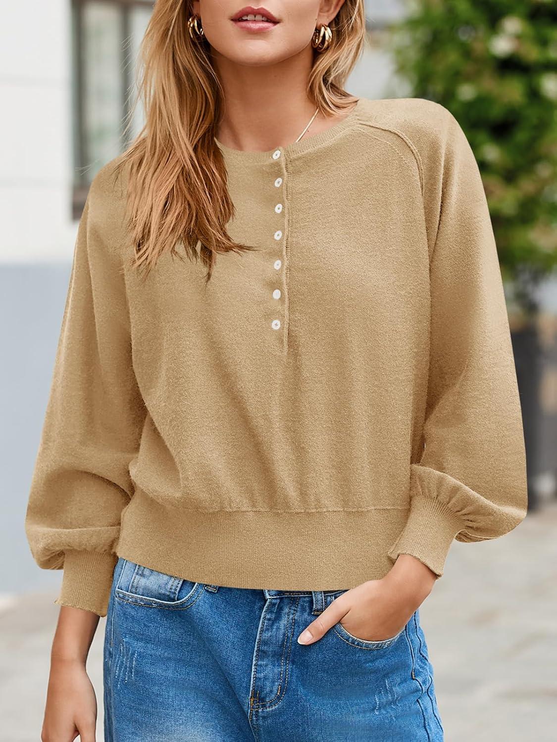 Saodimallsu Womens Button Crew Neck Sweater Fall Long Sleeve Henley Shirts Trendy Loose Knit Pullover Tops(Khaki)