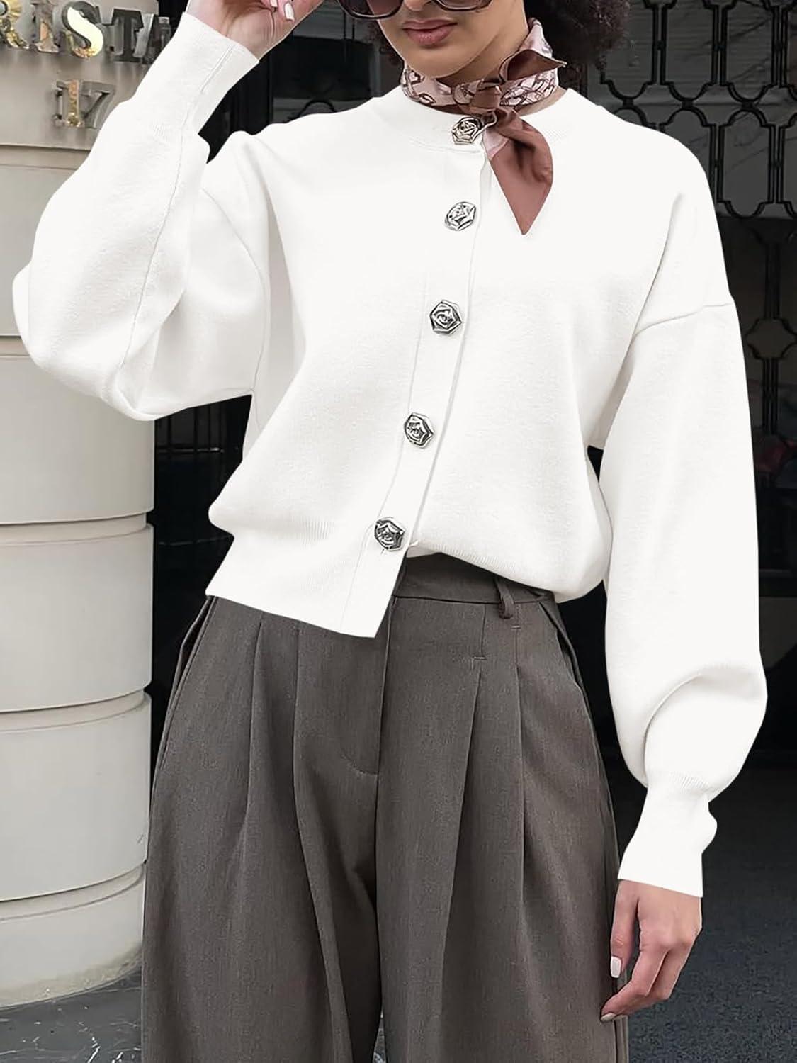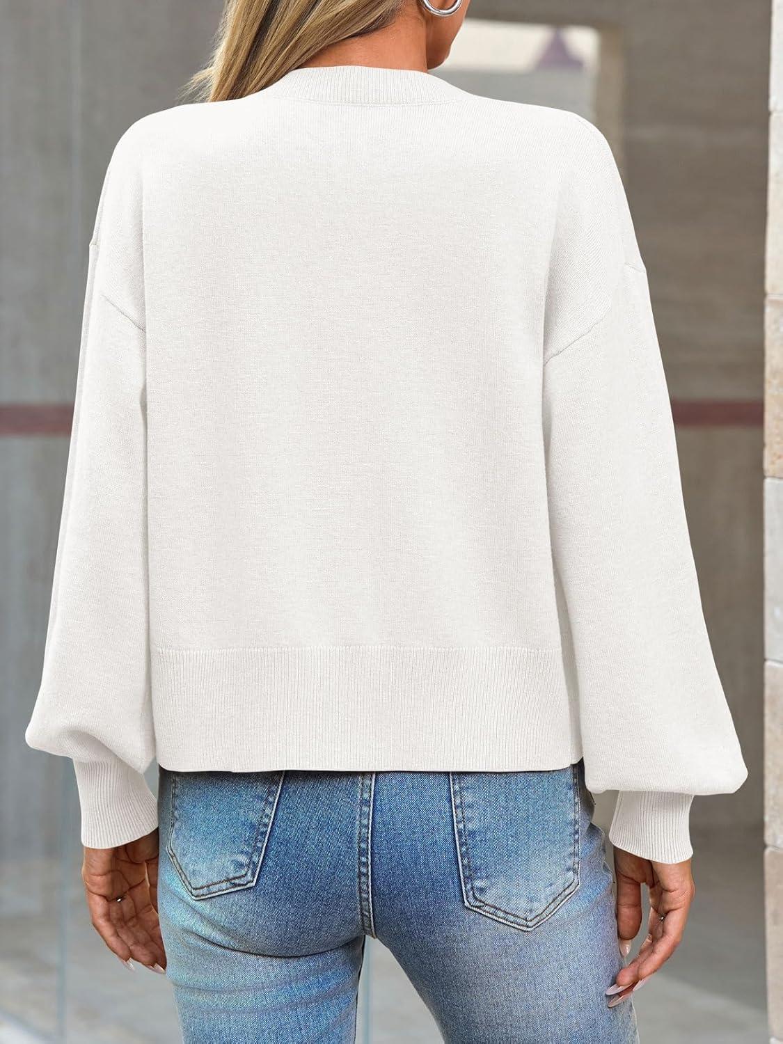 Saodimallsu Womens Button Up Cardigan Sweaters Fall Trendy Long Lantern Sleeve Knit Crew Neck Sweater Jacket(White)