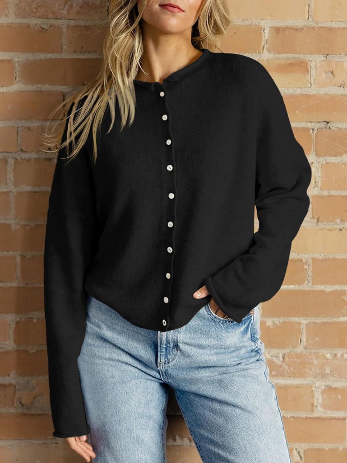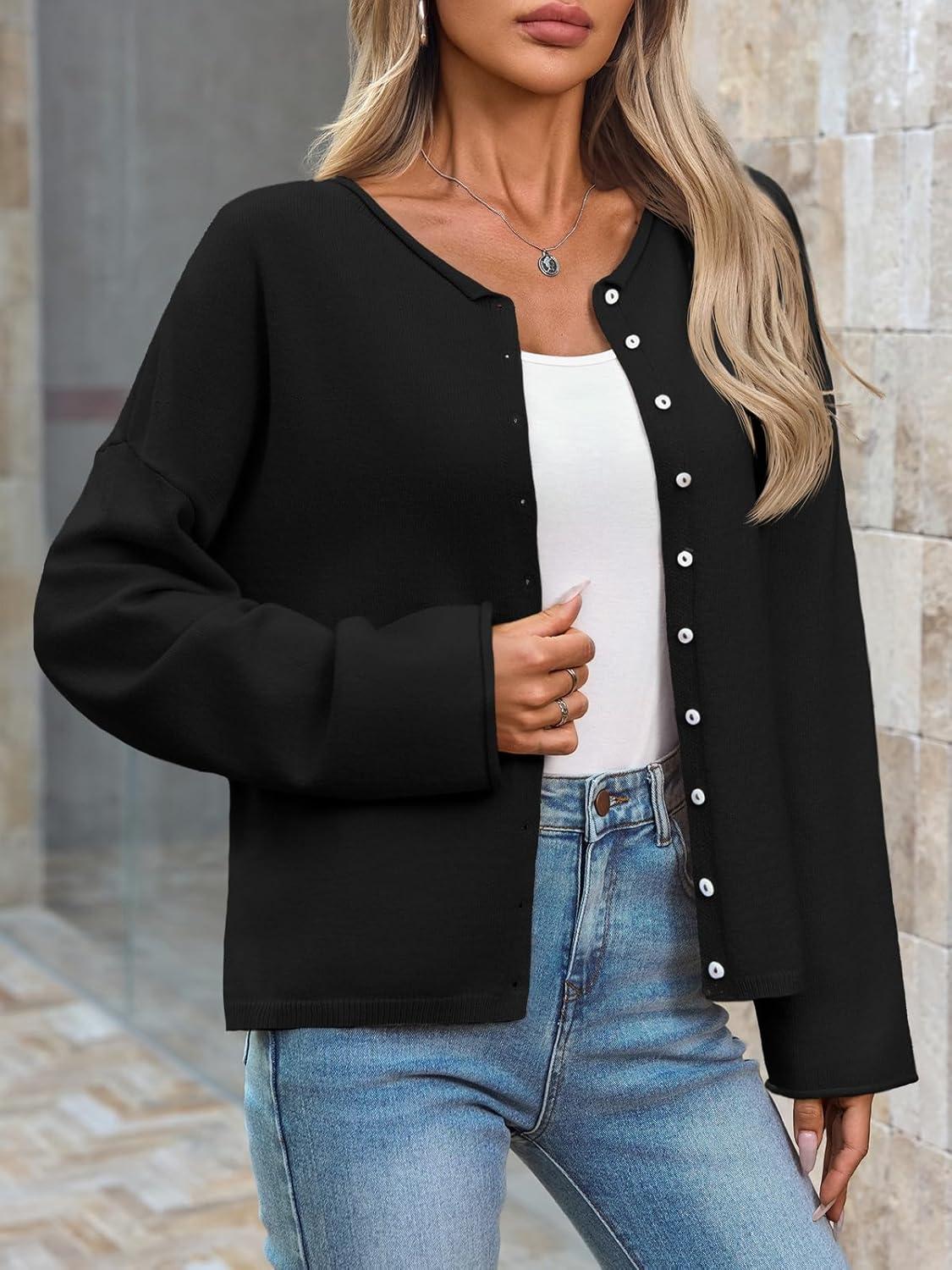 Saodimallsu Womens Button Up Cardigan Sweaters Long Sleeve Crew Neck Fall Soft Lightweight Knit Loose Sweater Tops(Black)