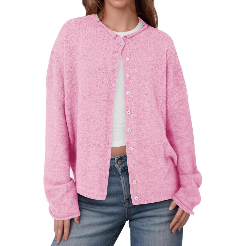 Saodimallsu Womens Button Up Cardigan Sweaters Long Sleeve Crew Neck Fall Soft Lightweight Knit Loose Sweater Tops(Pink)