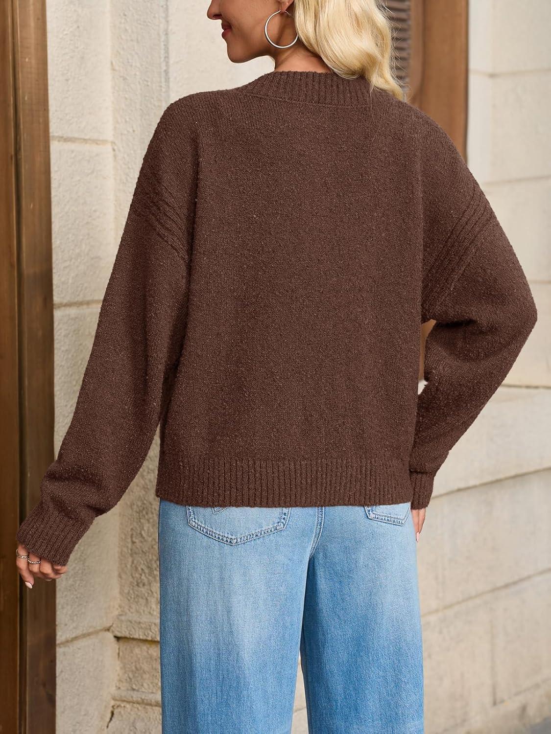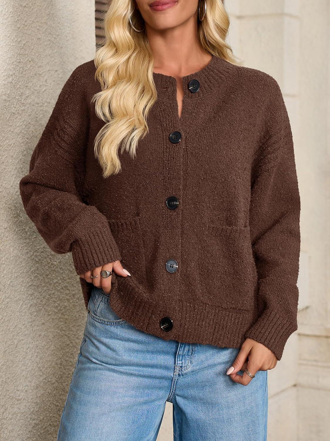 Saodimallsu Womens Button Up Cardigans Fall Crew Neck Fuzzy Knit Long Sleeve Cropped Sweater Jacket with Pockets(Brown)