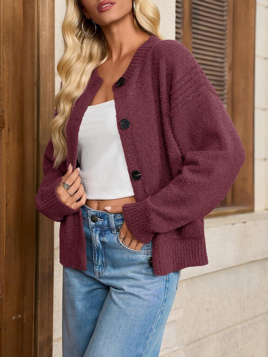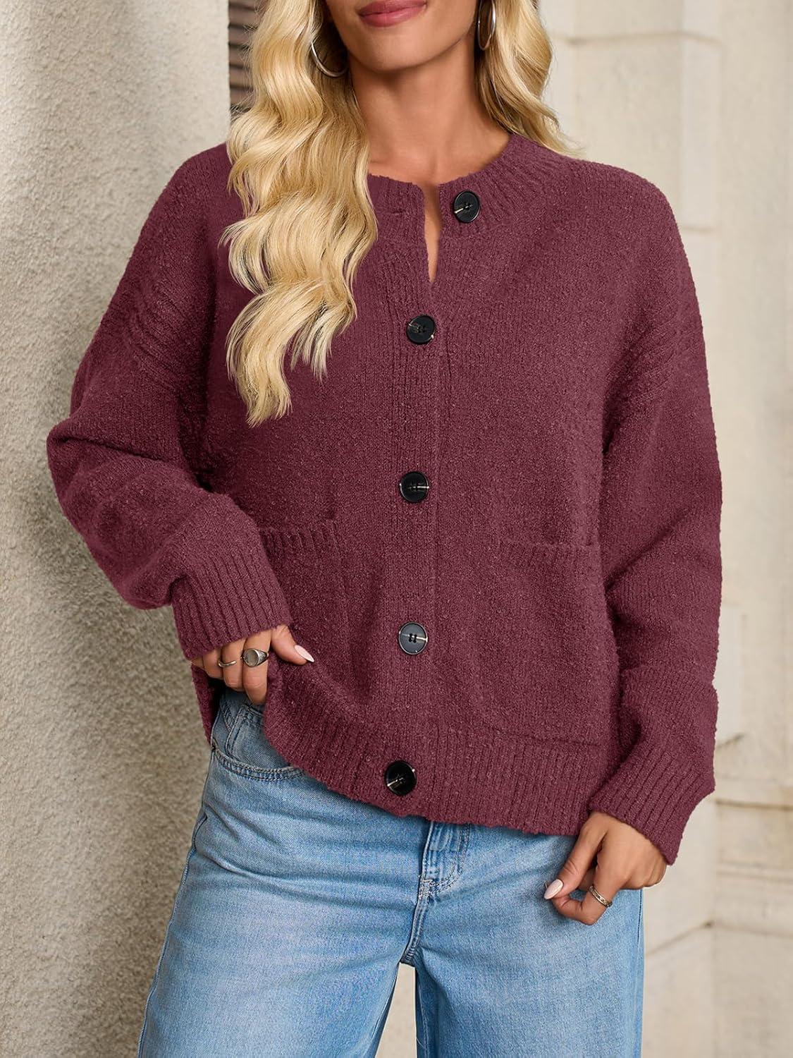 Saodimallsu Womens Button Up Cardigans Fall Crew Neck Fuzzy Knit Long Sleeve Cropped Sweater Jacket with Pockets(Burgundy)
