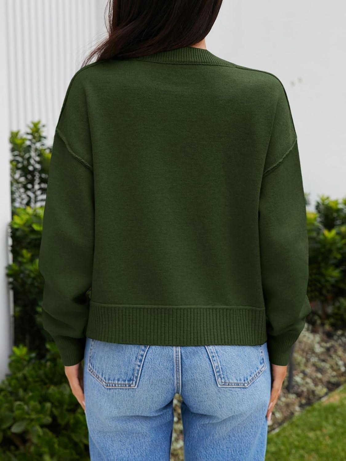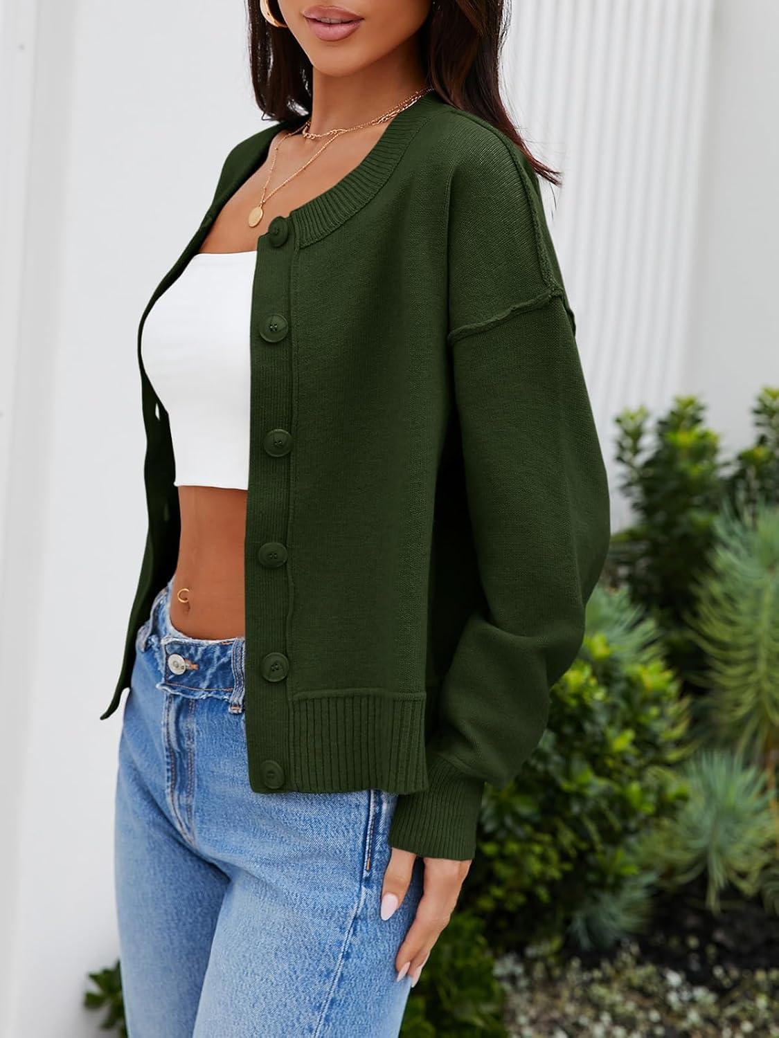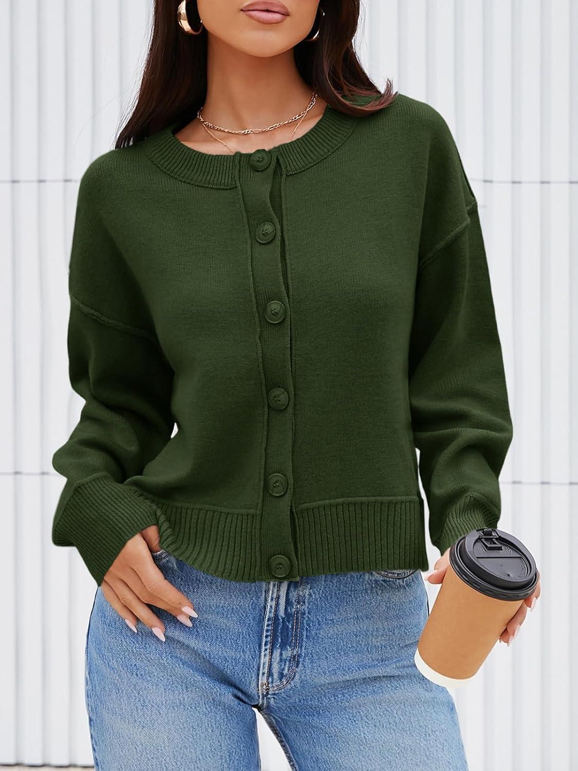 Saodimallsu Womens Button Up Cardigans Fall Trendy Crew Neck Long Sleeve Knit Cropped Sweater Jacket(Army Green)