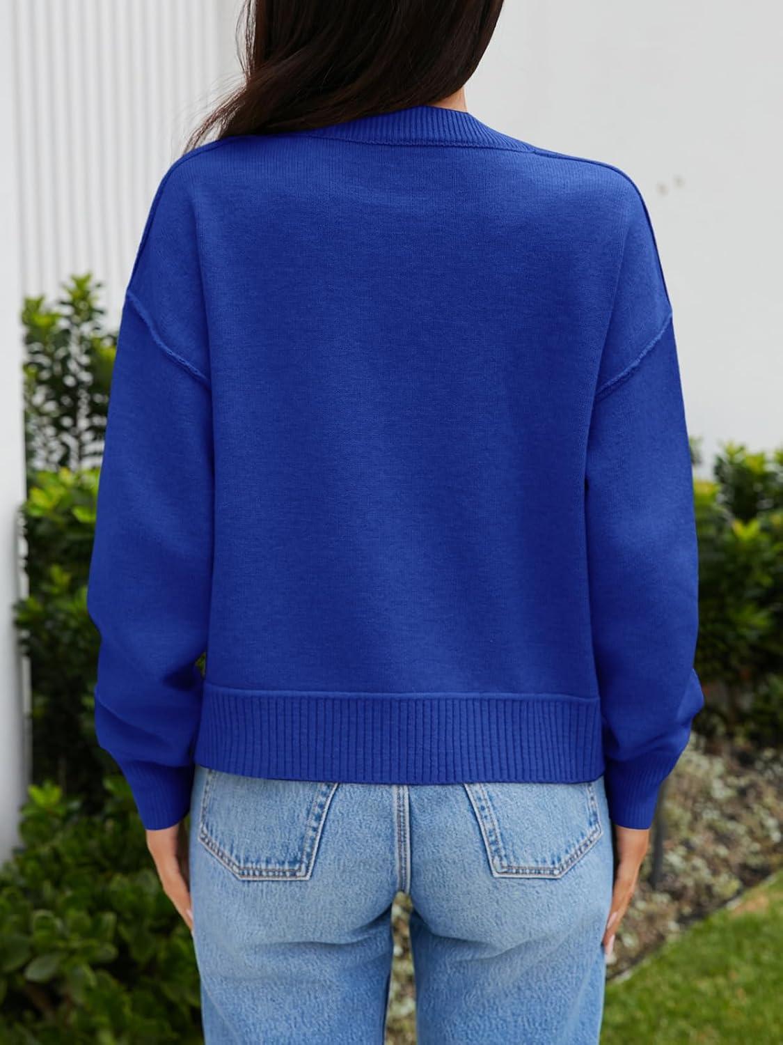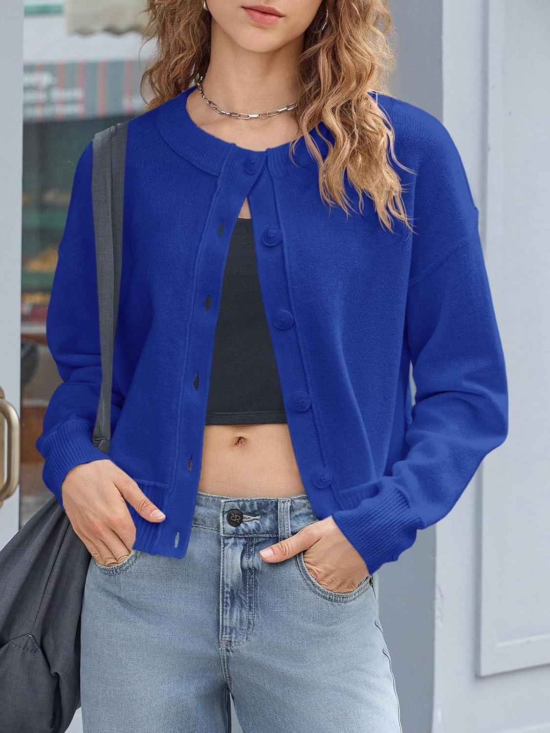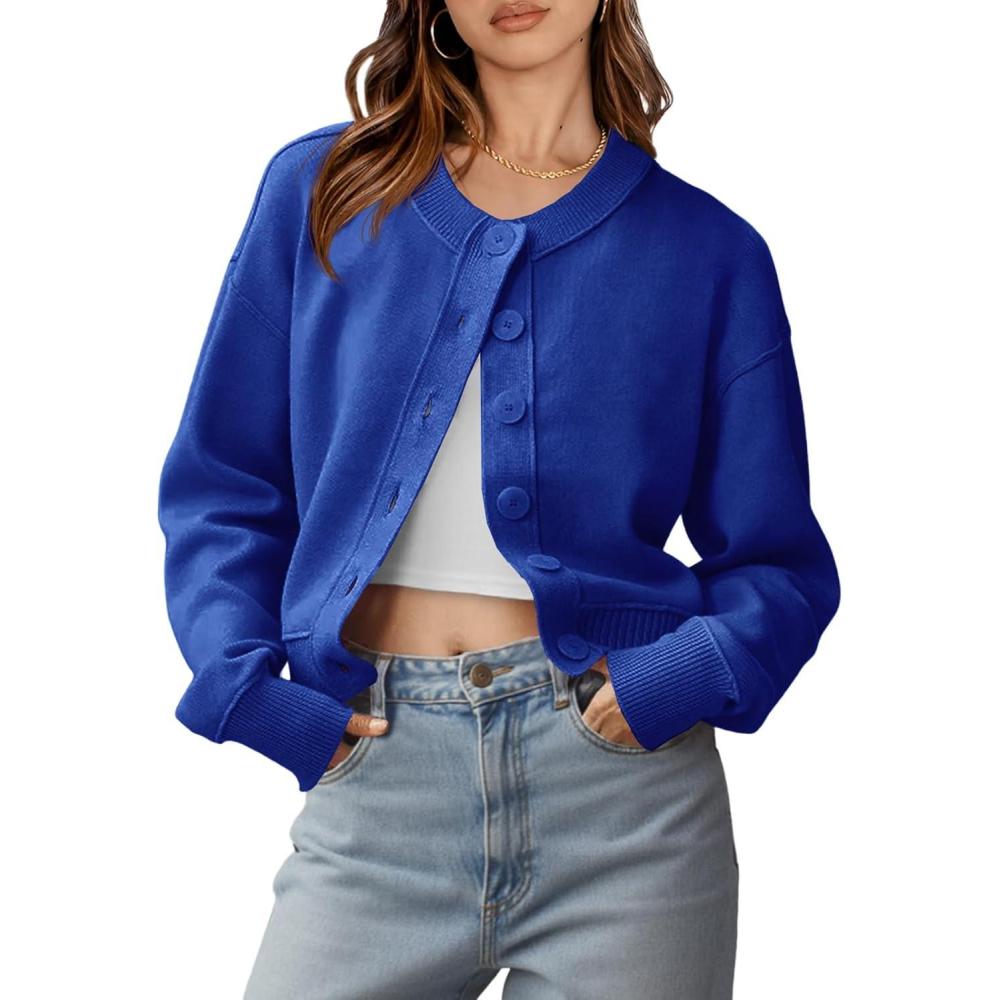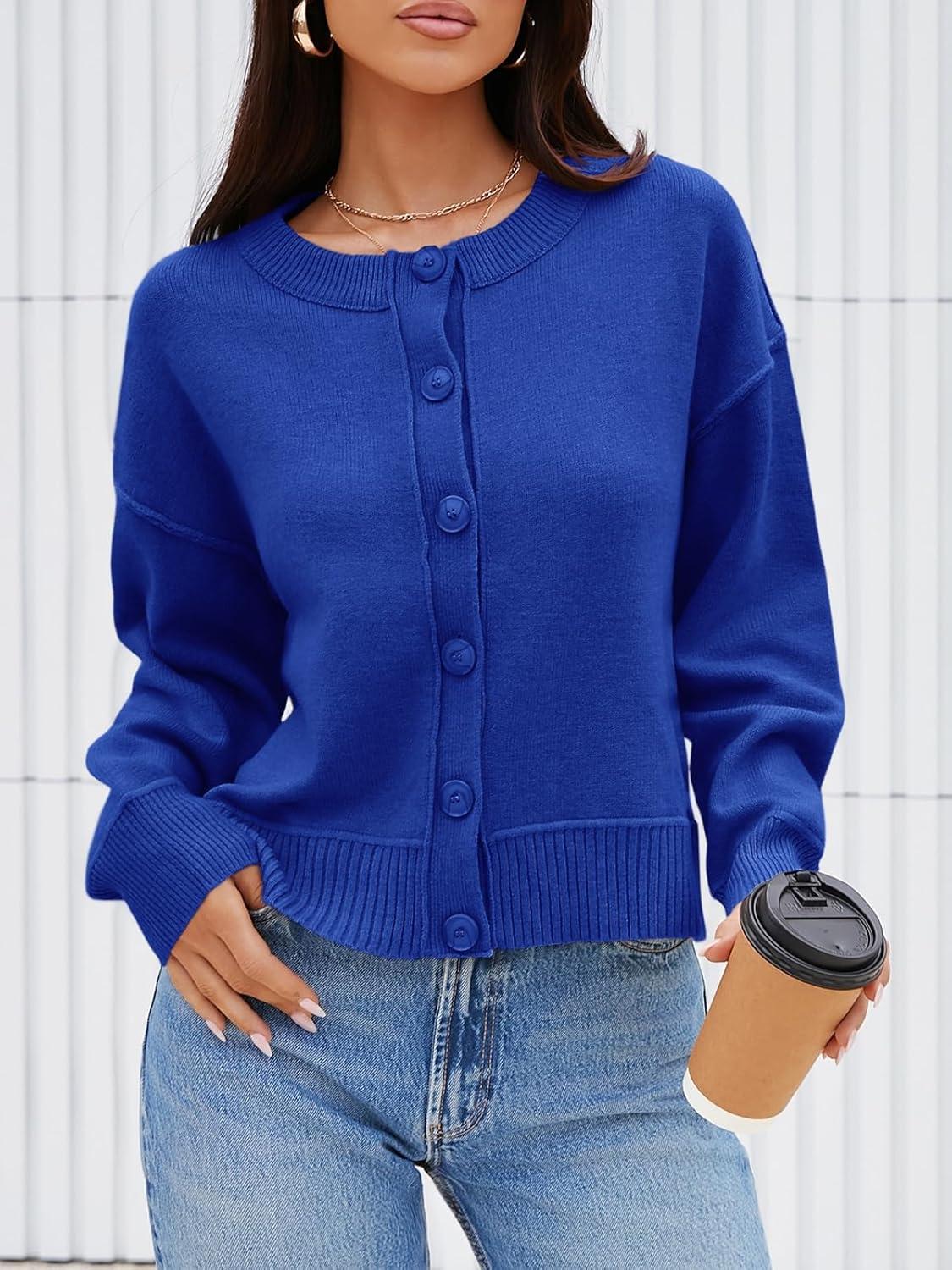 Saodimallsu Womens Button Up Cardigans Fall Trendy Crew Neck Long Sleeve Knit Cropped Sweater Jacket(Blue)