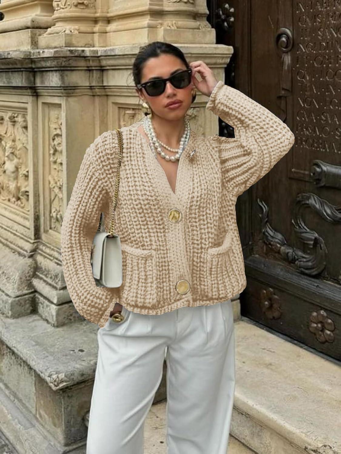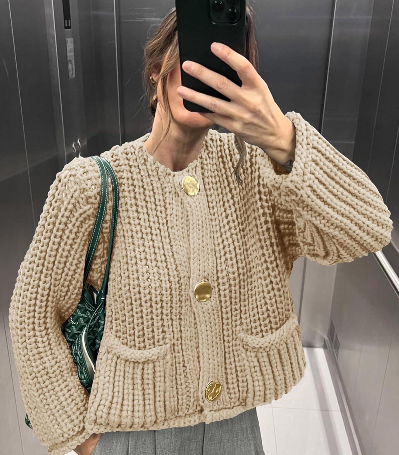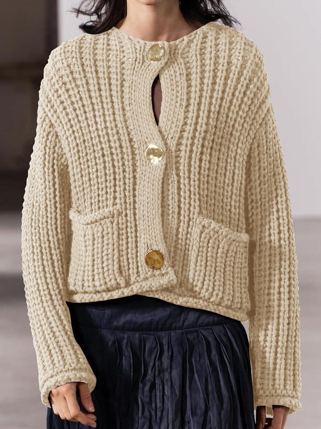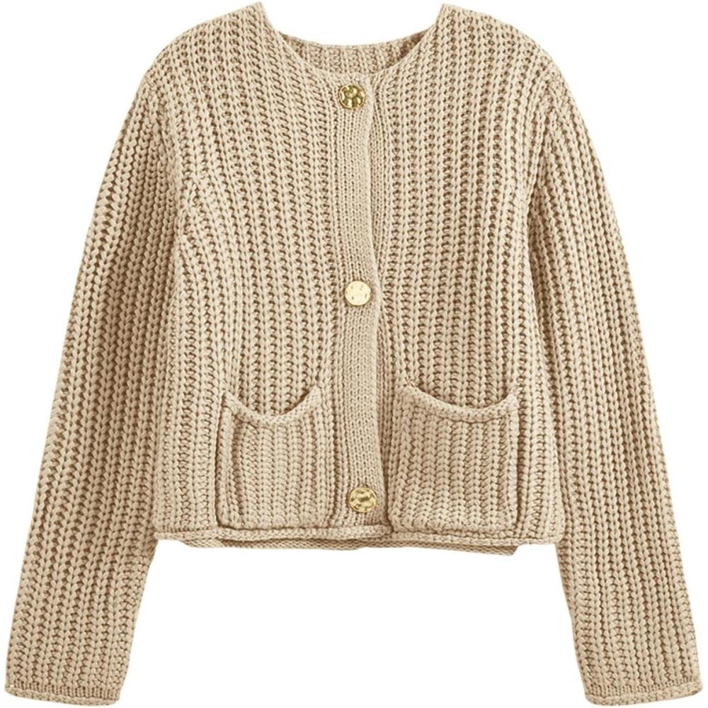 Saodimallsu Womens Button Up Sweaters Fall Chunky Knit Cropped Trendy Crewneck Loose Cardigan with Pockets(Khaki)