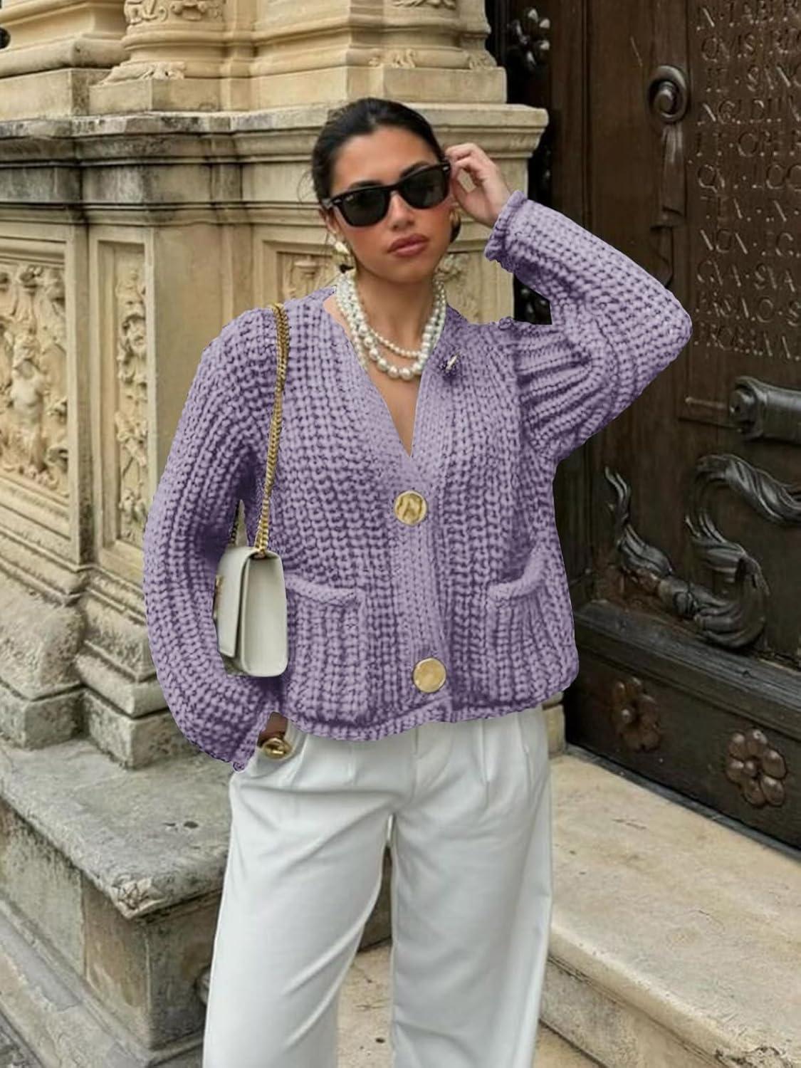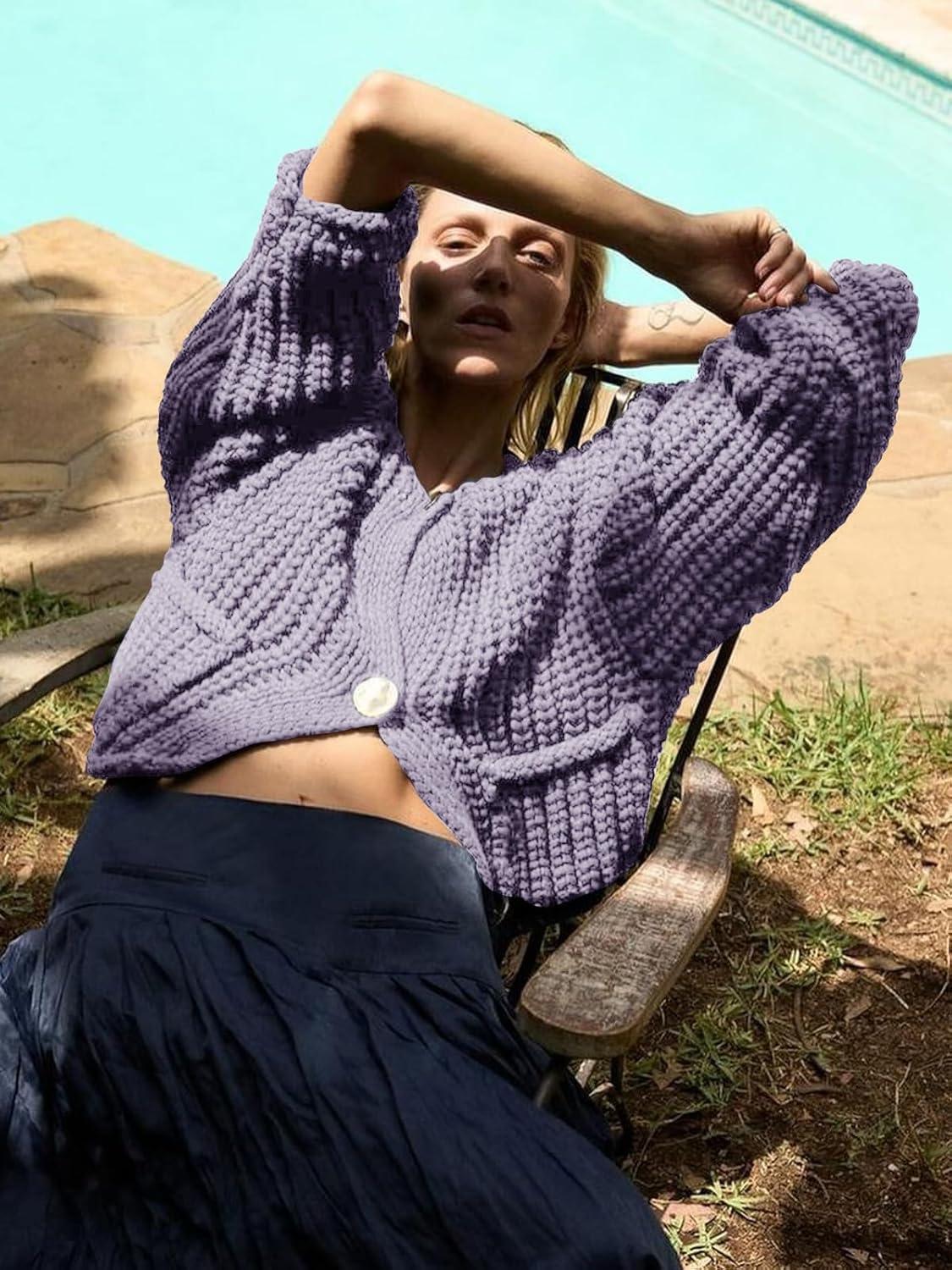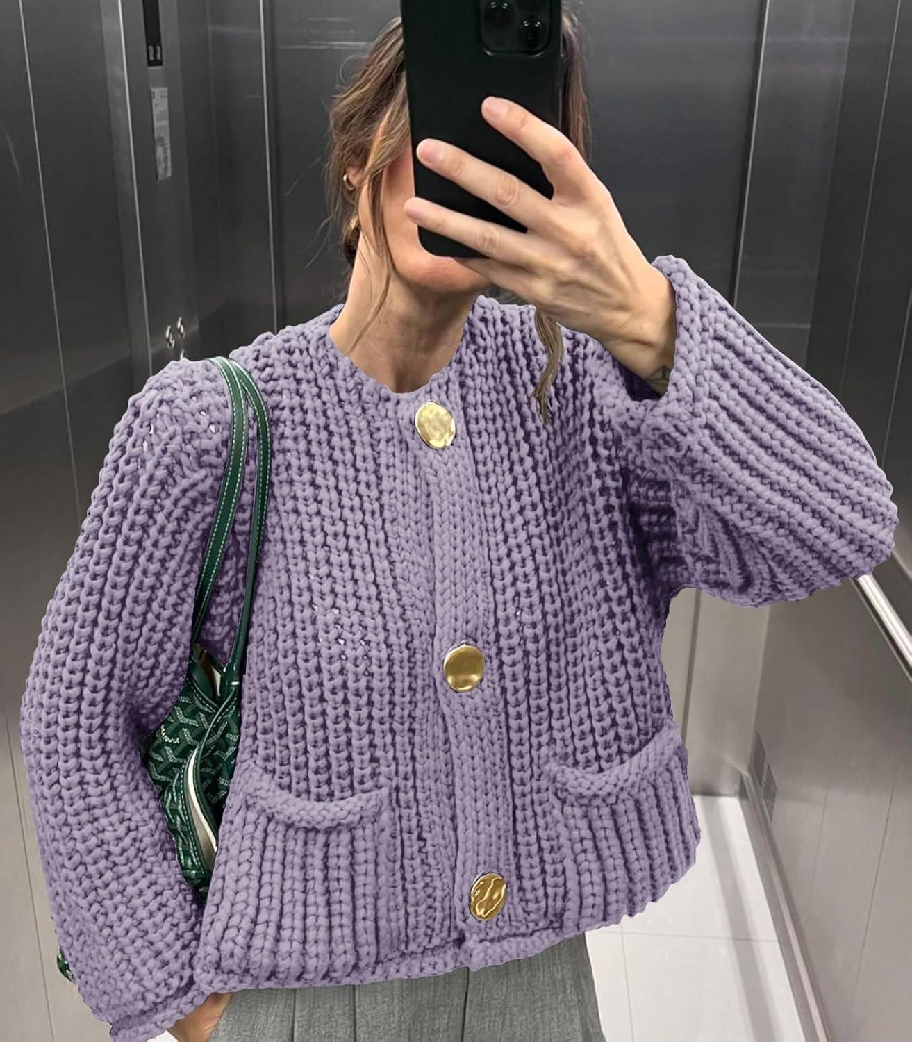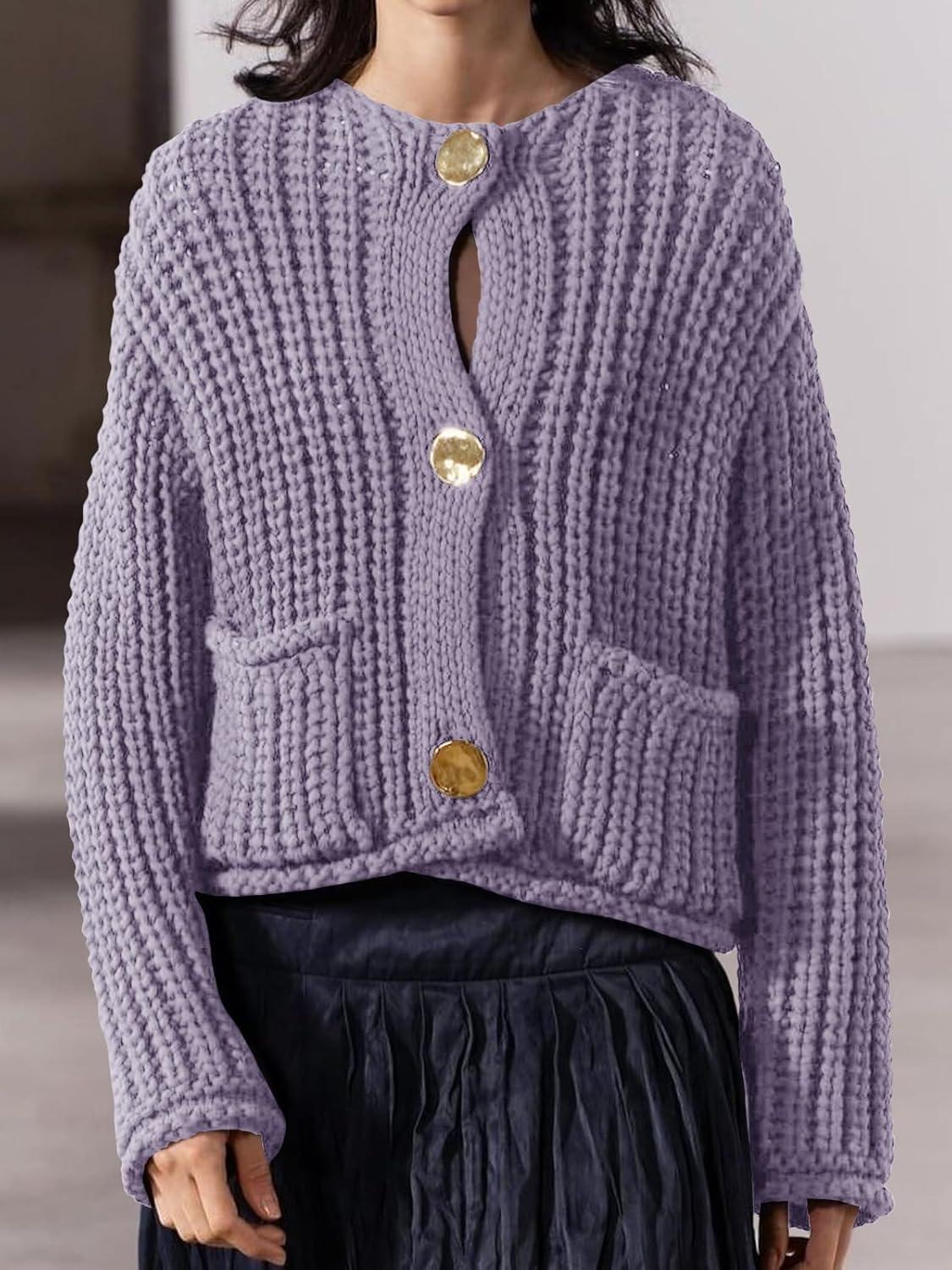 Saodimallsu Womens Button Up Sweaters Fall Chunky Knit Cropped Trendy Crewneck Loose Cardigan with Pockets(Light Purple)