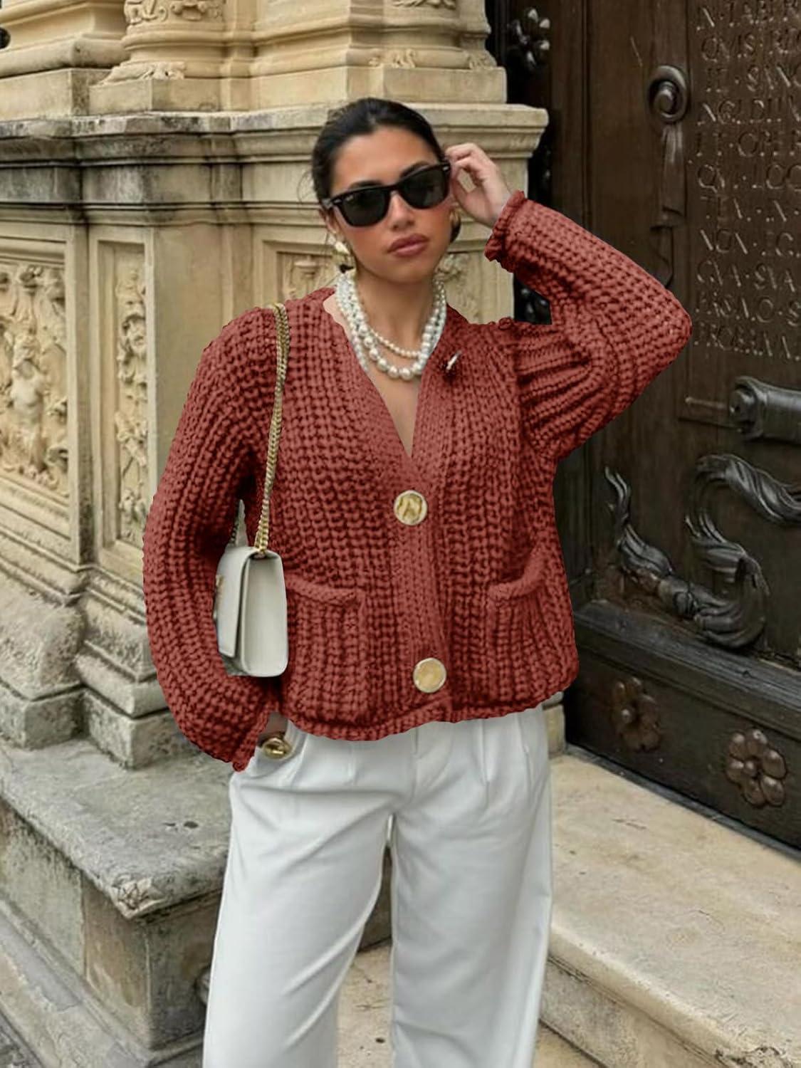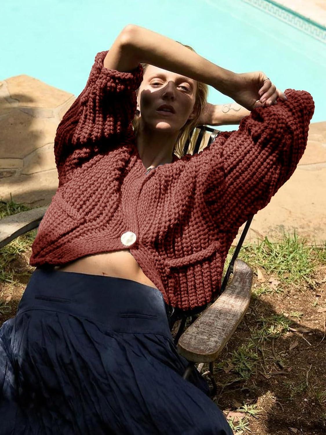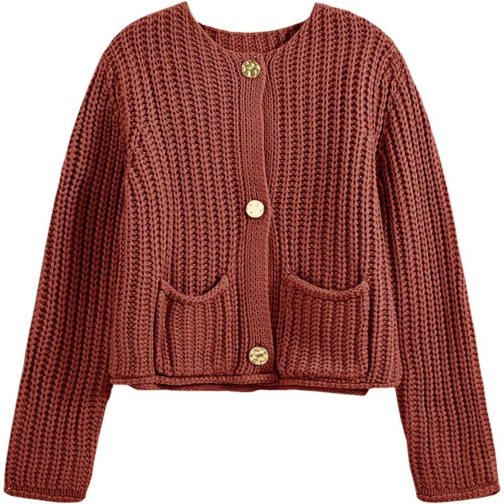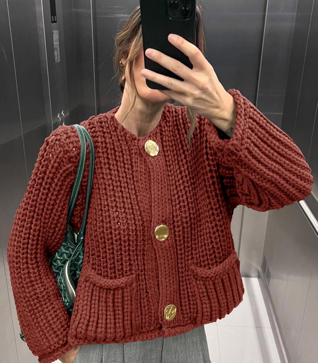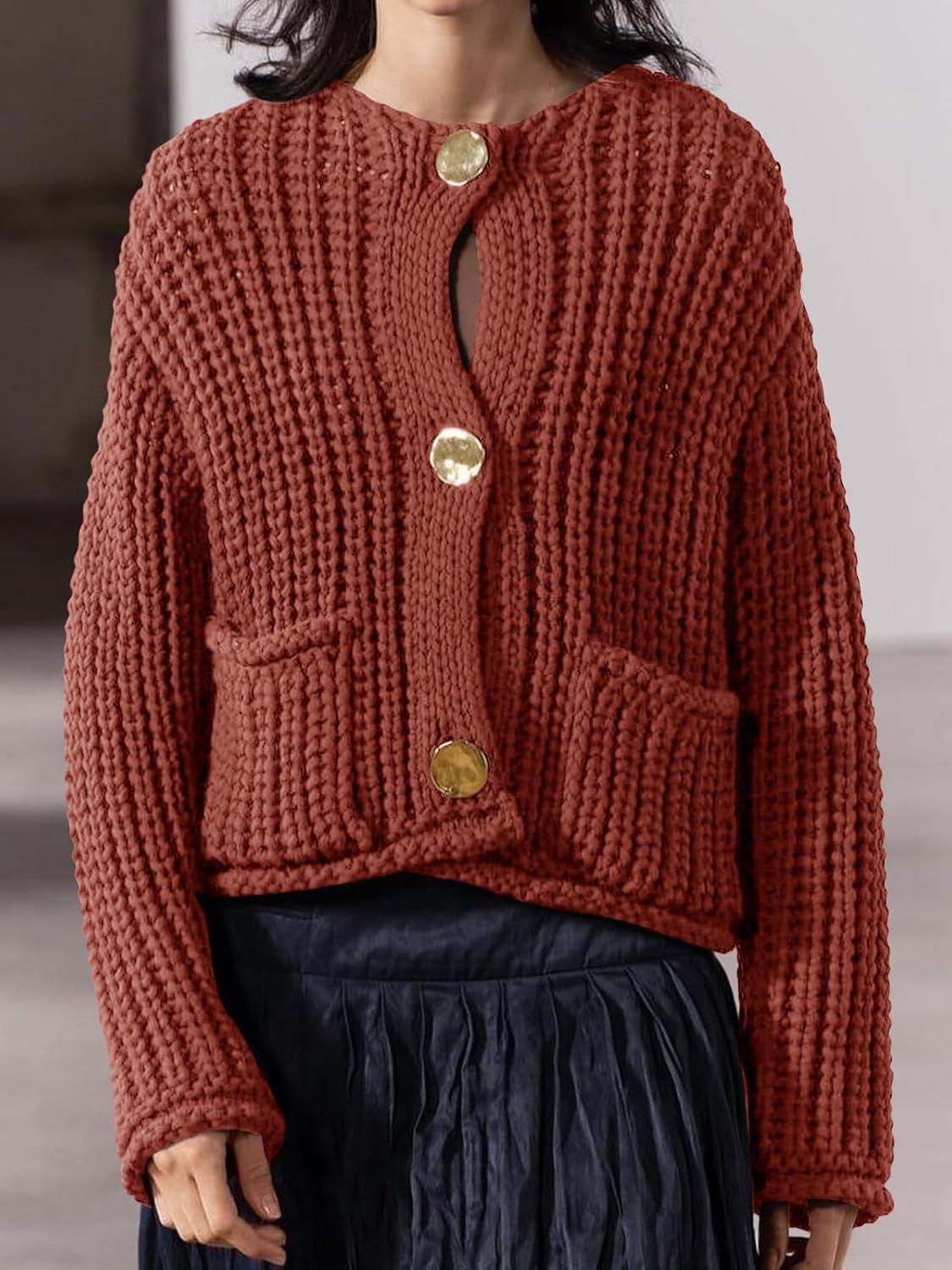 Saodimallsu Womens Button Up Sweaters Fall Chunky Knit Cropped Trendy Crewneck Loose Cardigan with Pockets(Orange Red)