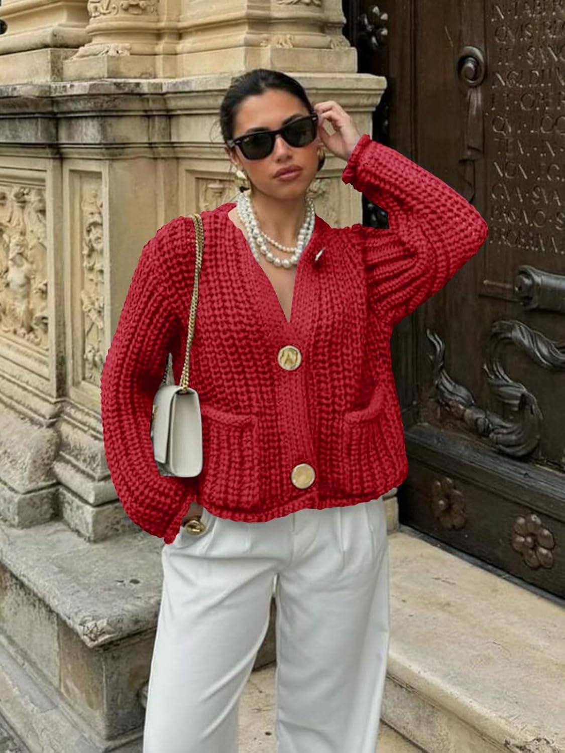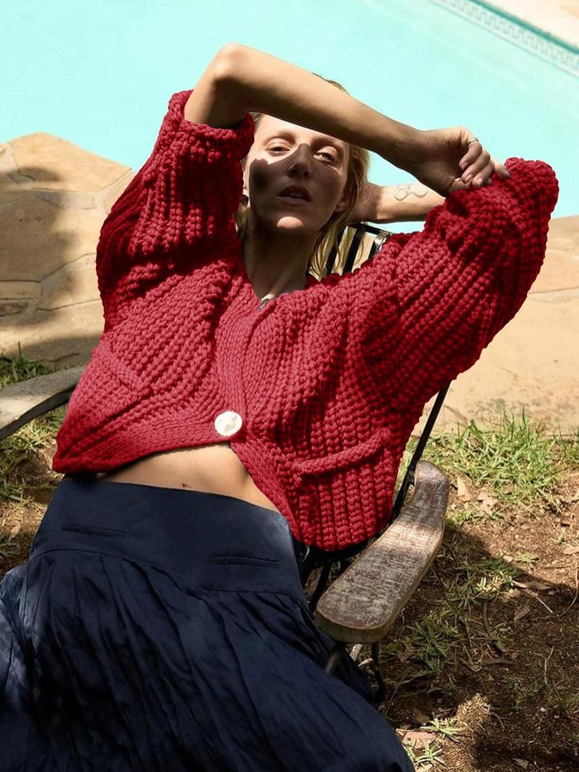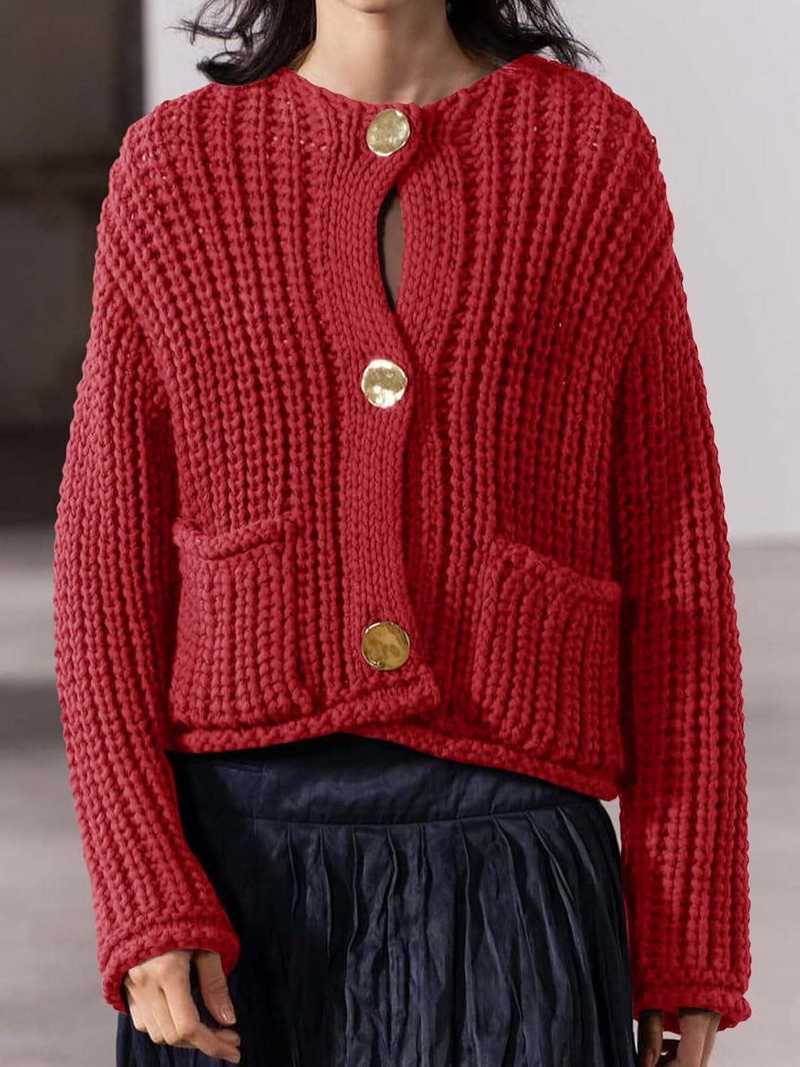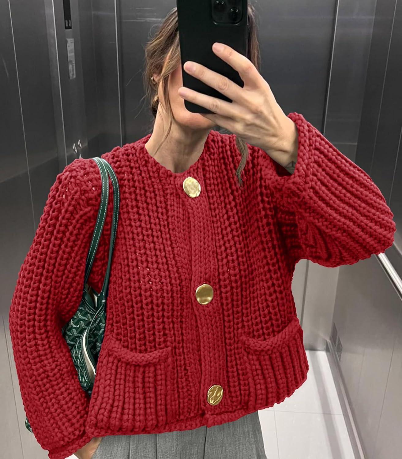 Saodimallsu Womens Button Up Sweaters Fall Chunky Knit Cropped Trendy Crewneck Loose Cardigan with Pockets(Red)