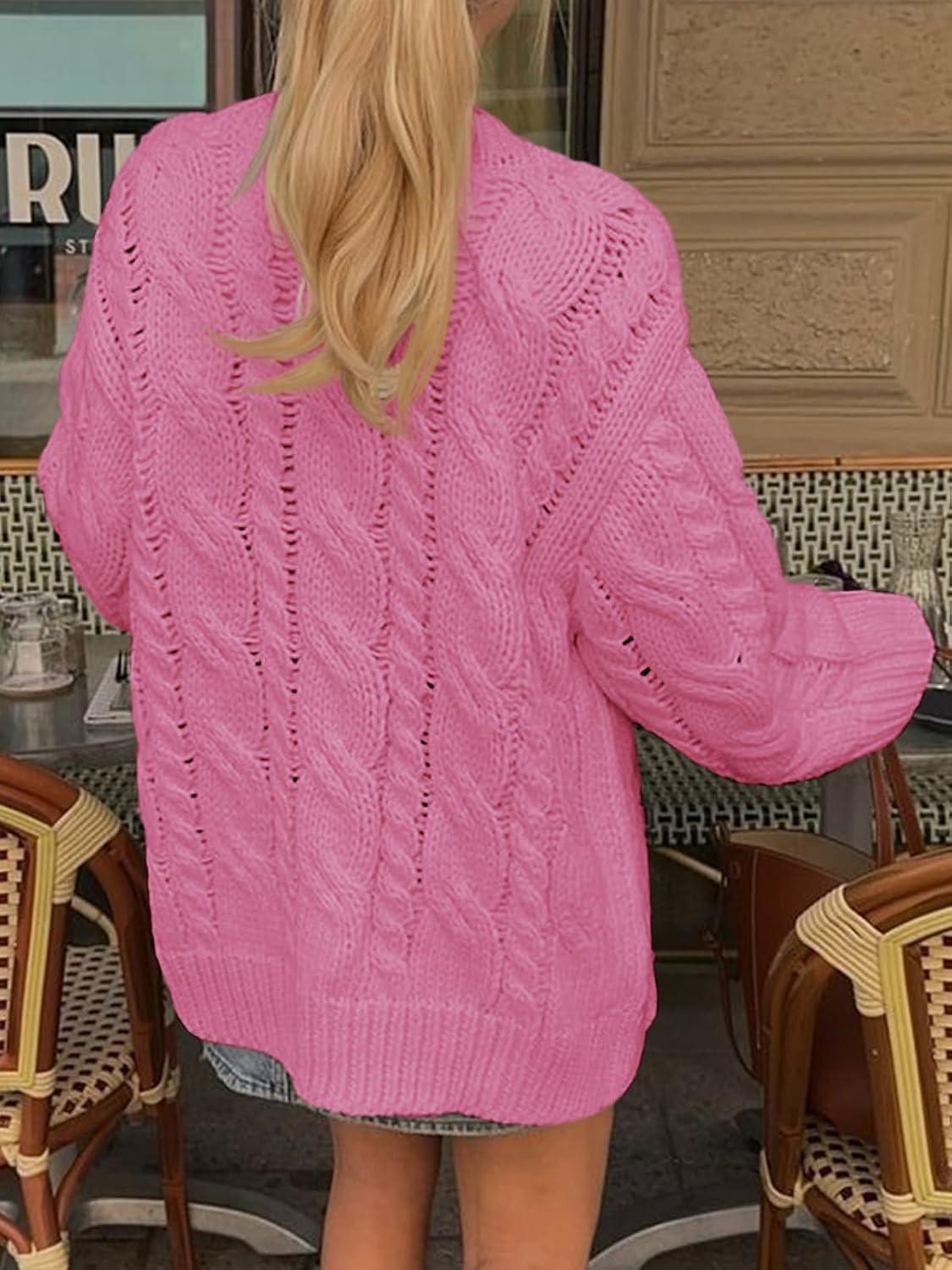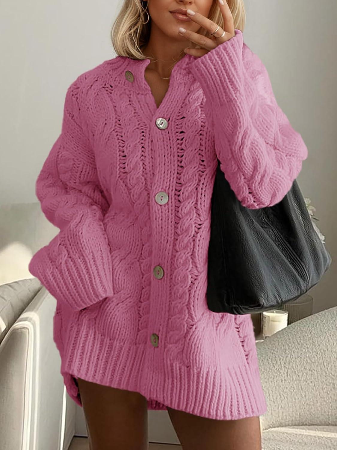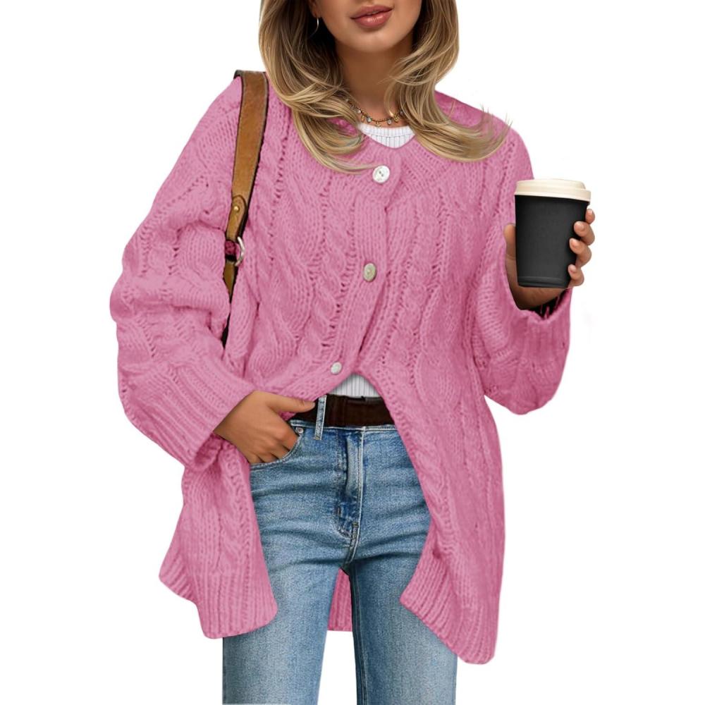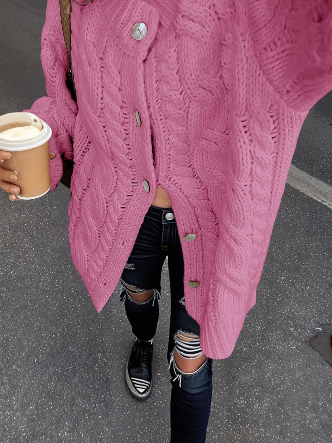Saodimallsu Womens Cable Knit Cardigan Sweaters Chunky Button Up Long Sleeve Crew Neck Warm Loose Sweater Dress(Pink)