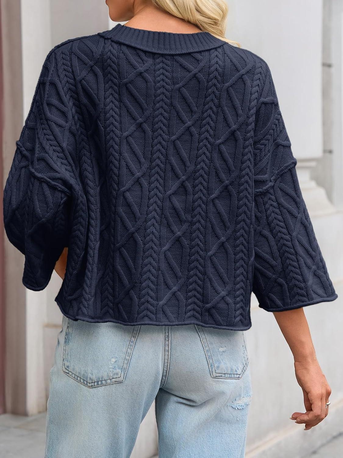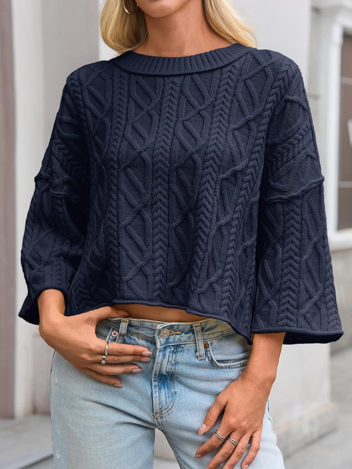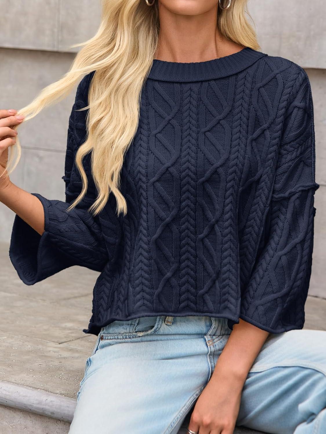 Saodimallsu Womens Cable Knit Cropped Sweaters Oversized 3/4 Sleeve Crew Neck Fall Casual Pullover Tops(Dark Navy)