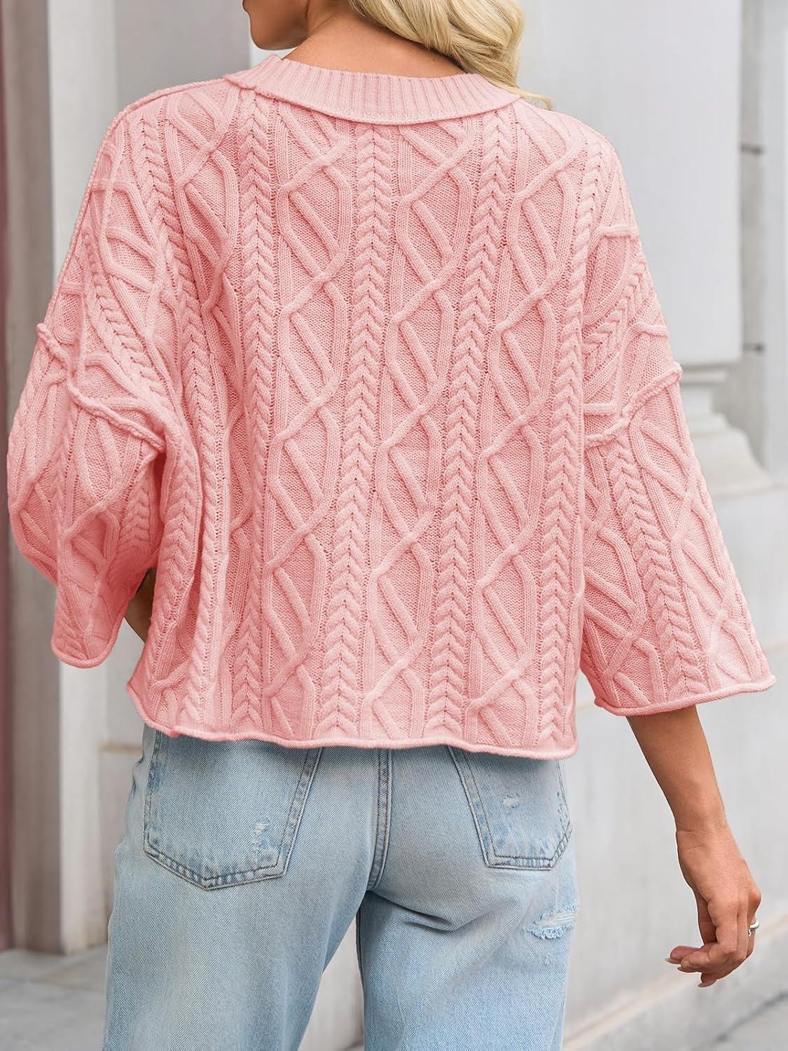 Saodimallsu Womens Cable Knit Cropped Sweaters Oversized 3/4 Sleeve Crew Neck Fall Casual Pullover Tops(Light Pink)
