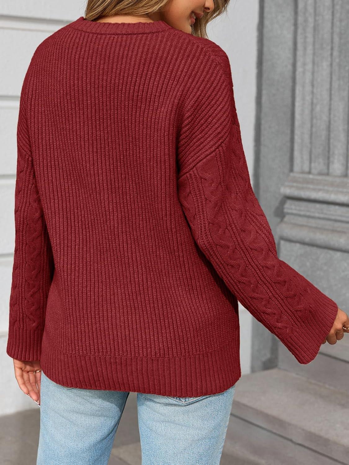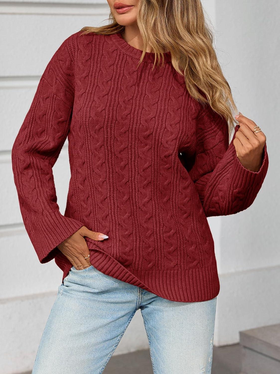 Saodimallsu Womens Cable Knit Sweater Oversized Long Sleeve Chunky Knit Crew Neck Fall Pullover Sweaters Top(Burgundy)