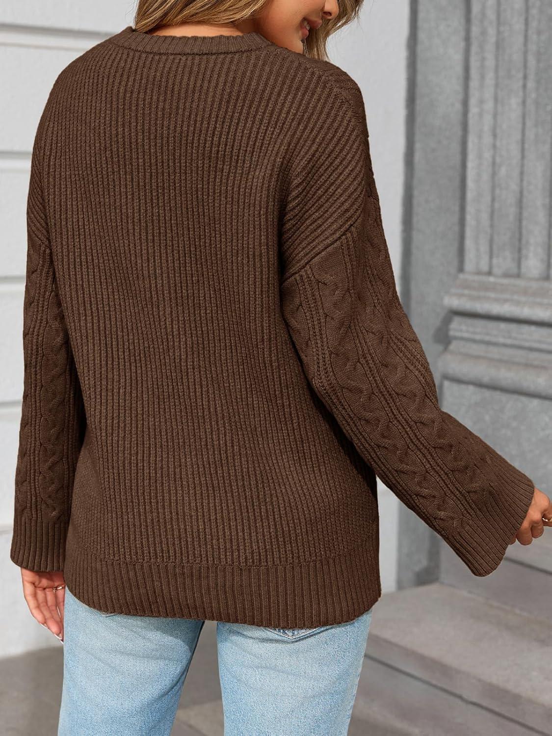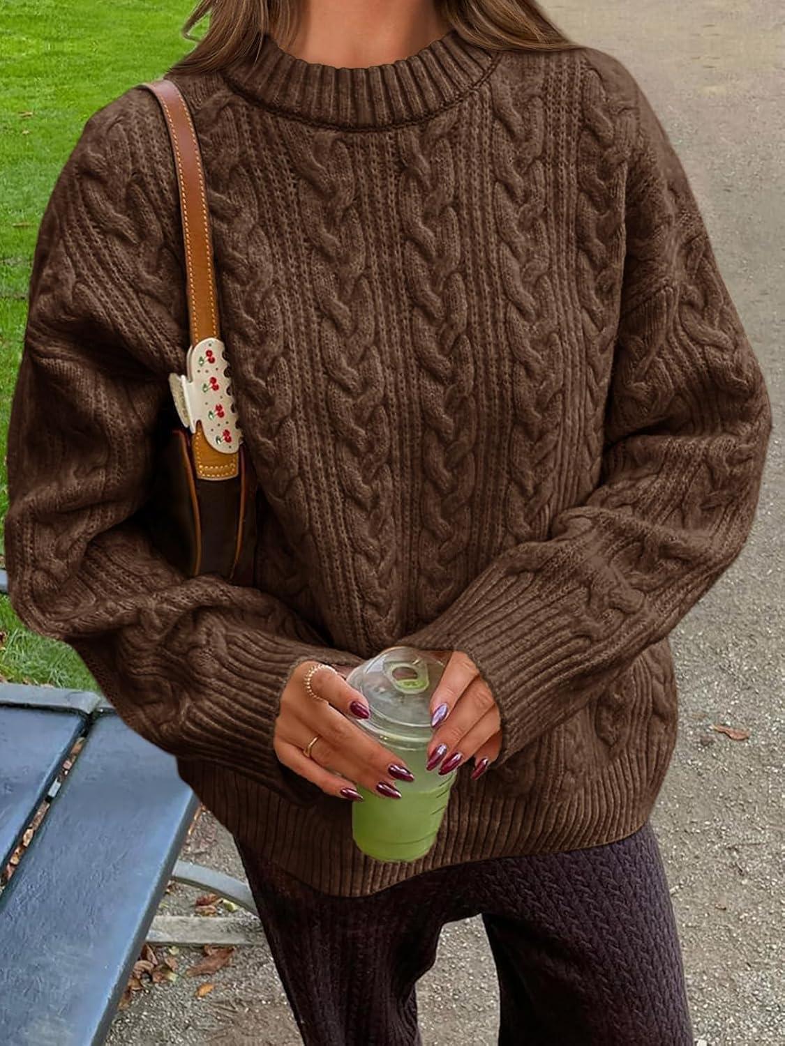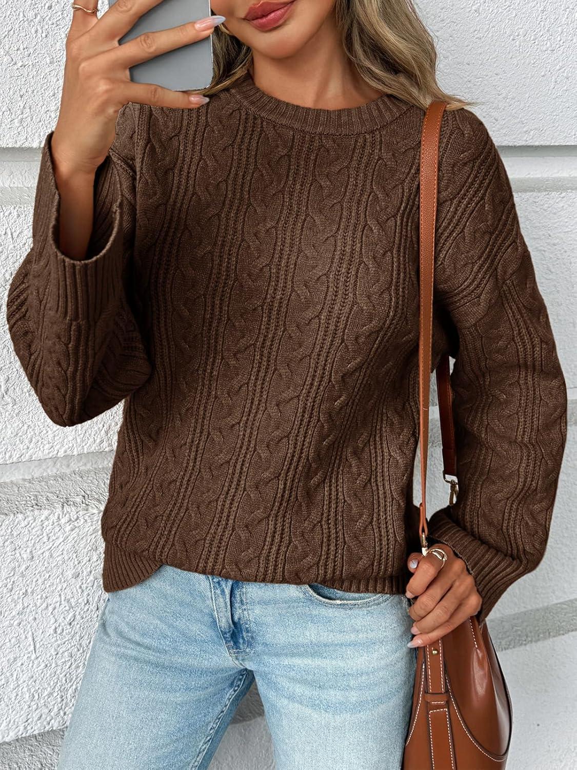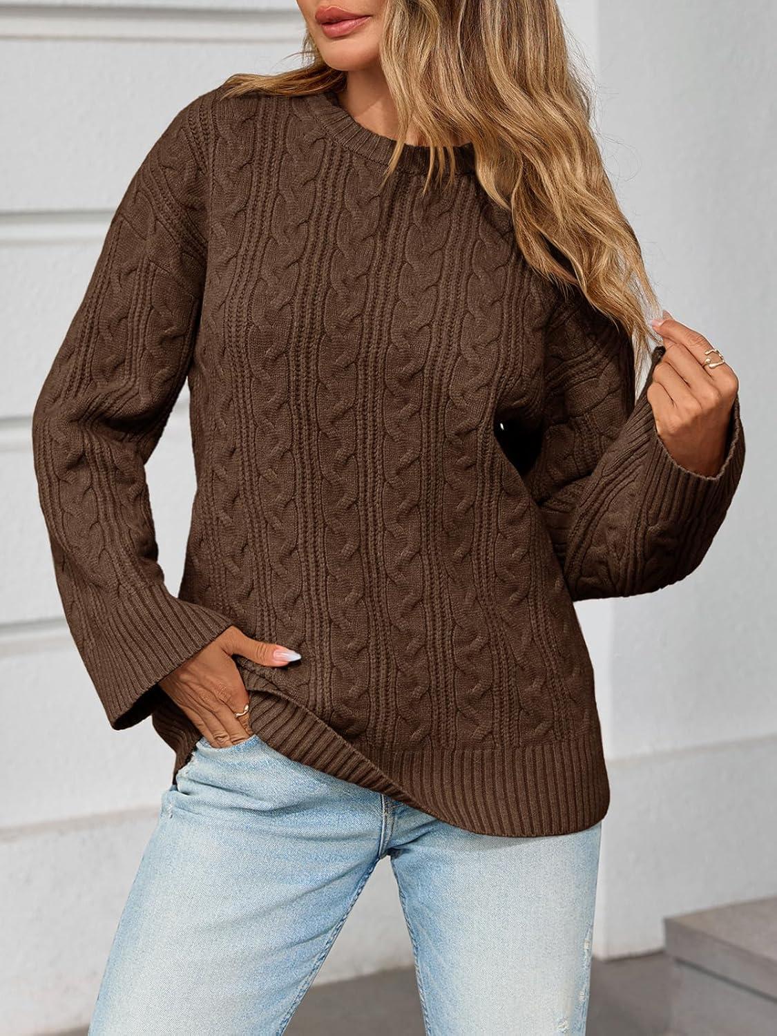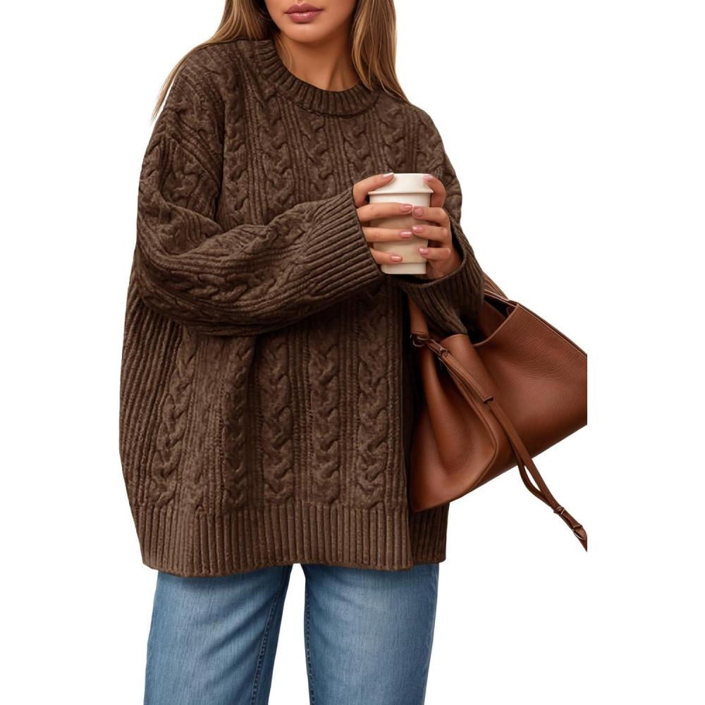 Saodimallsu Womens Cable Knit Sweater Oversized Long Sleeve Chunky Knit Crew Neck Fall Pullover Sweaters Top(Coffee)