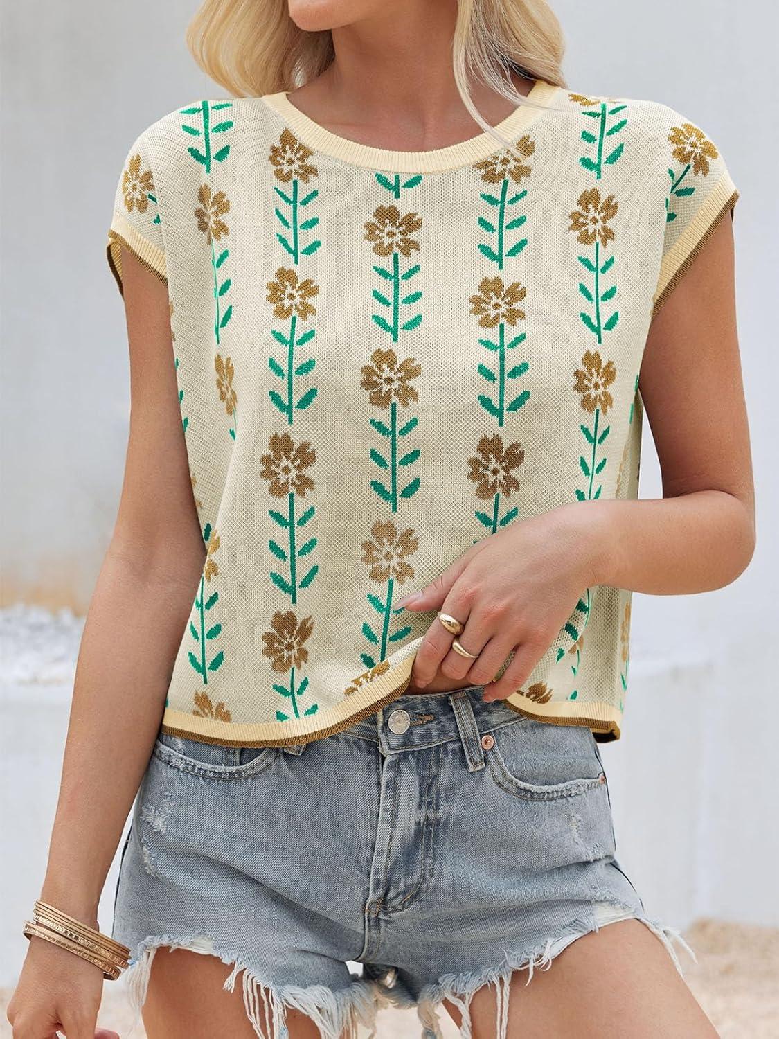 Saodimallsu Womens Cap Sleeve Crop Tops Summer Color Block Going Out Crew Neck Knit Trendy Casual Sweater(Beige-a)