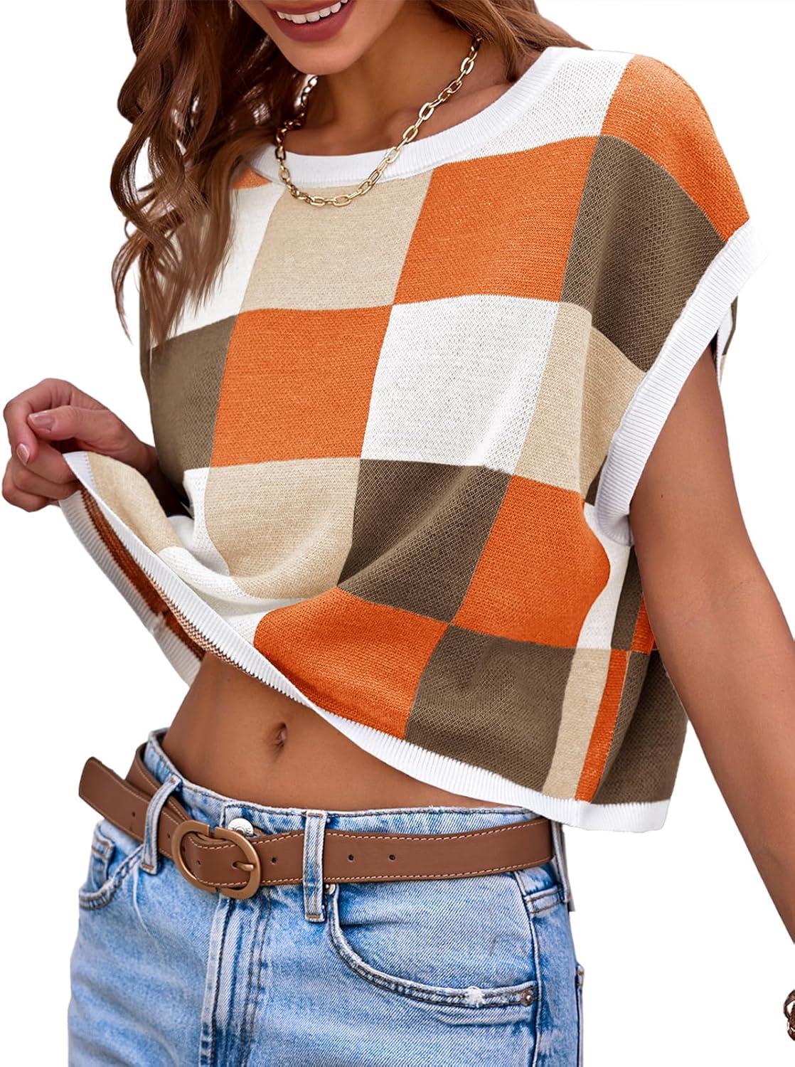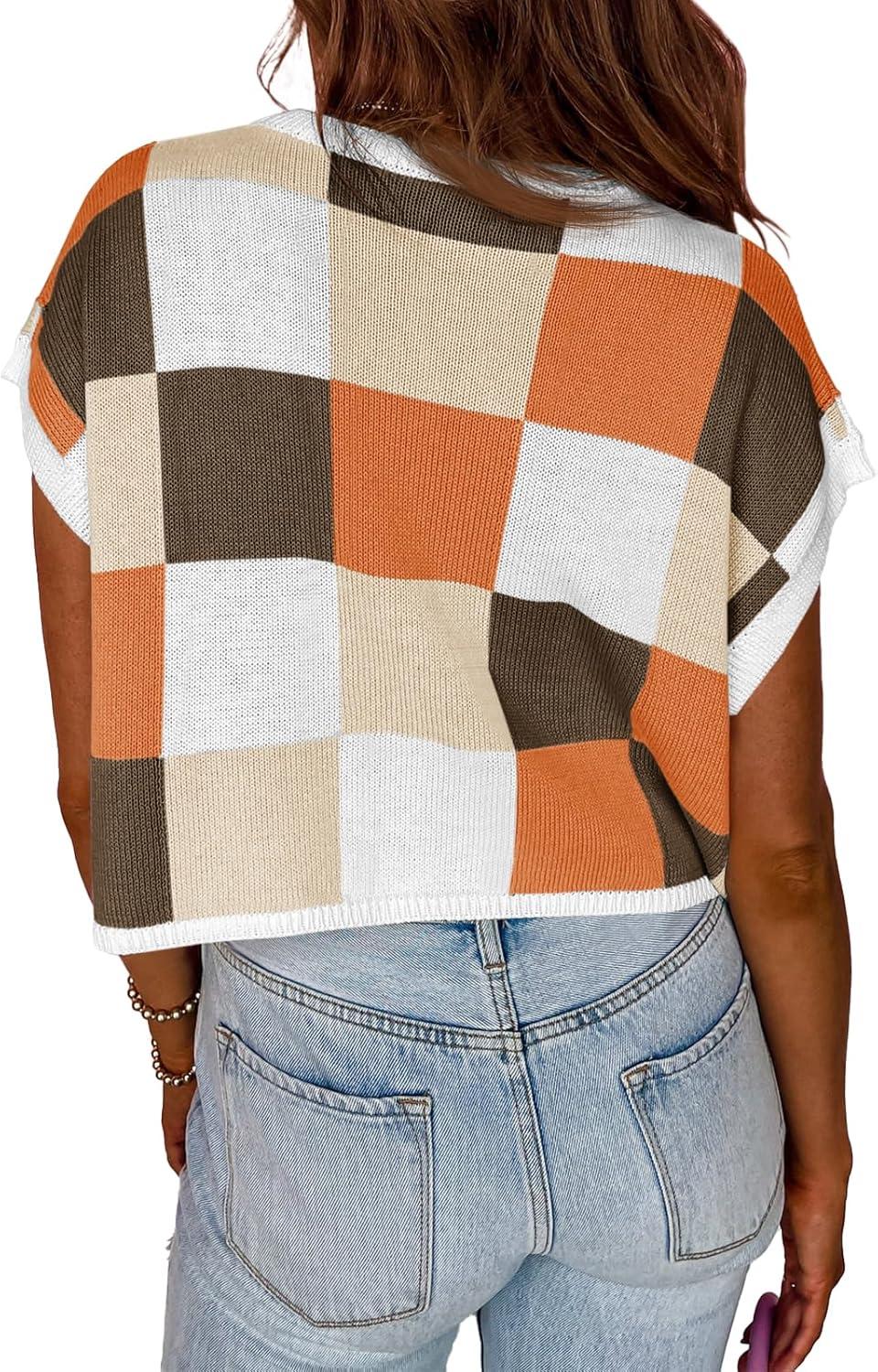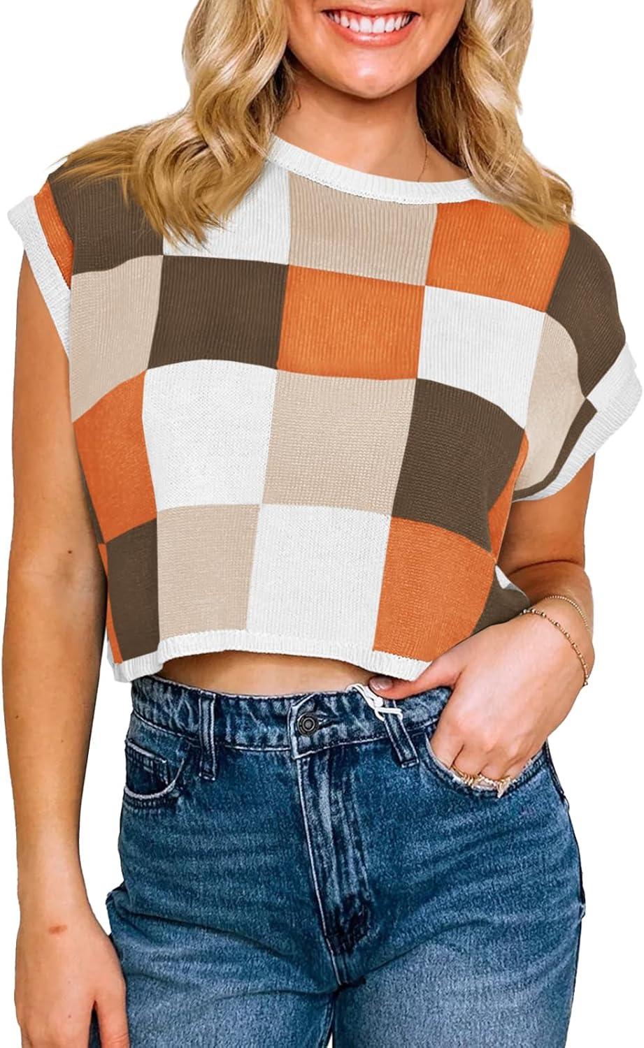 Saodimallsu Womens Cap Sleeve Crop Tops Summer Color Block Going Out Crew Neck Knit Trendy Casual Sweater(Coffee)