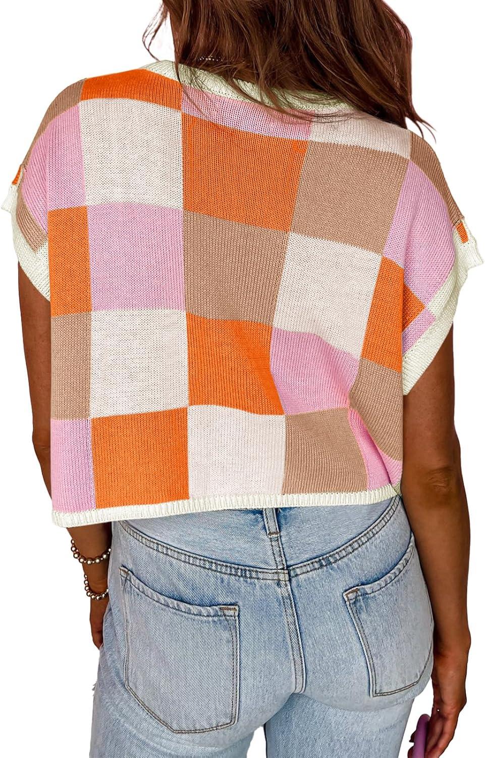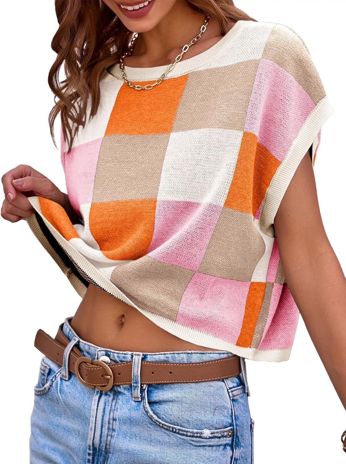 Saodimallsu Womens Cap Sleeve Crop Tops Summer Color Block Going Out Crew Neck Knit Trendy Casual Sweater(Orange)