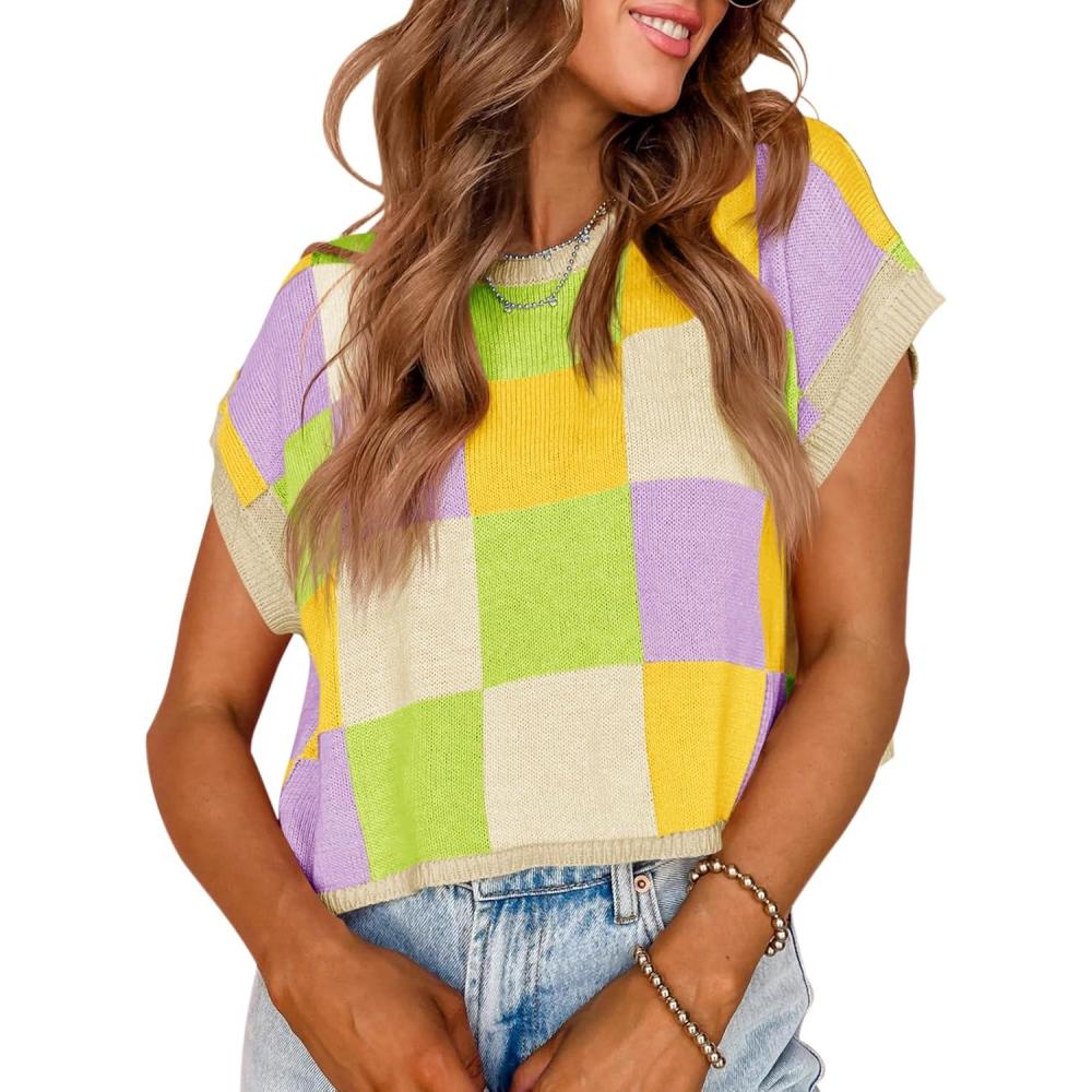 Saodimallsu Womens Cap Sleeve Crop Tops Summer Color Block Going Out Crew Neck Knit Trendy Casual Sweater(Purple&yellow)