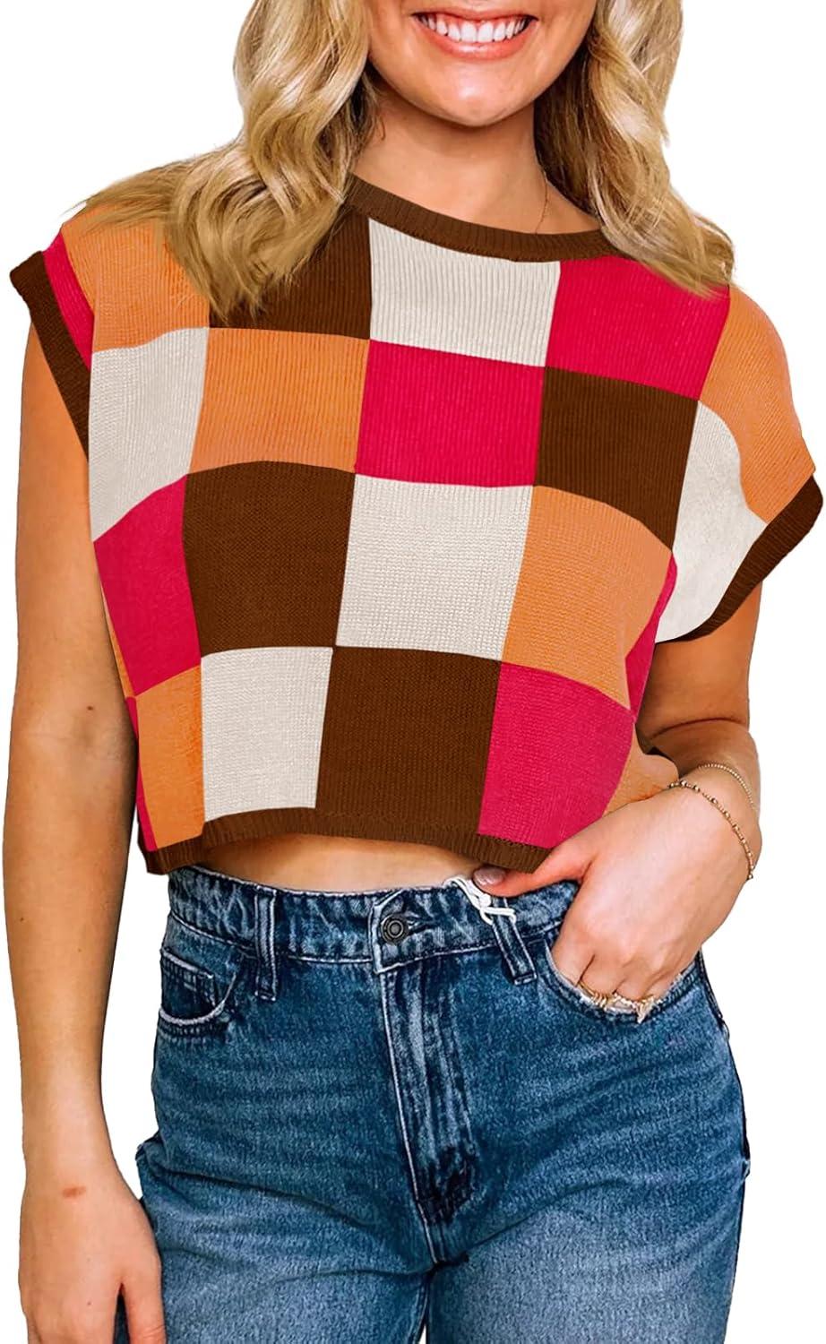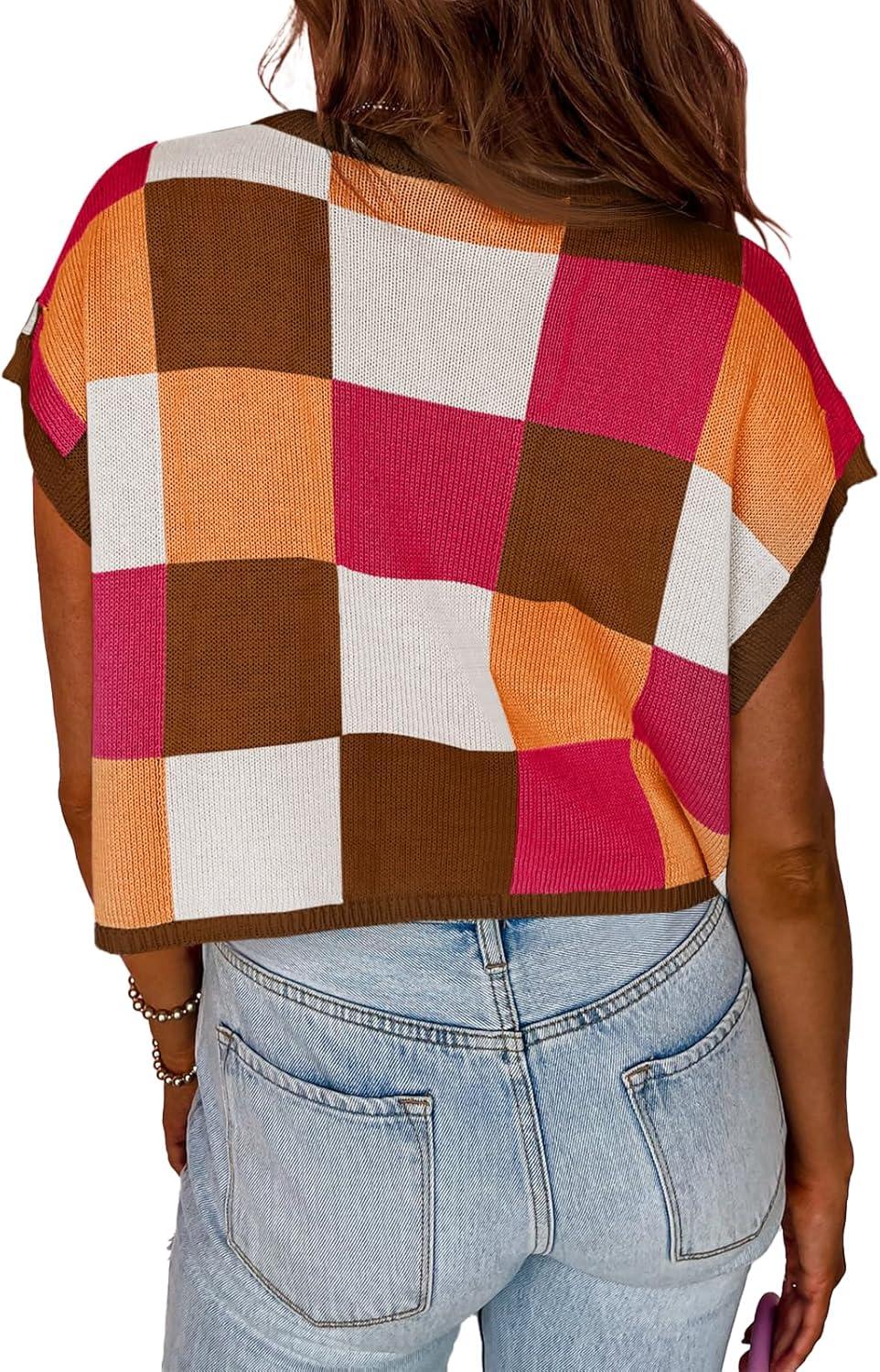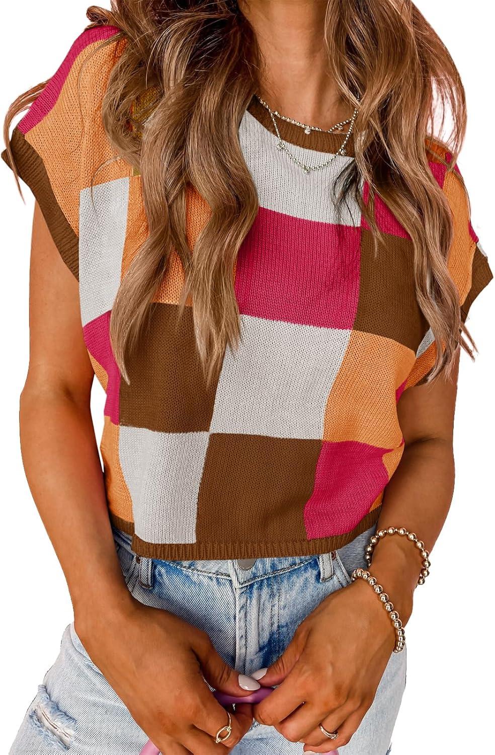 Saodimallsu Womens Cap Sleeve Crop Tops Summer Color Block Going Out Crew Neck Knit Trendy Casual Sweater(Rose Red)