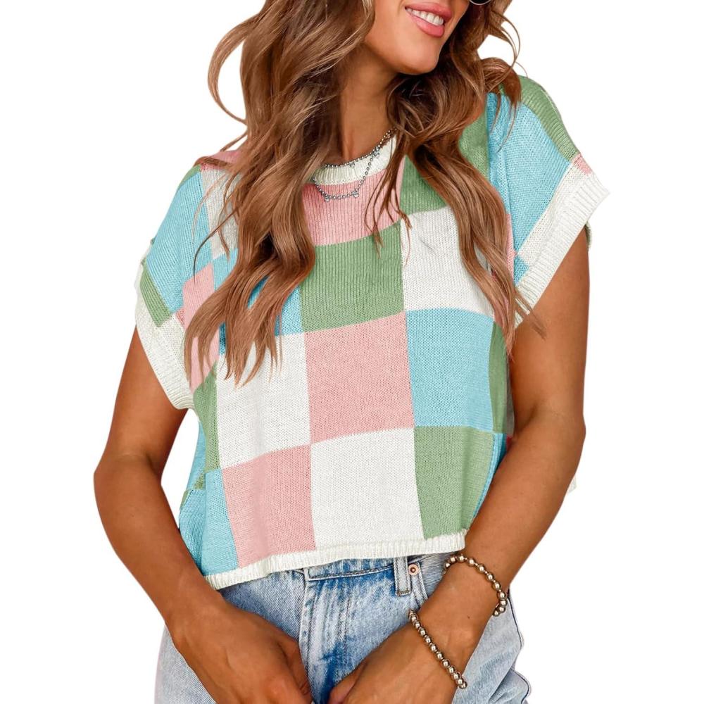 Saodimallsu Womens Cap Sleeve Crop Tops Summer Color Block Going Out Crew Neck Knit Trendy Casual Sweater(Sky Blue)