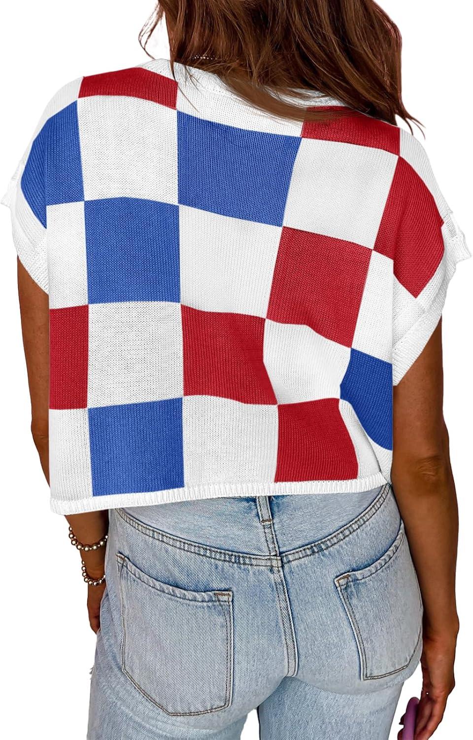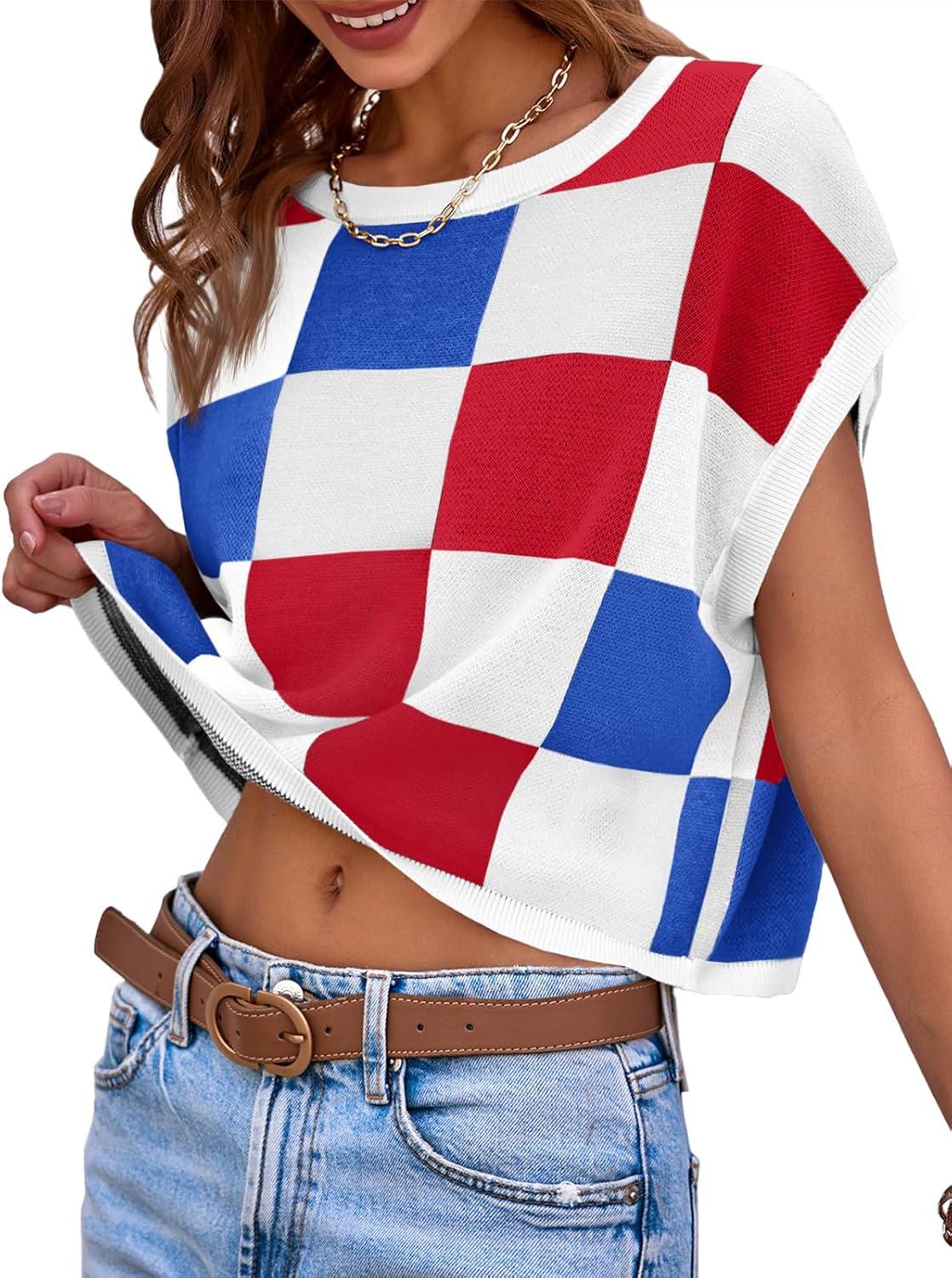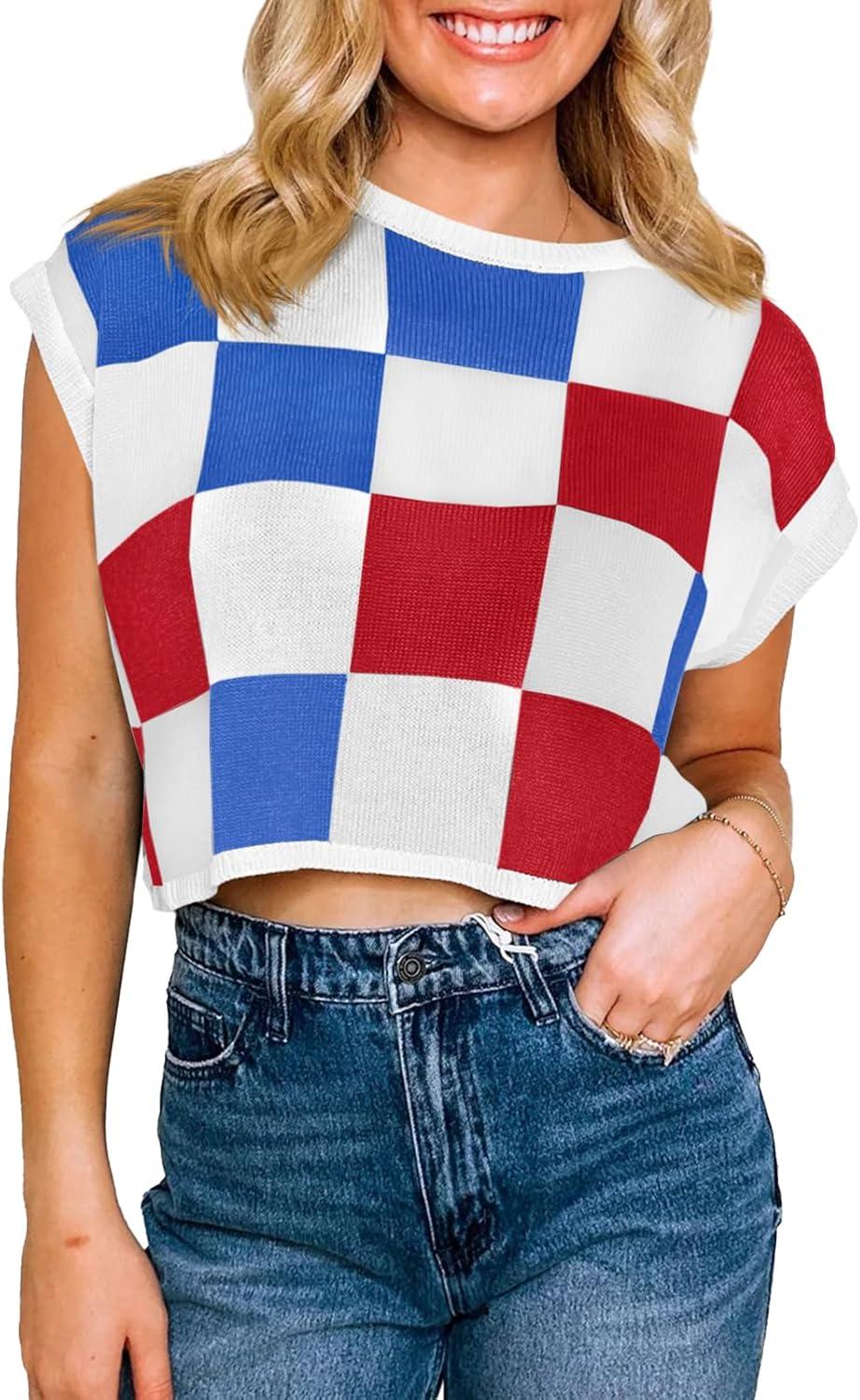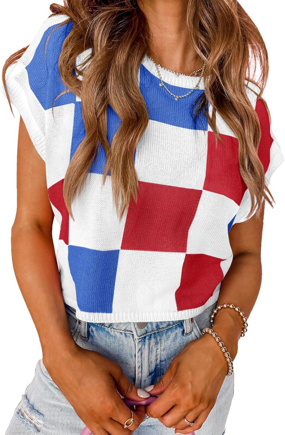 Saodimallsu Womens Cap Sleeve Crop Tops Summer Color Block Going Out Crew Neck Knit Trendy Casual Sweater(White&blue)