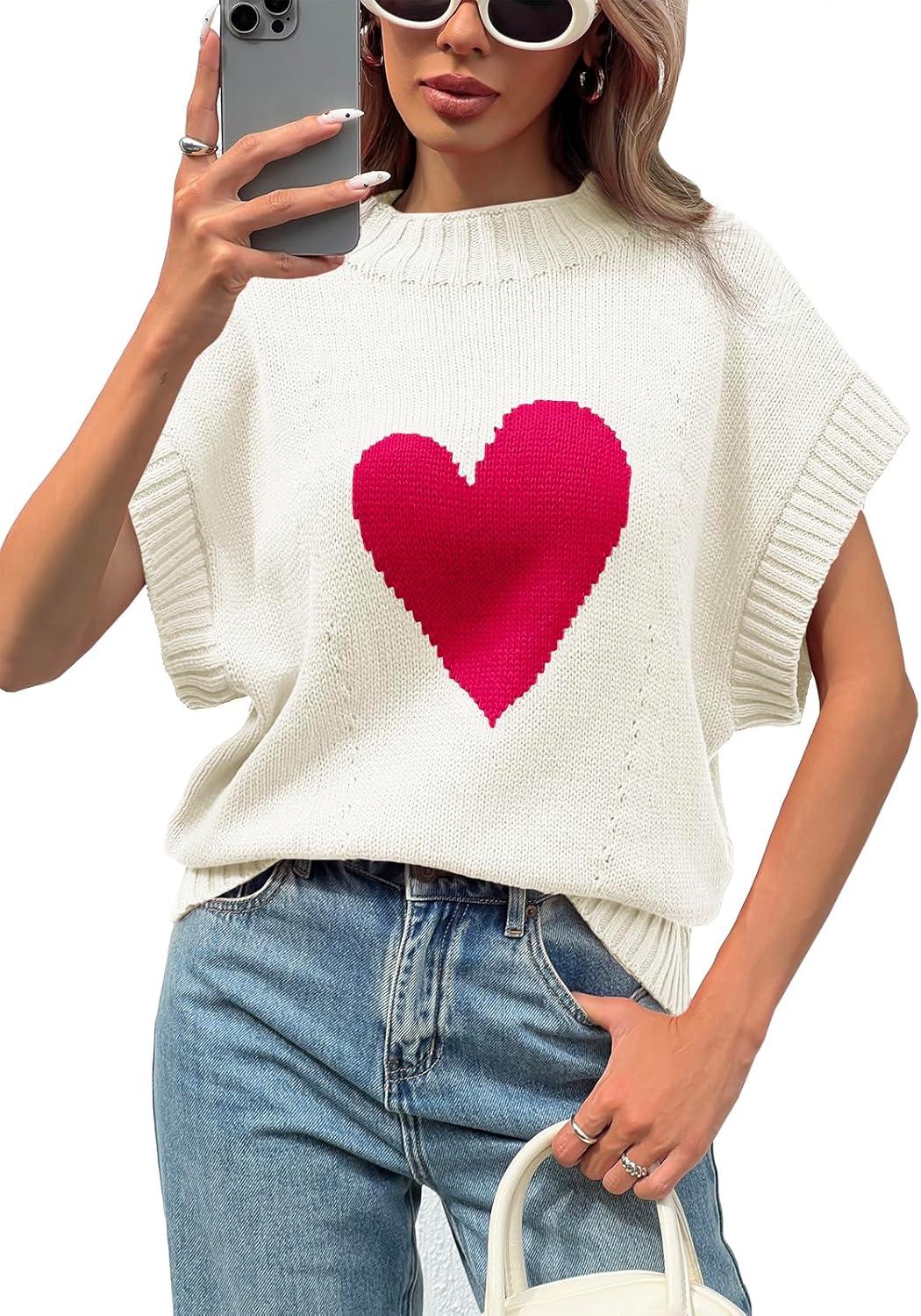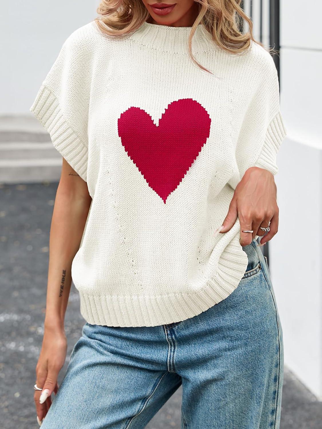 Saodimallsu Womens Cap Sleeve Cropped Sweater Mock Neck Cute Heart Loose Valentine Knit Tank Tops(White)