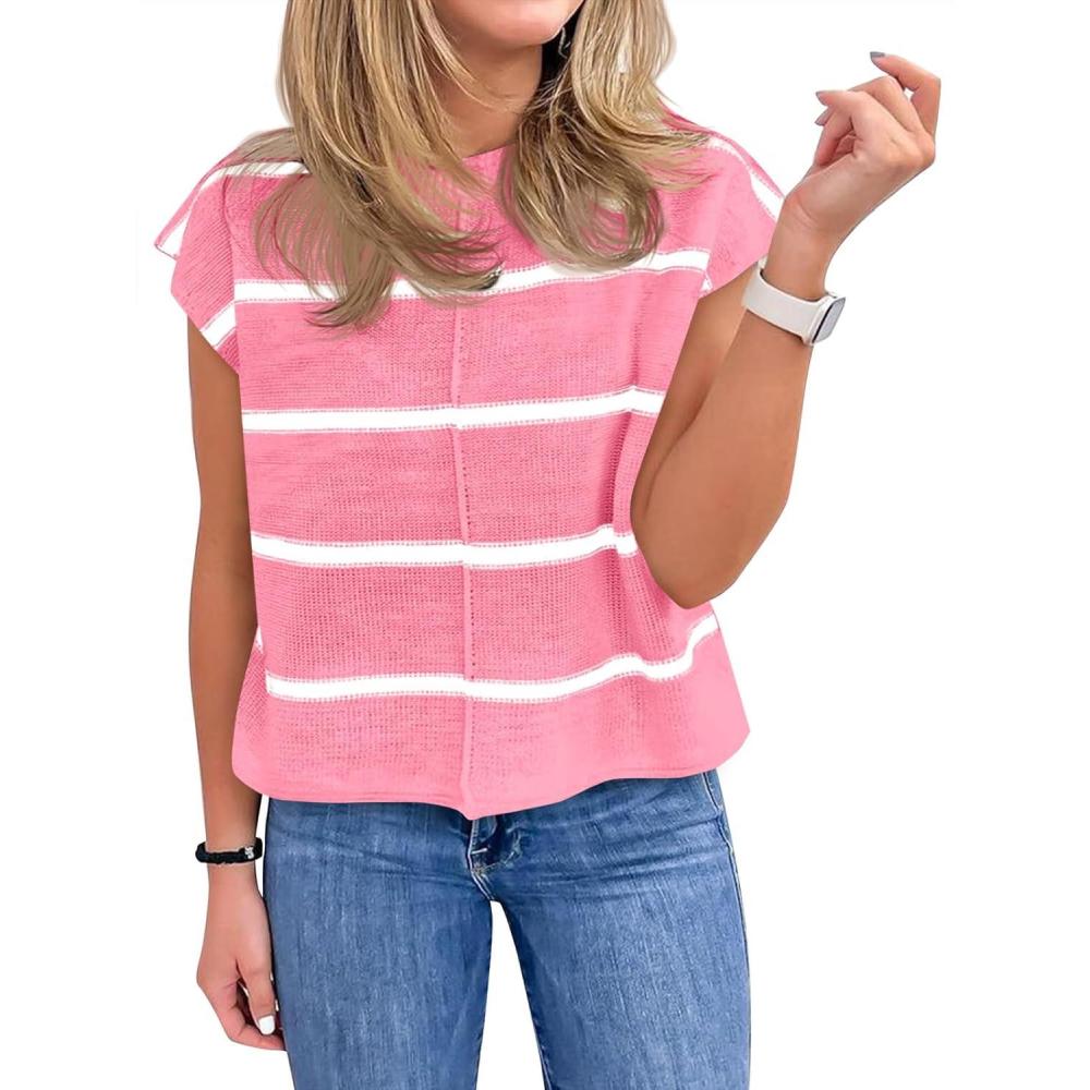 Saodimallsu Womens Cap Sleeve Tank Tops Striped Crew Neck Casual Loose Fit Spring Summer Pullover Knit Sweater Vest(Pink)